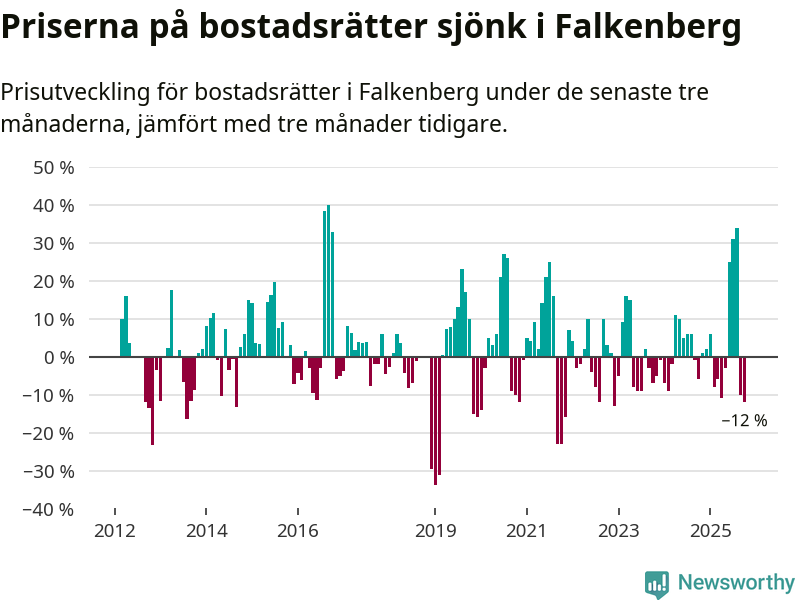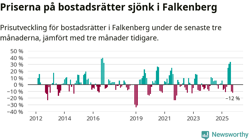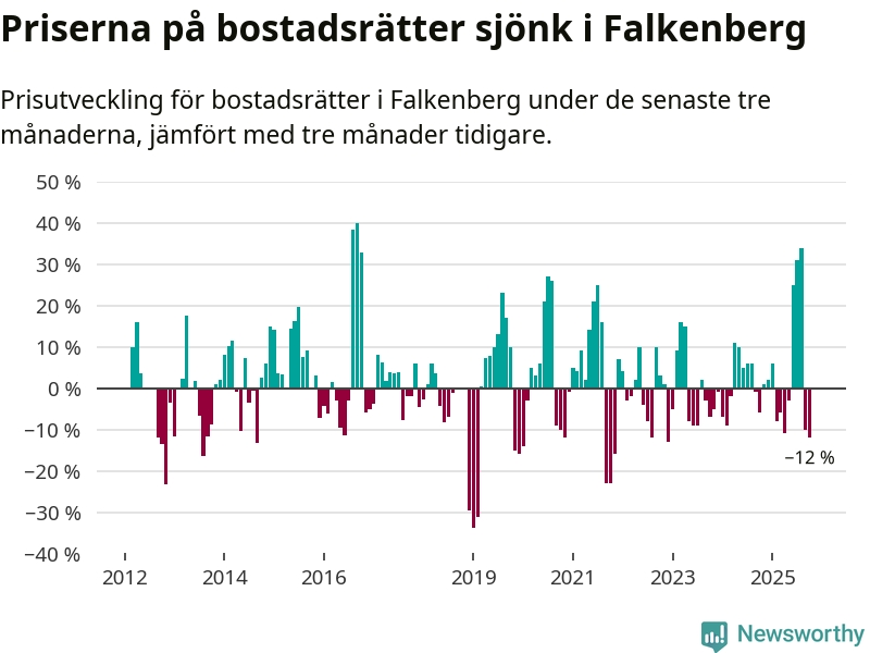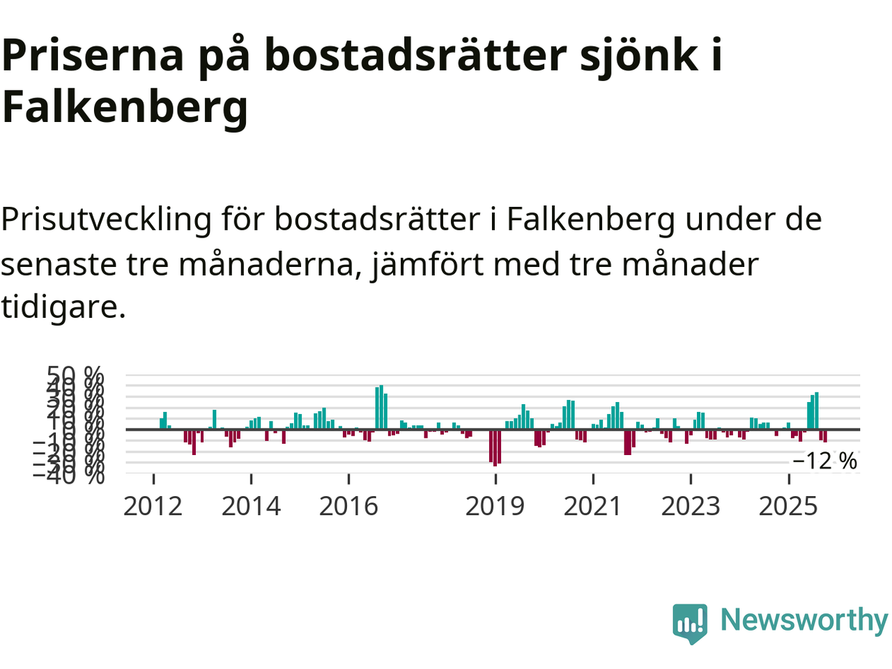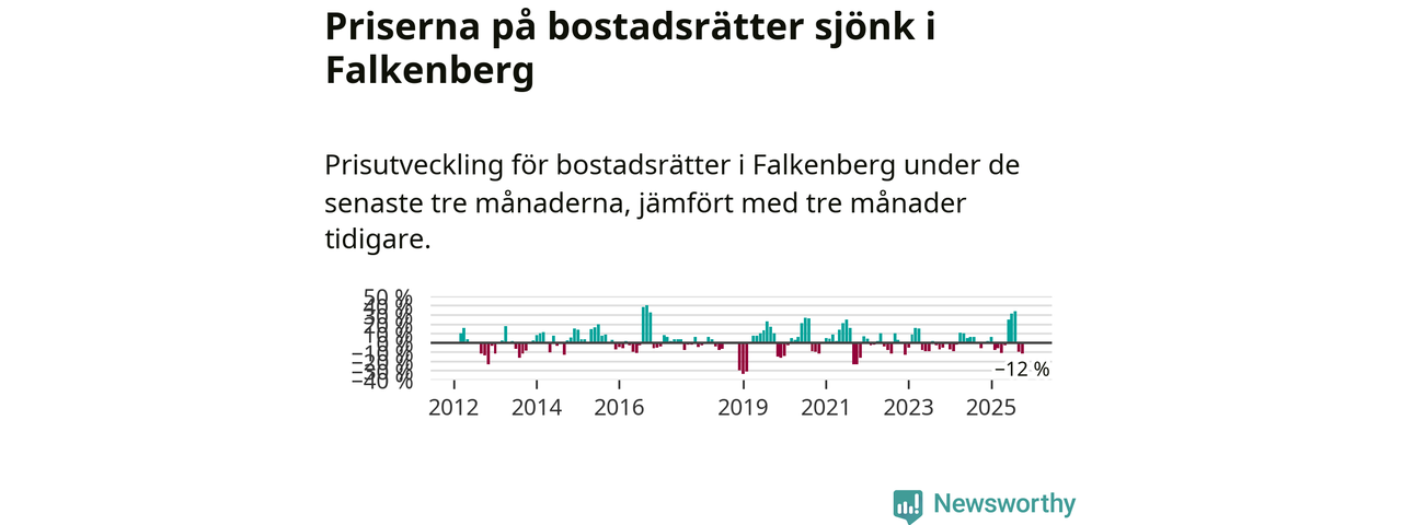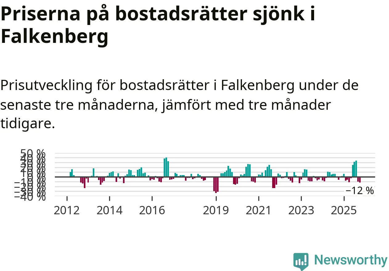 Priserna på bostadsrätter har gått ner i Falkenbergs kommun. Medelpriset på försäljningarna under de senaste tre månaderna visar på en nedgång med 12 procent.