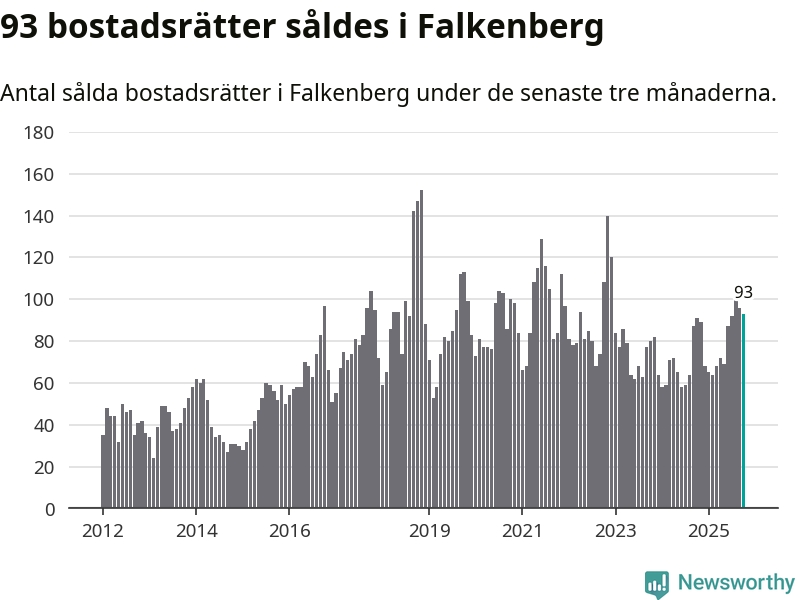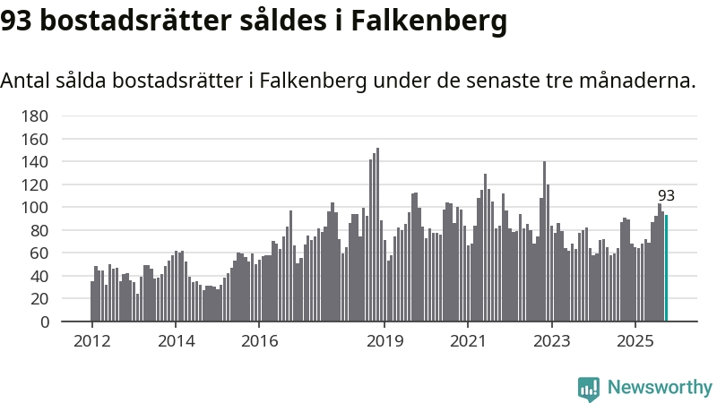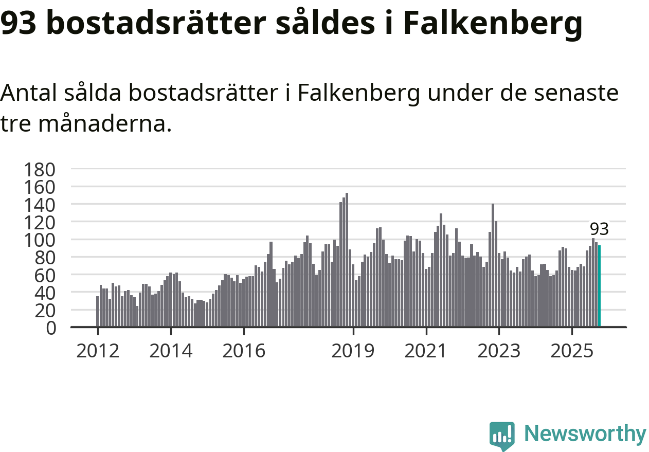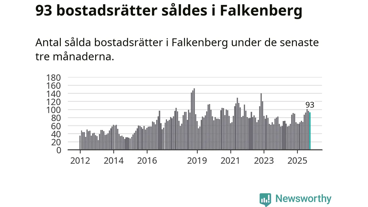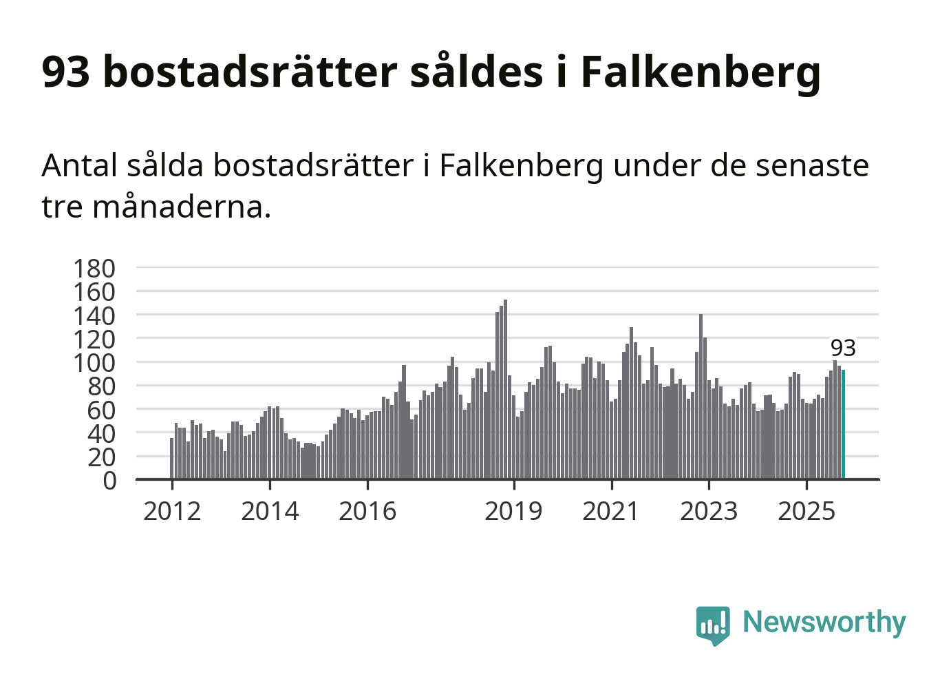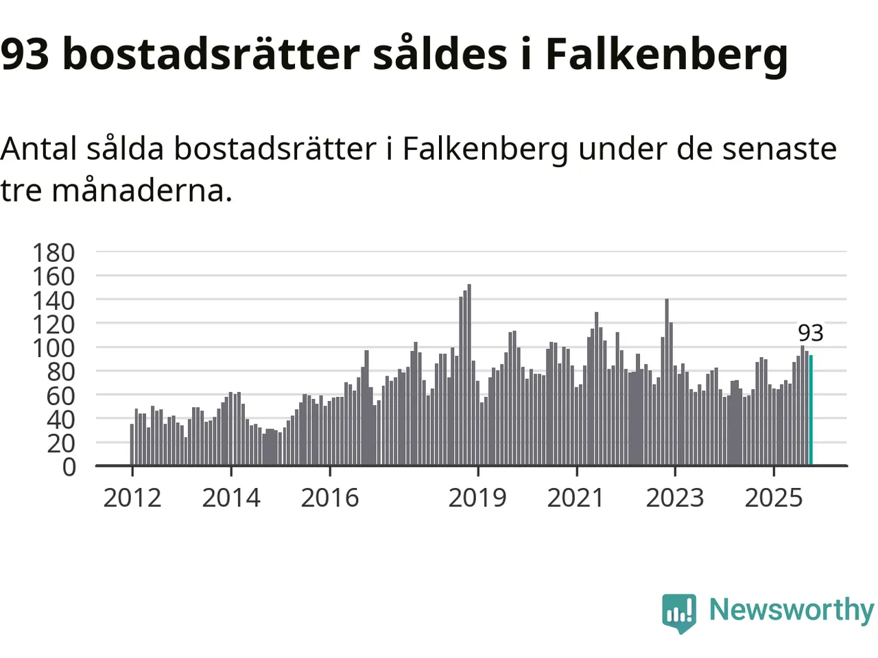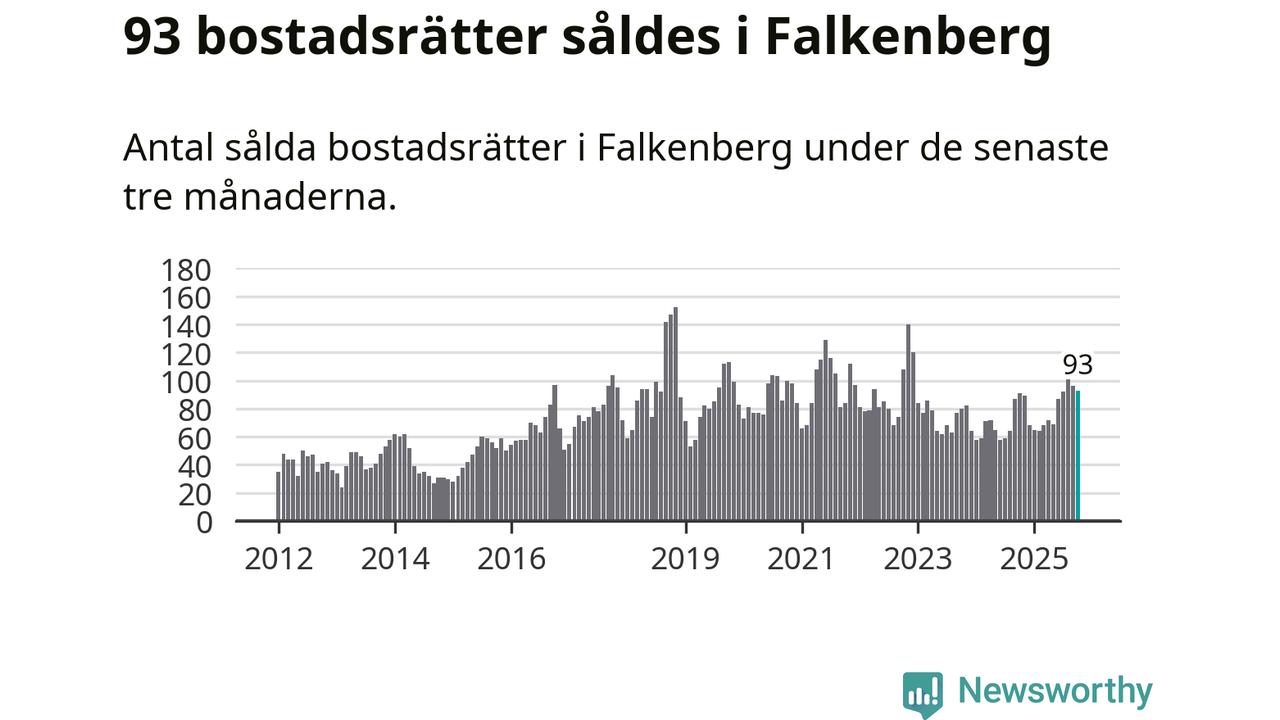Sammanlagt såldes 93 bostadsrätter i Falkenbergs kommun mellan augusti och oktober till ett genomsnittligt pris på 1,9 miljoner kronor. I fjol gjordes 91 affärer vid den här tiden på året.