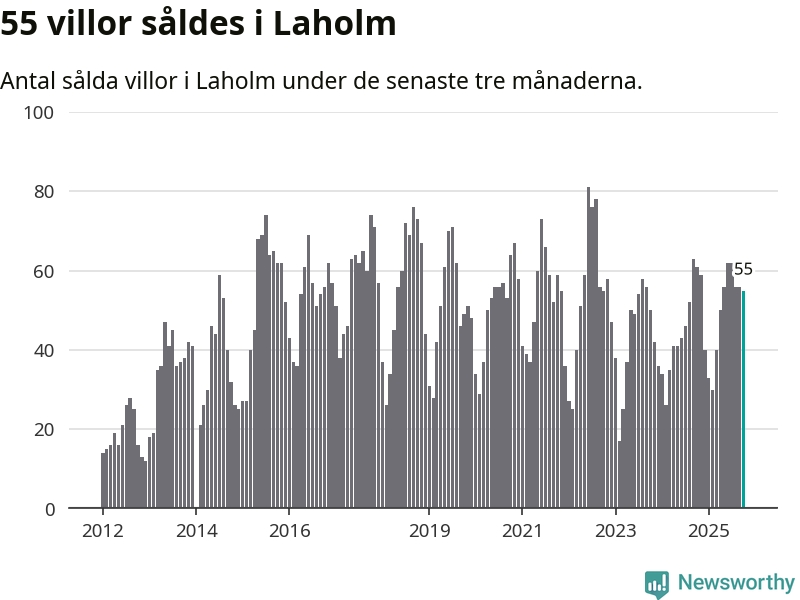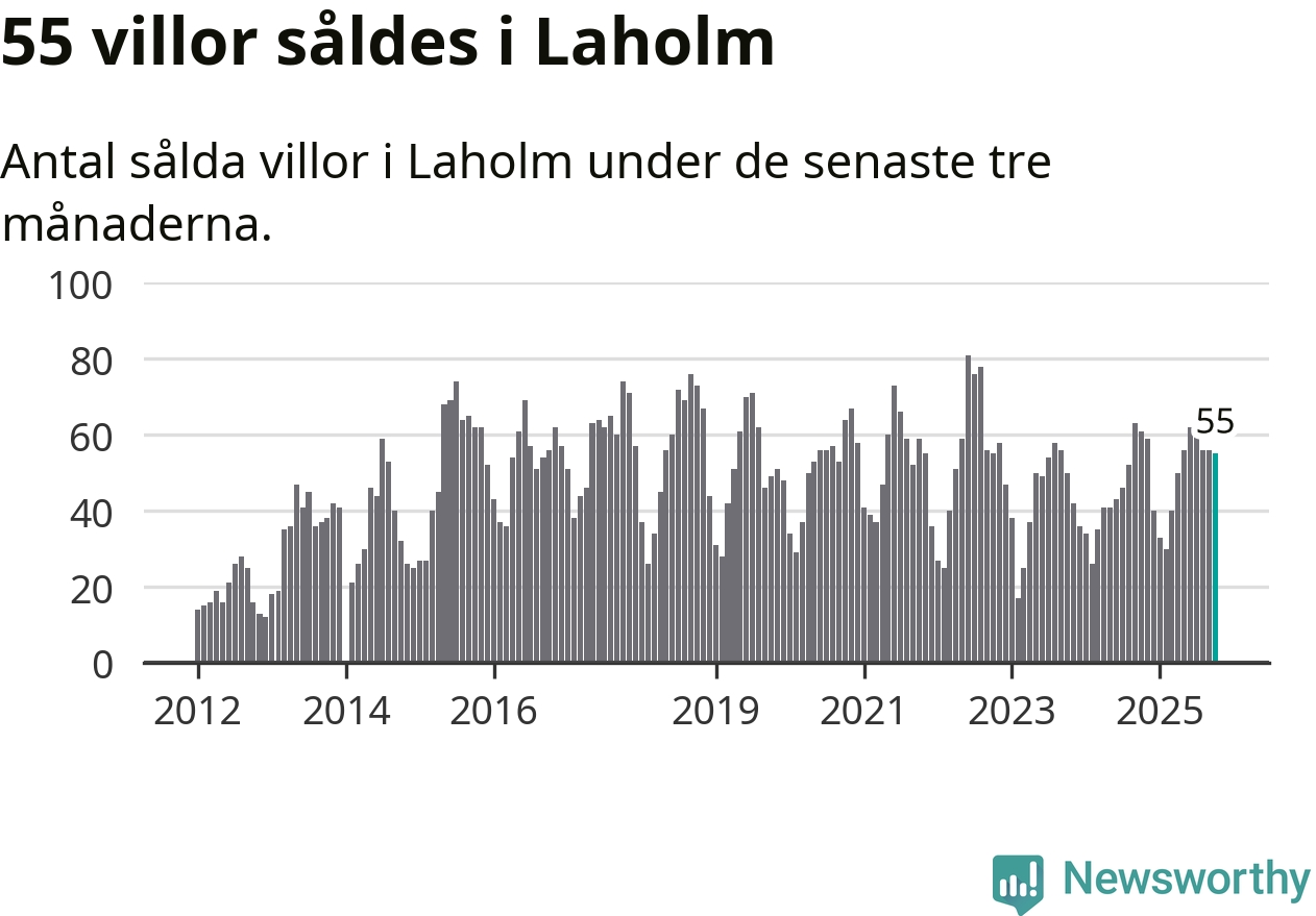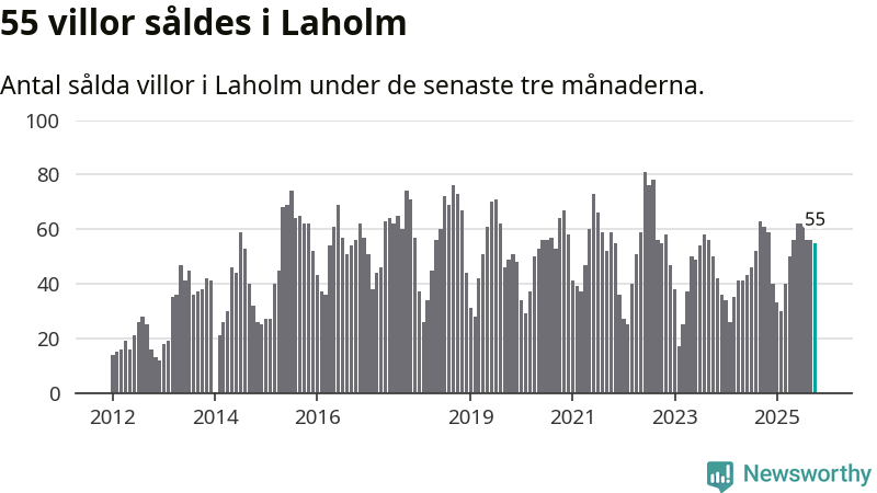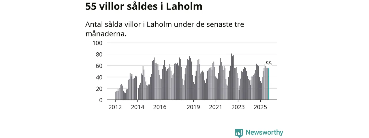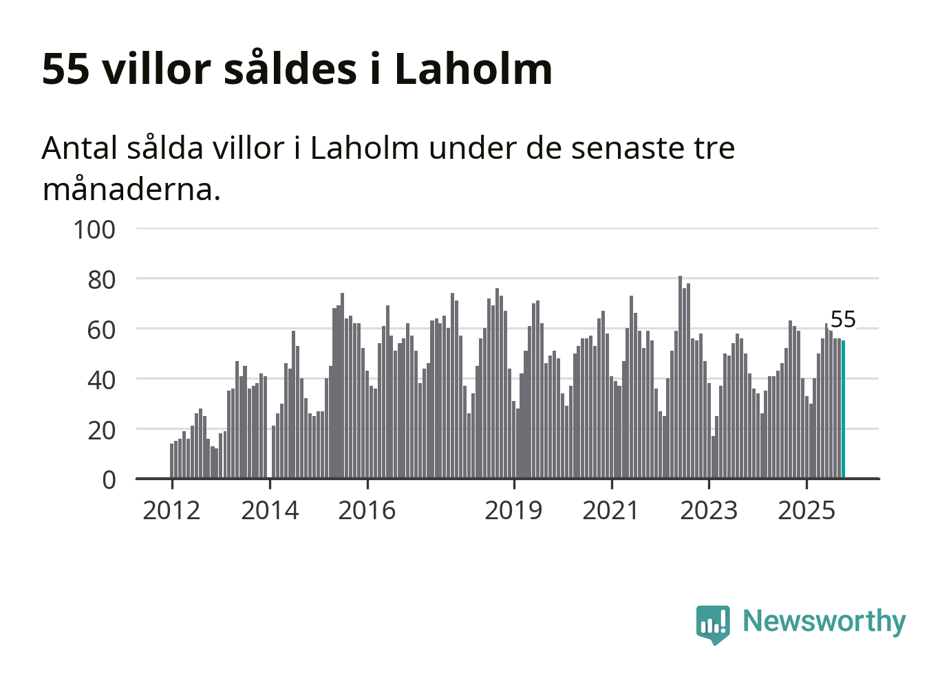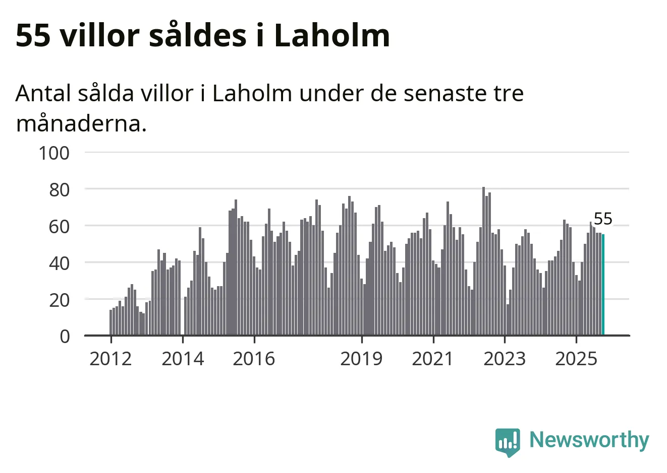 Sammanlagt såldes 55 villor i Laholms kommun mellan augusti och oktober till ett genomsnittligt pris på 3,0 miljoner kronor. I fjol gjordes 61 affärer vid den här tiden på året.