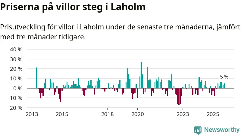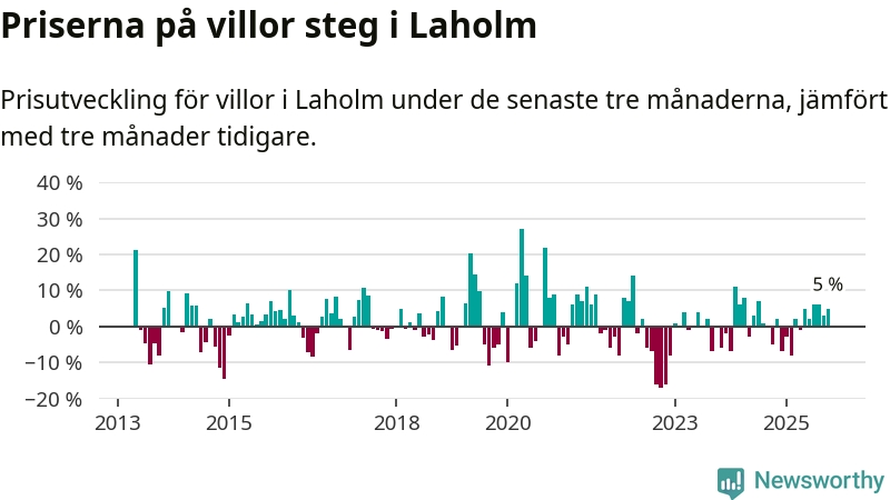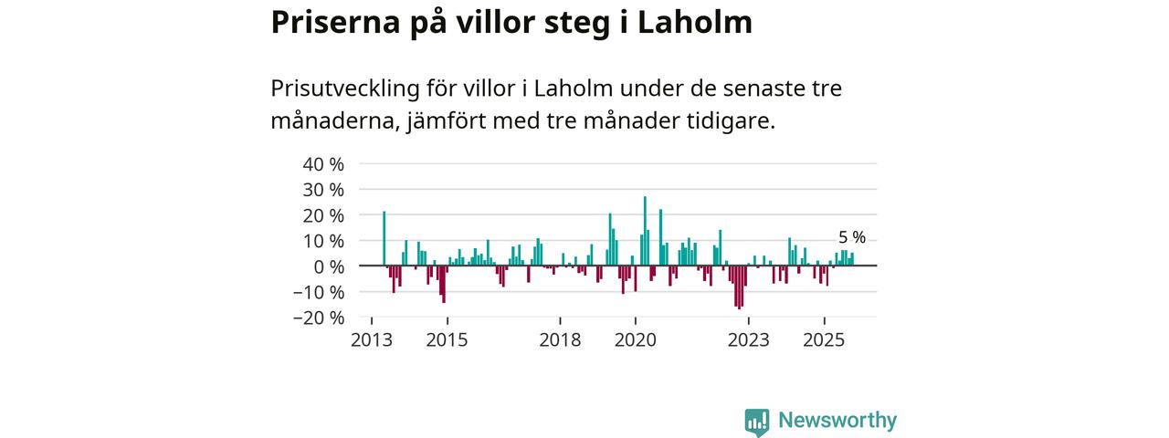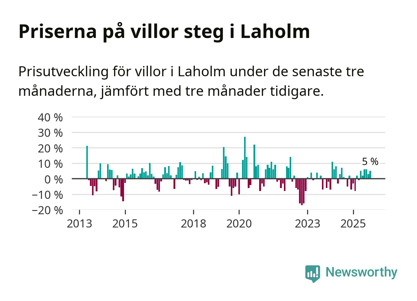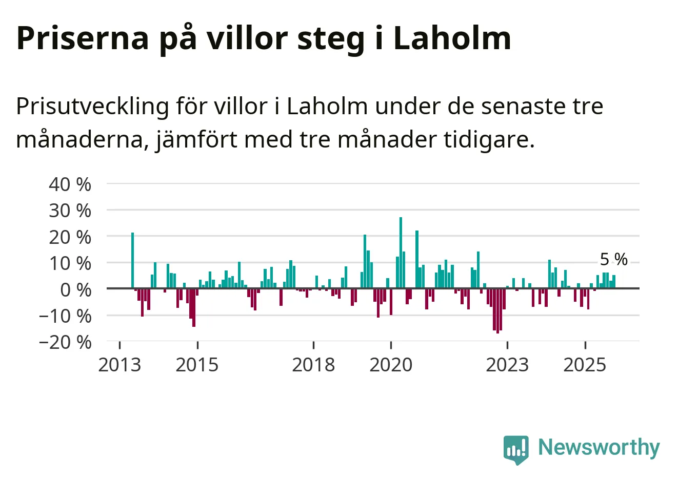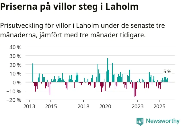 Villapriserna har gått upp i Laholms kommun. Medelpriset på försäljningarna under de senaste tre månaderna visar på en uppgång med 5 procent.