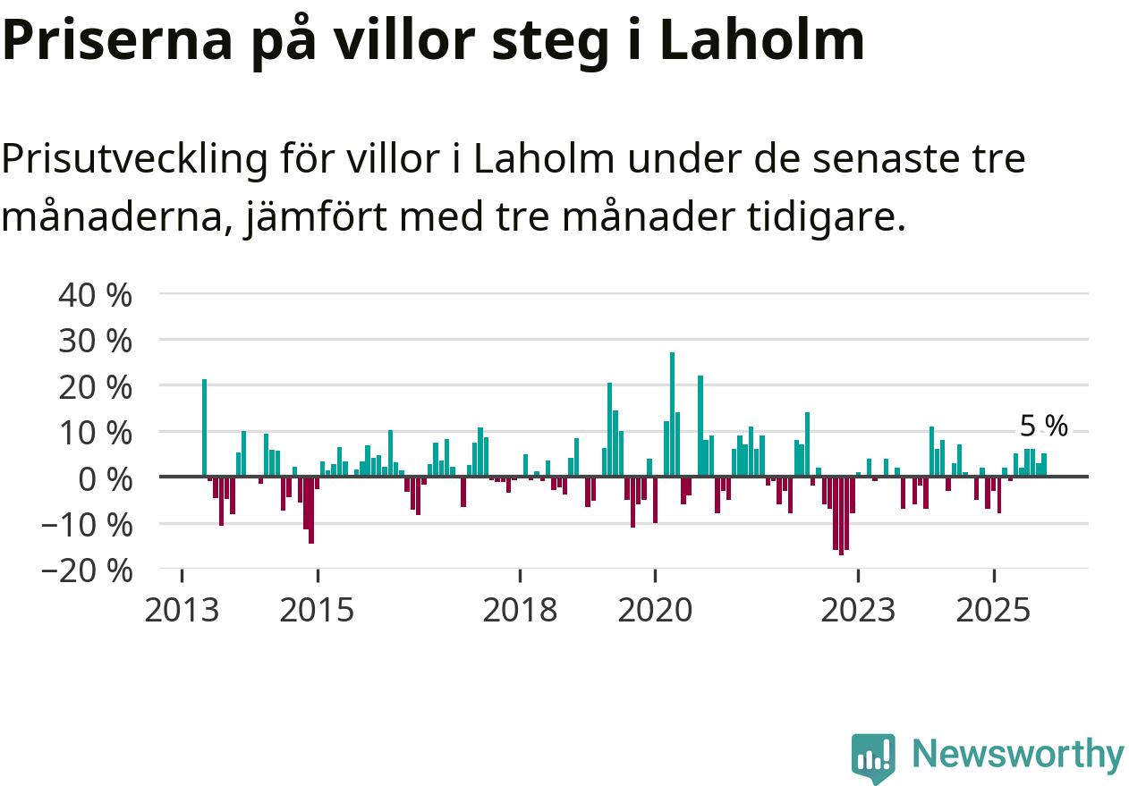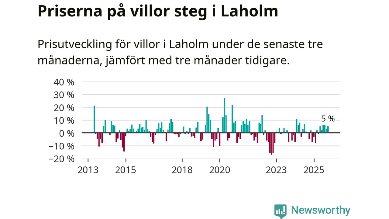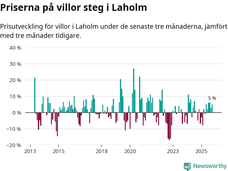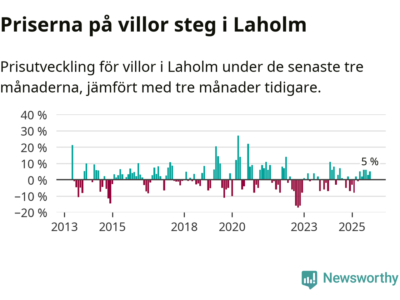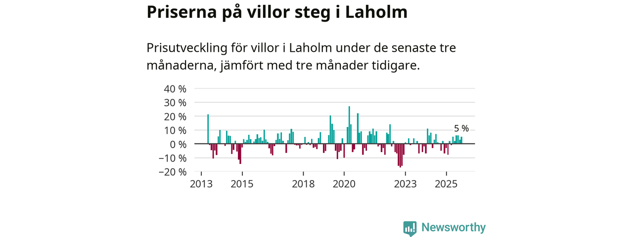 Villapriserna har gått upp i Laholms kommun. Medelpriset på försäljningarna under de senaste tre månaderna visar på en uppgång med 5 procent.