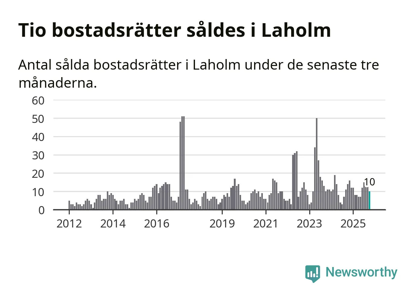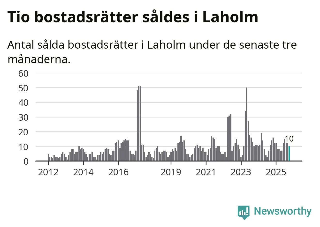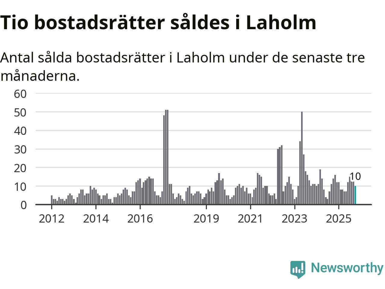 Mellan augusti och oktober gjordes sammanlagt tio affärer med bostadsrätter i Laholms kommun. Det kan jämföras med 14 vid motsvarande tid i fjol.