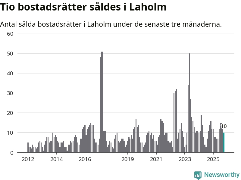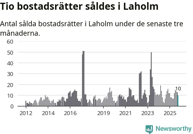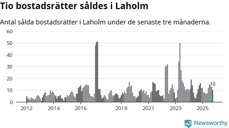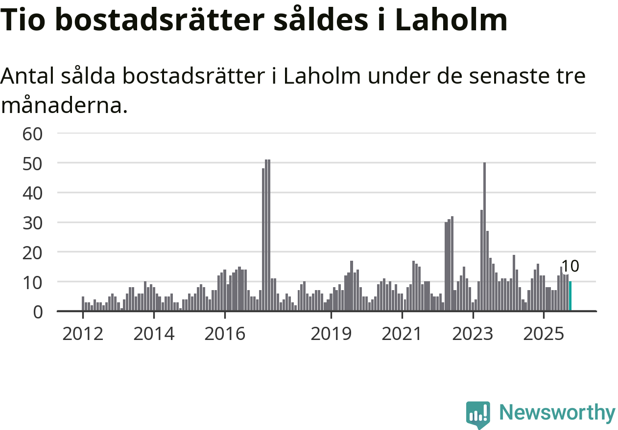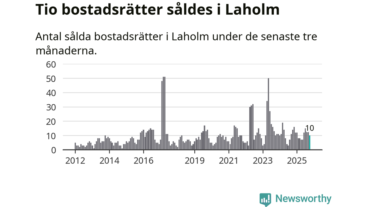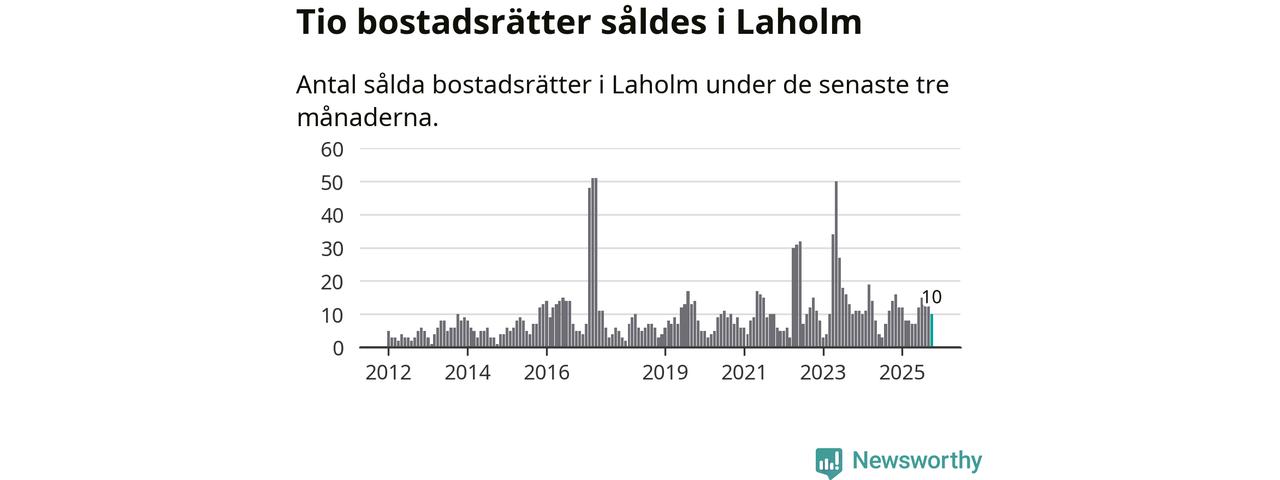 Mellan augusti och oktober gjordes sammanlagt tio affärer med bostadsrätter i Laholms kommun. Det kan jämföras med 14 vid motsvarande tid i fjol.