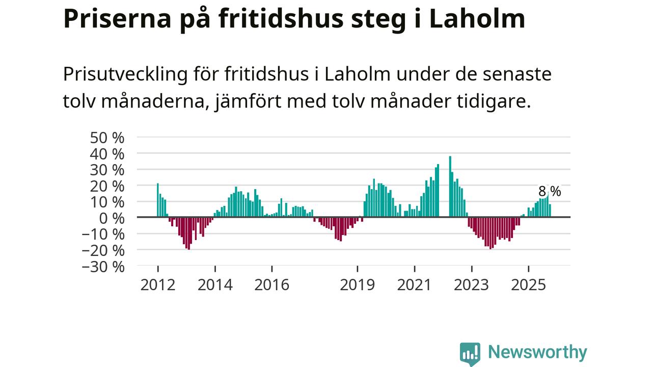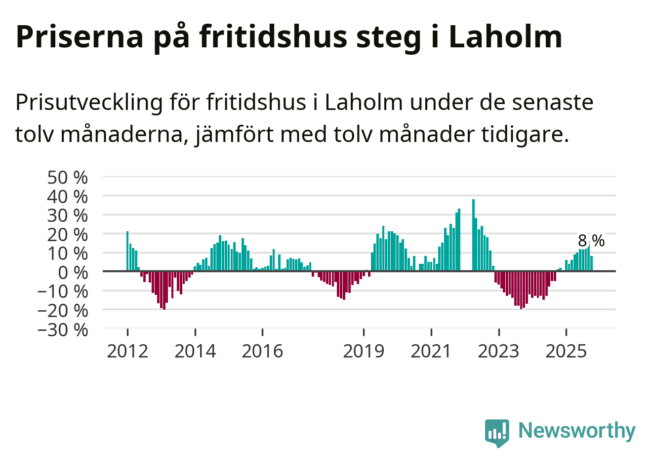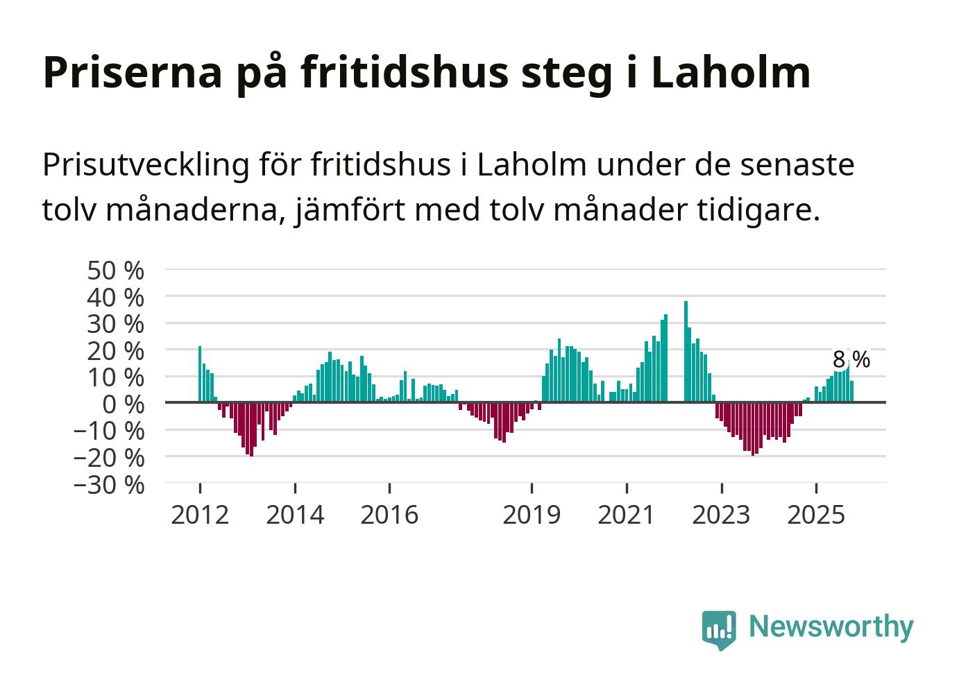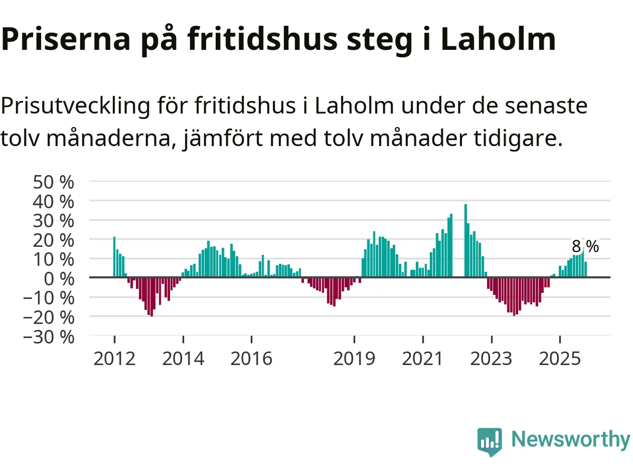 Priserna på fritidshus har gått upp i Laholms kommun. Medelpriset på försäljningarna under de senaste tolv månaderna visar på en uppgång med 8 procent.