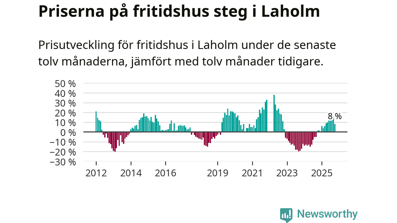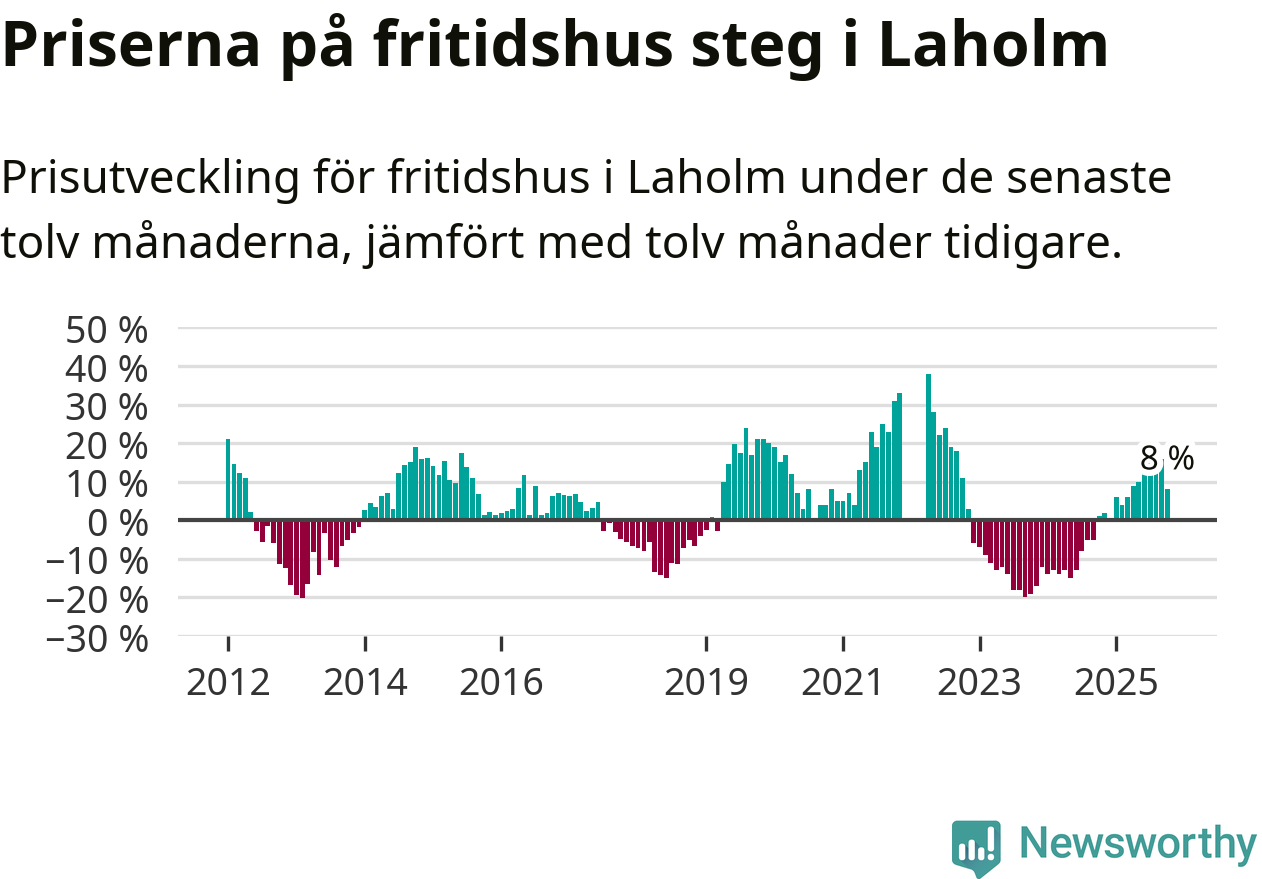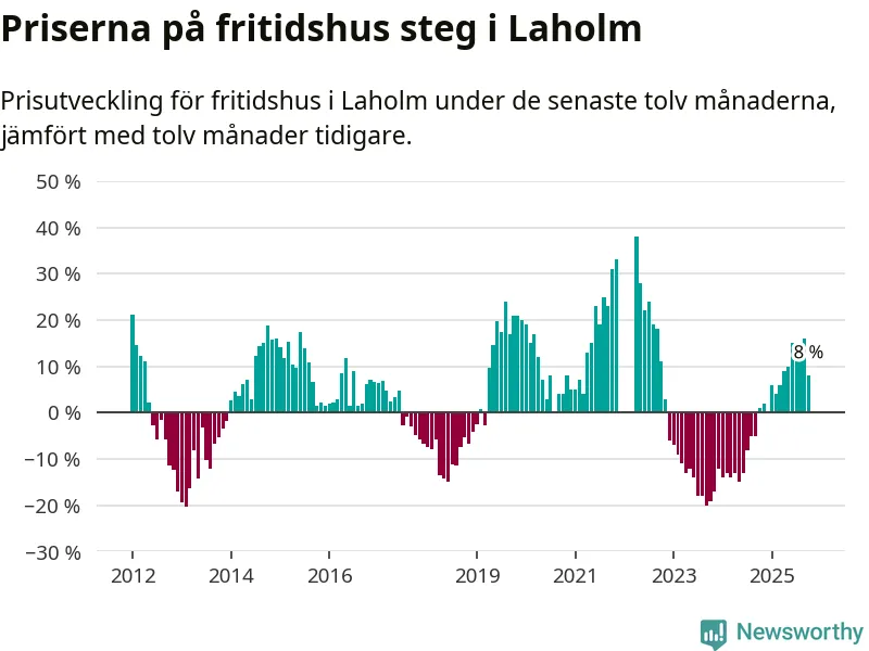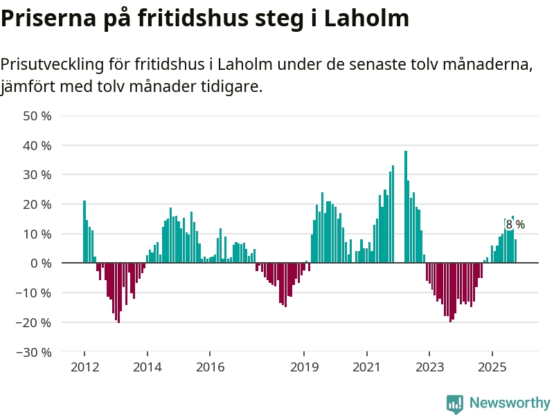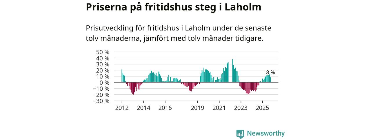 Priserna på fritidshus har gått upp i Laholms kommun. Medelpriset på försäljningarna under de senaste tolv månaderna visar på en uppgång med 8 procent.