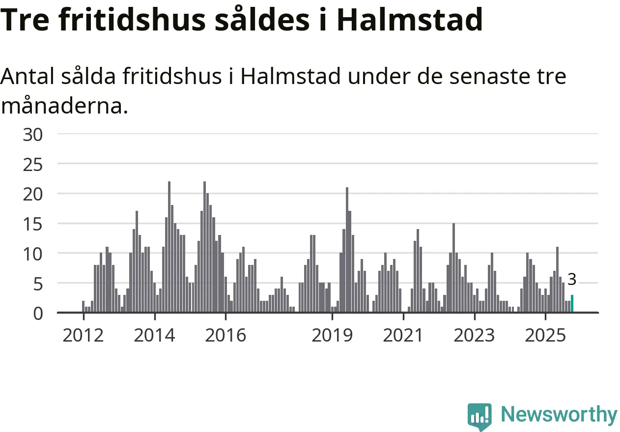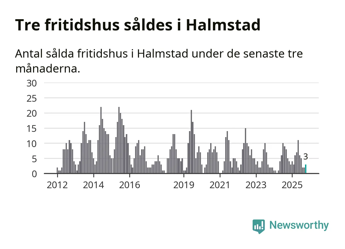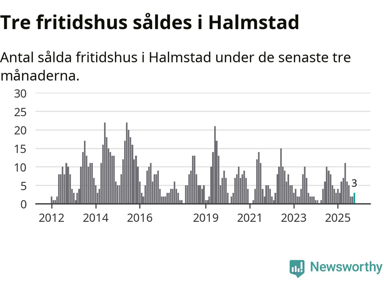 Mellan augusti och oktober gjordes sammanlagt tre affärer med fritidshus i Halmstads kommun. Det kan jämföras med fem vid motsvarande tid i fjol.