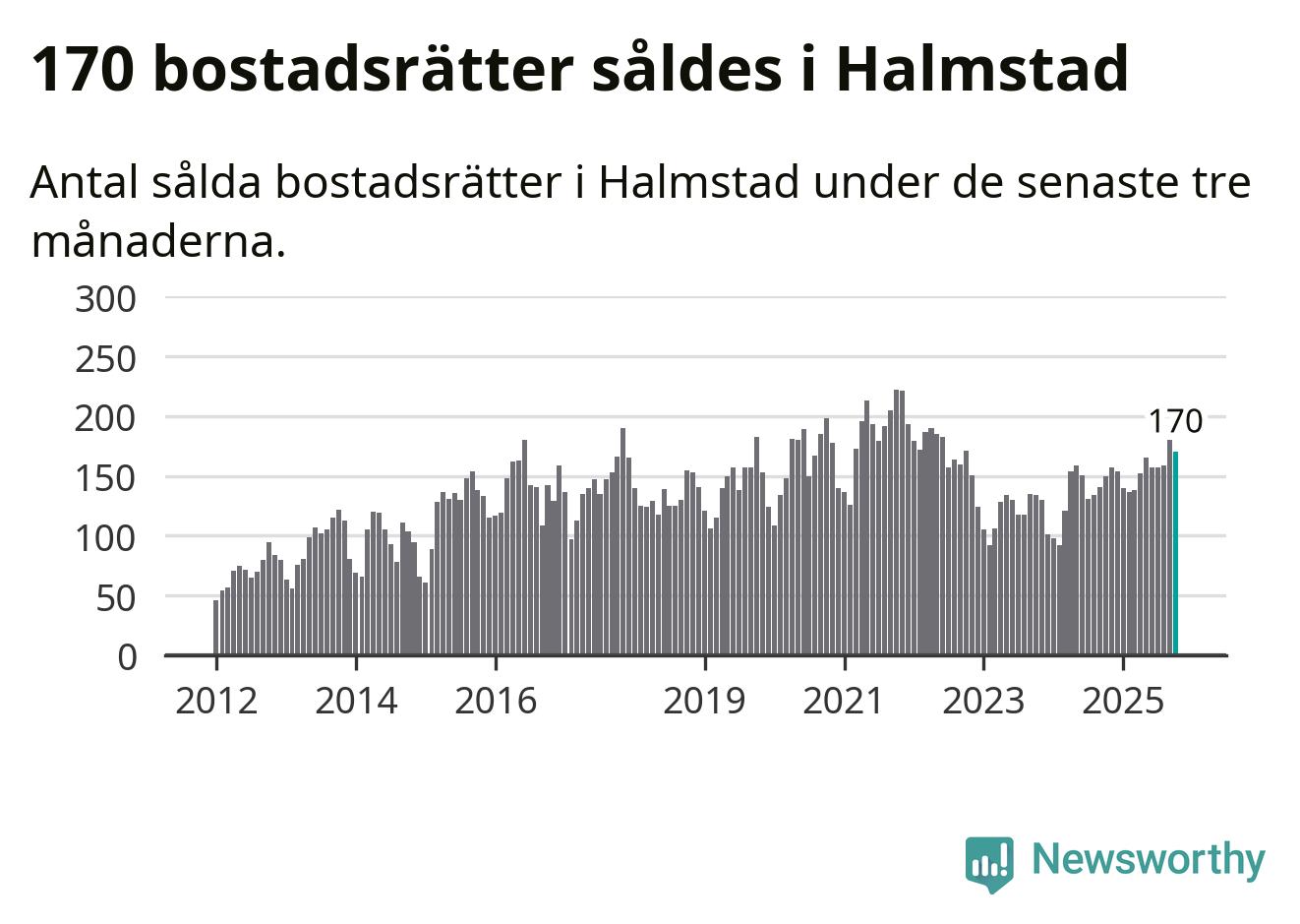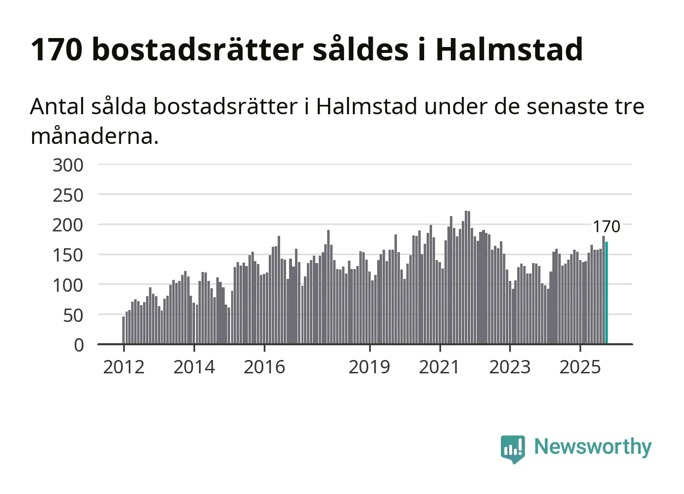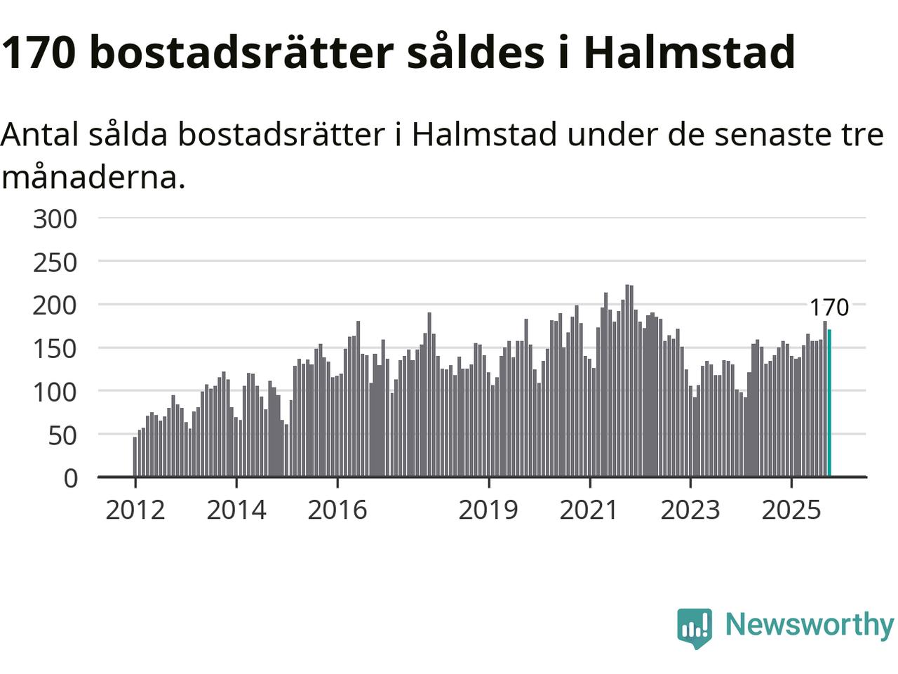 Sammanlagt såldes 170 bostadsrätter i Halmstads kommun mellan augusti och oktober till ett genomsnittligt pris på 2,2 miljoner kronor. I fjol gjordes 150 affärer vid den här tiden på året.