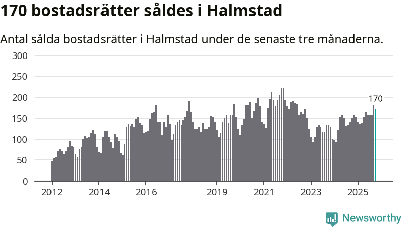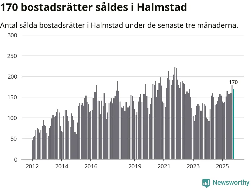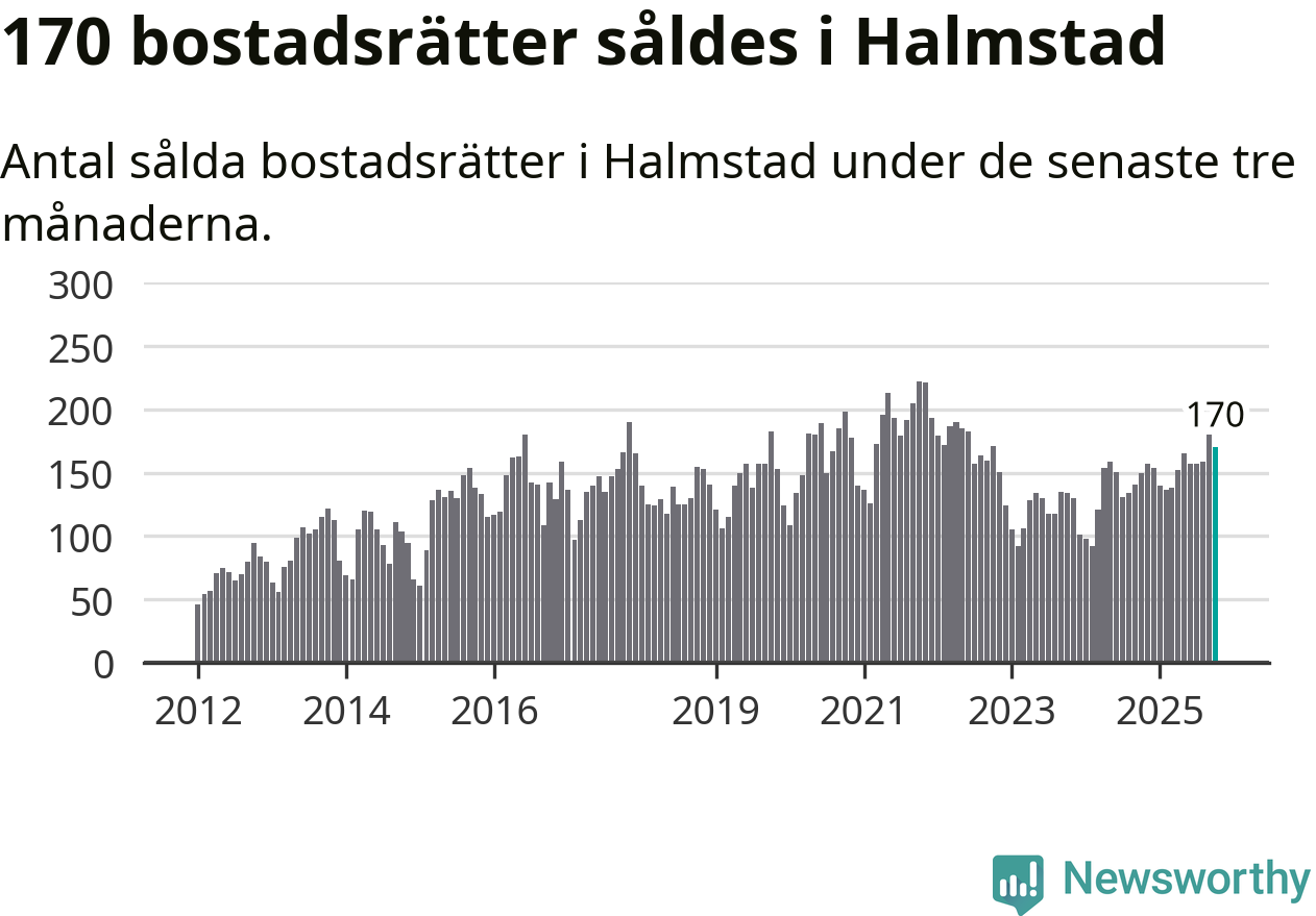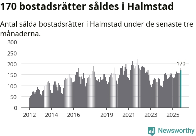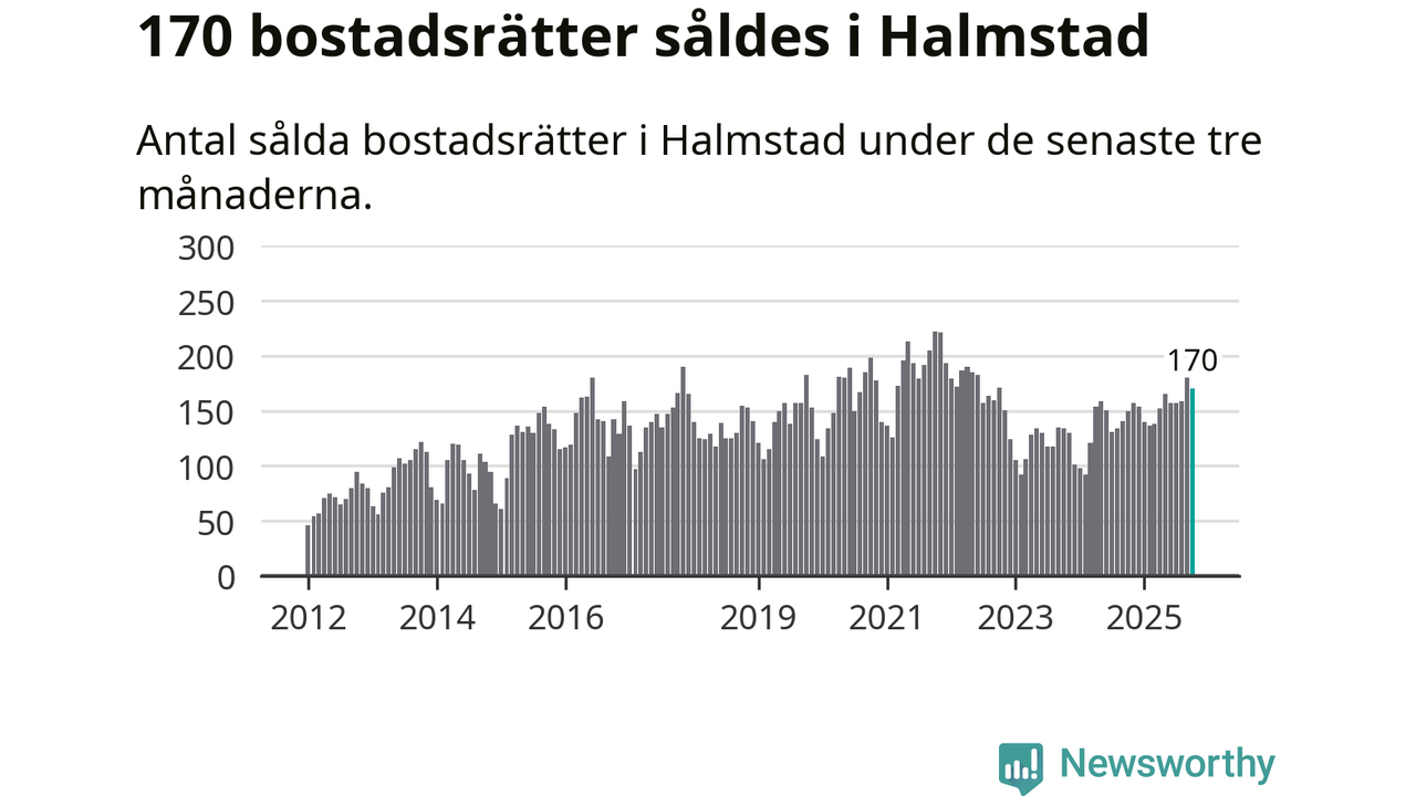 Sammanlagt såldes 170 bostadsrätter i Halmstads kommun mellan augusti och oktober till ett genomsnittligt pris på 2,2 miljoner kronor. I fjol gjordes 150 affärer vid den här tiden på året.