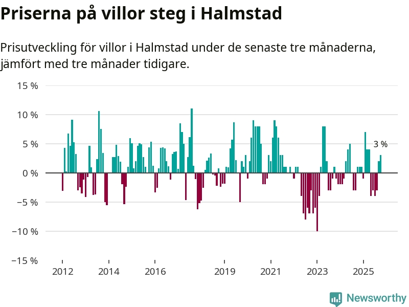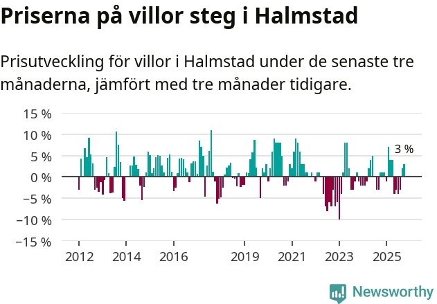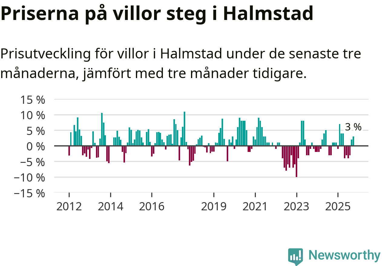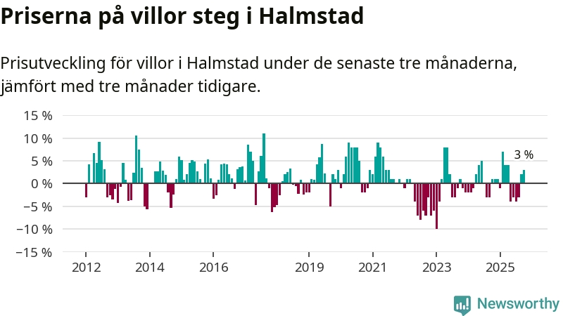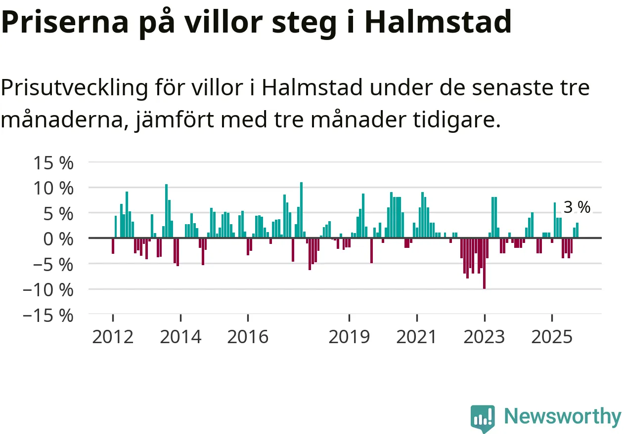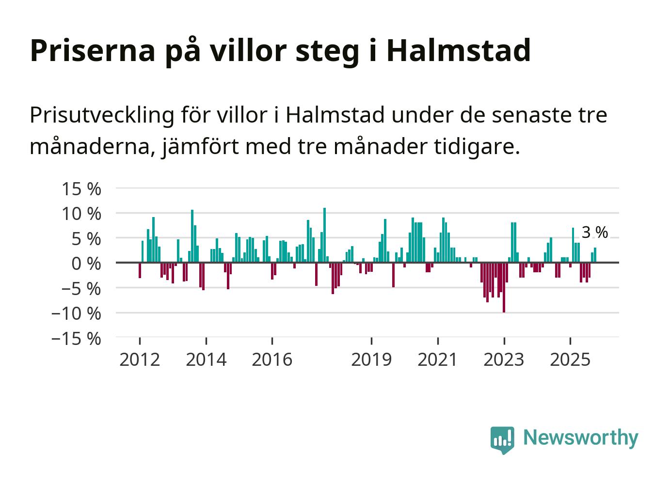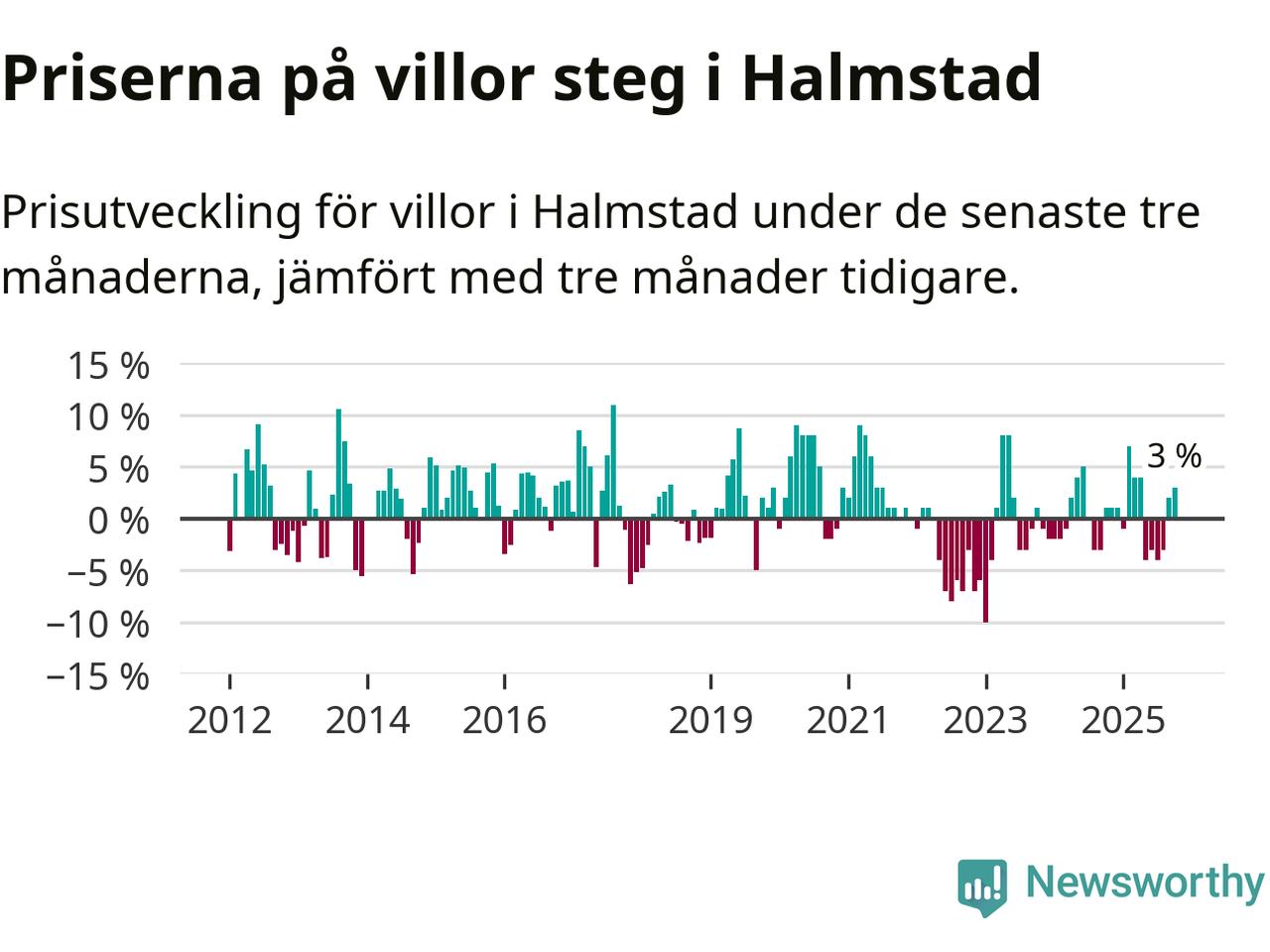 Villapriserna har gått upp i Halmstads kommun. Medelpriset på försäljningarna under de senaste tre månaderna visar på en uppgång med 3 procent.