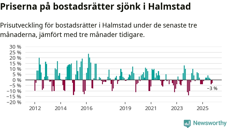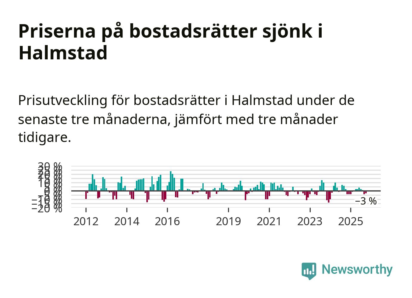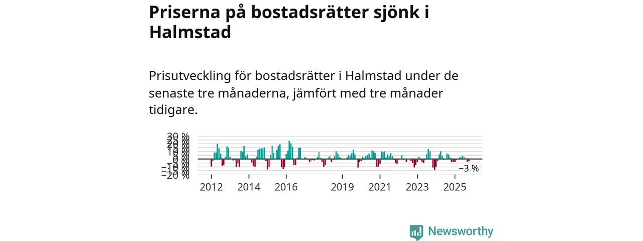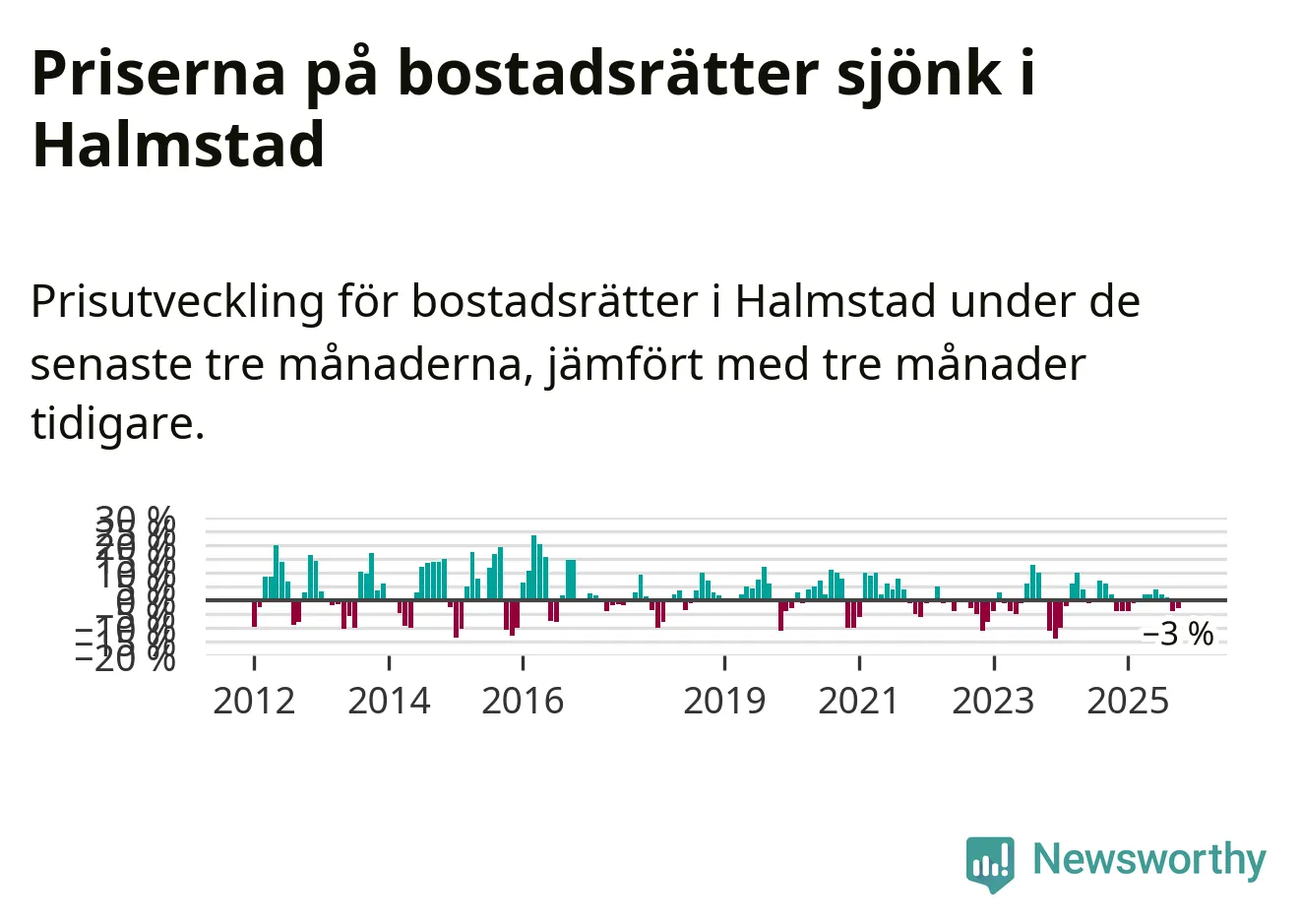 Priserna på bostadsrätter har gått ner i Halmstads kommun. Medelpriset på försäljningarna under de senaste tre månaderna visar på en nedgång med 3 procent.