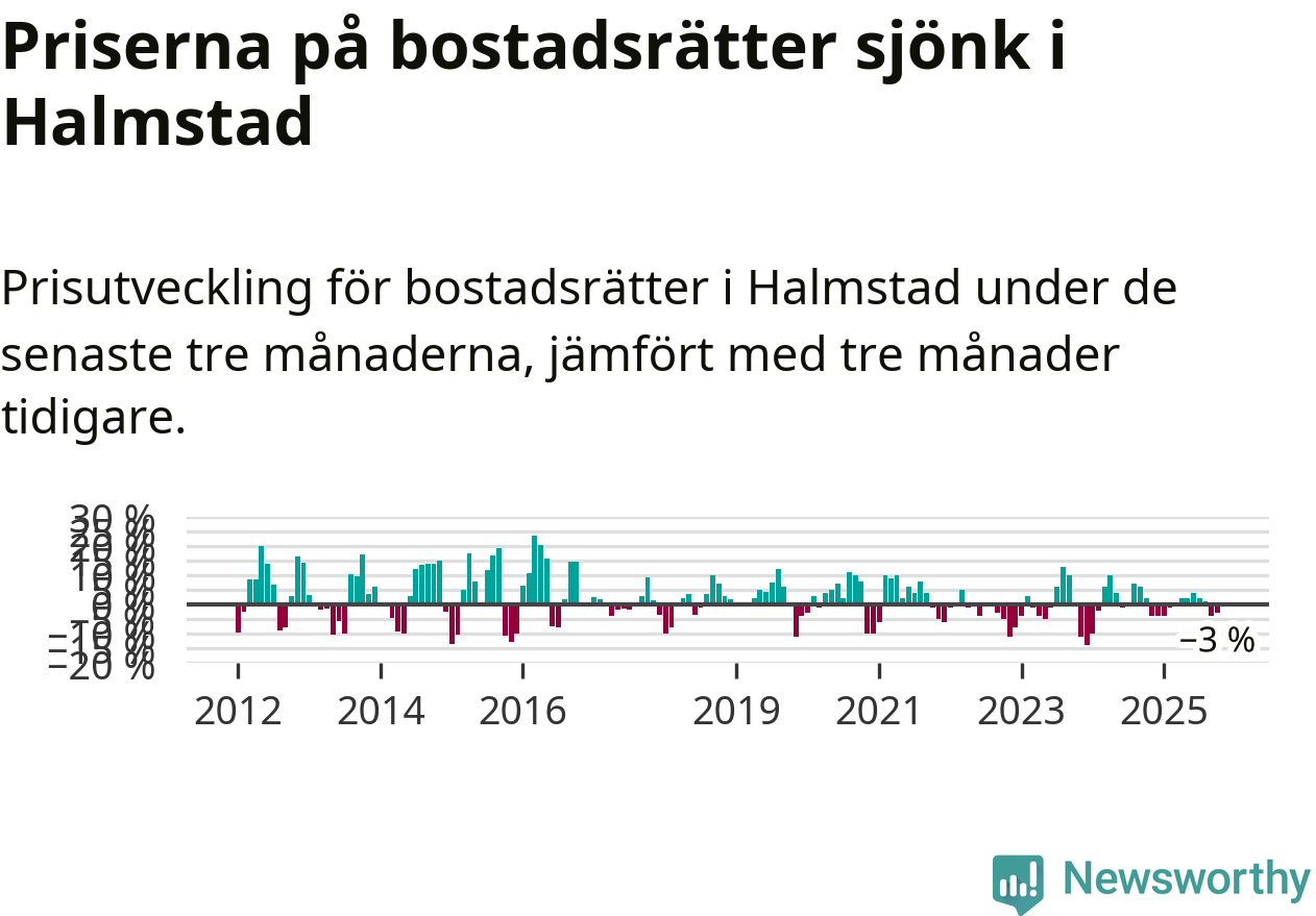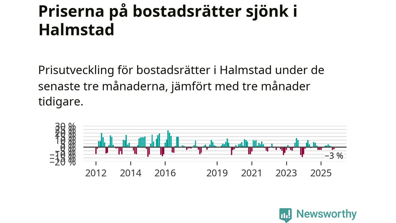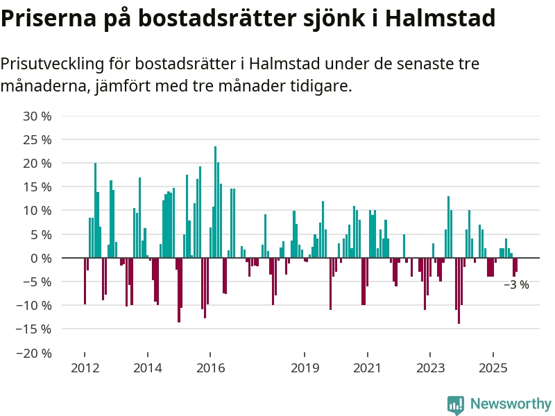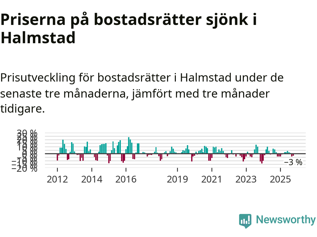 Priserna på bostadsrätter har gått ner i Halmstads kommun. Medelpriset på försäljningarna under de senaste tre månaderna visar på en nedgång med 3 procent.