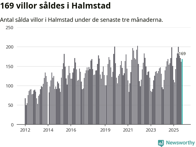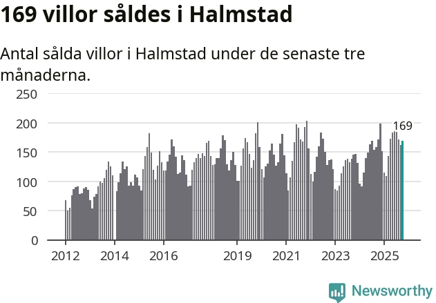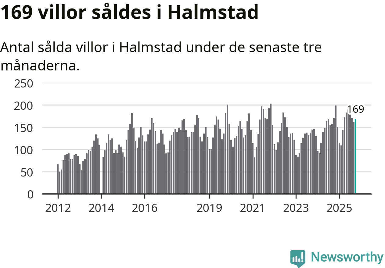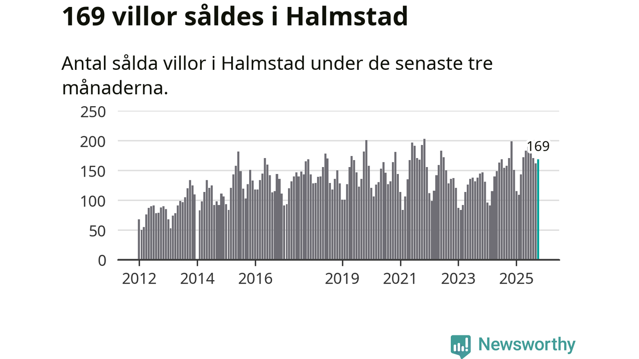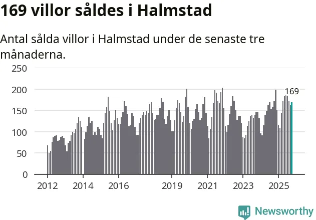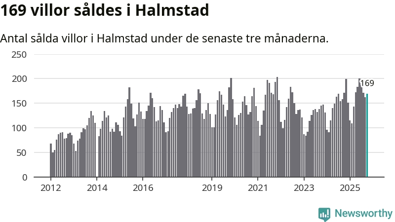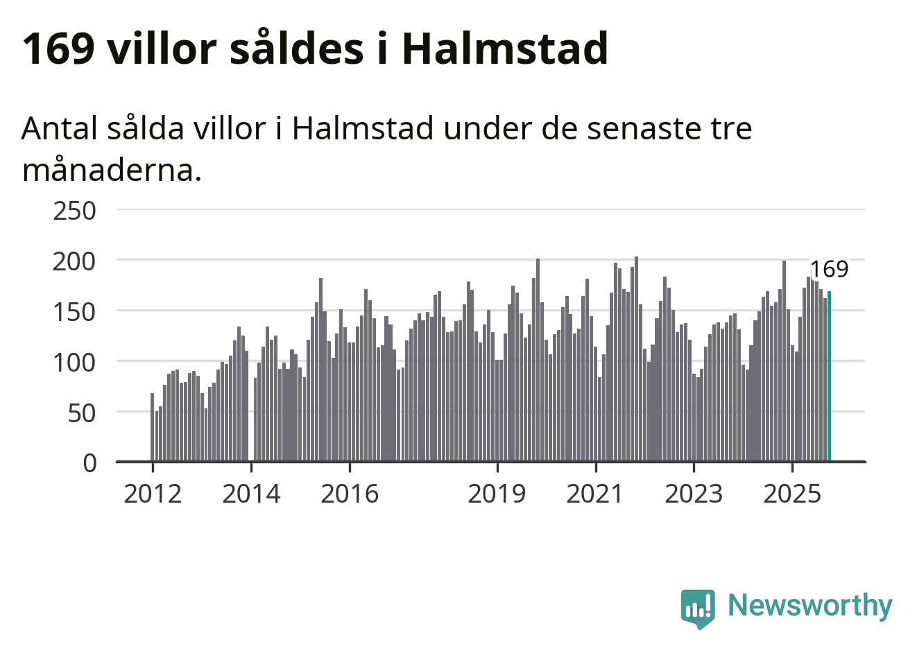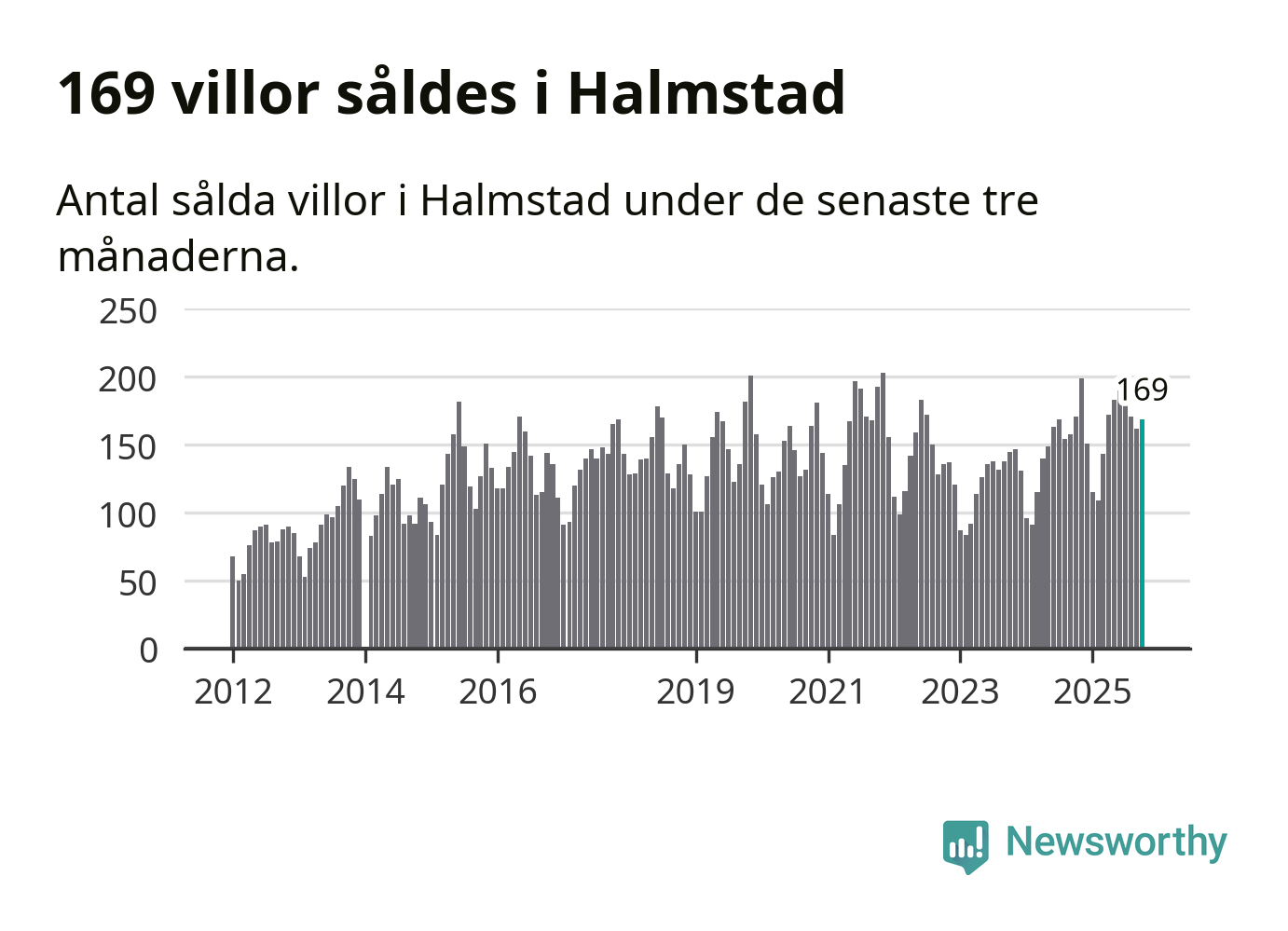 Sammanlagt såldes 169 villor i Halmstads kommun mellan augusti och oktober till ett genomsnittligt pris på 4,1 miljoner kronor. I fjol gjordes 171 affärer vid den här tiden på året.