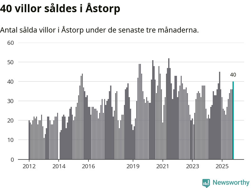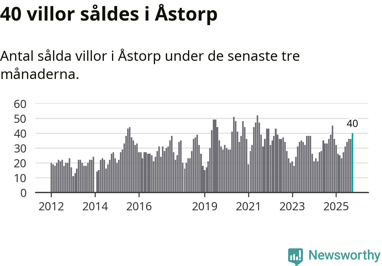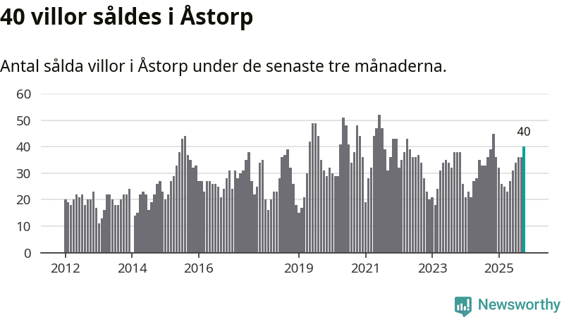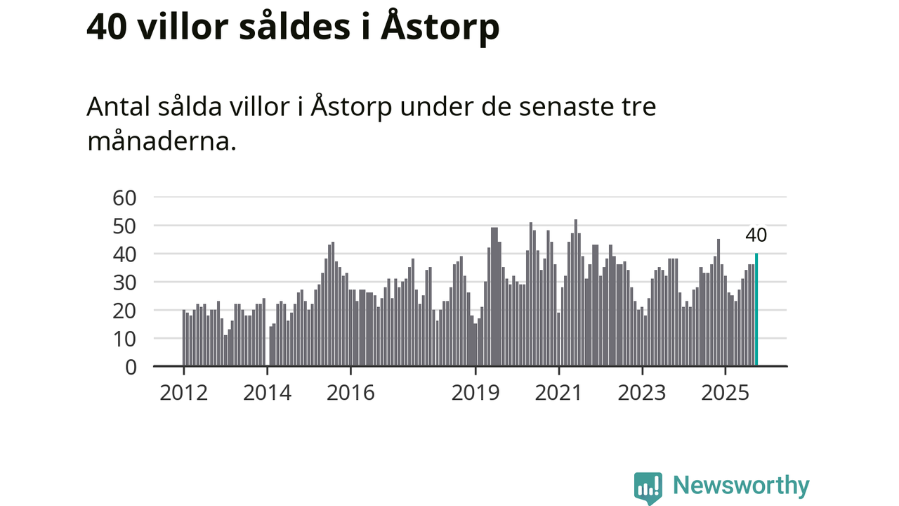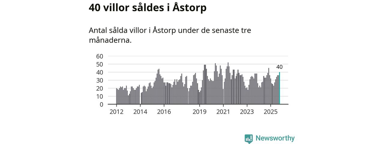 Mellan augusti och oktober gjordes sammanlagt 40 affärer med villor i Åstorps kommun. Det kan jämföras med 39 vid motsvarande tid i fjol.