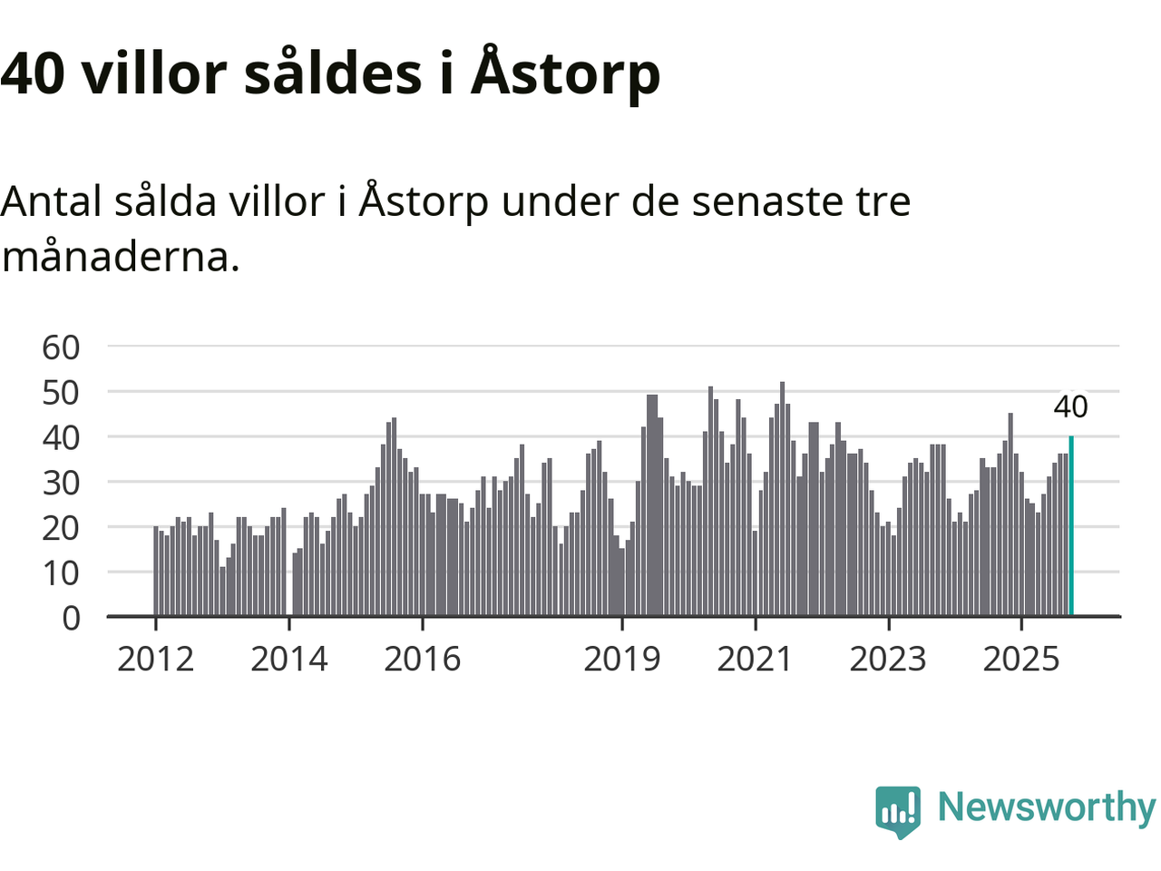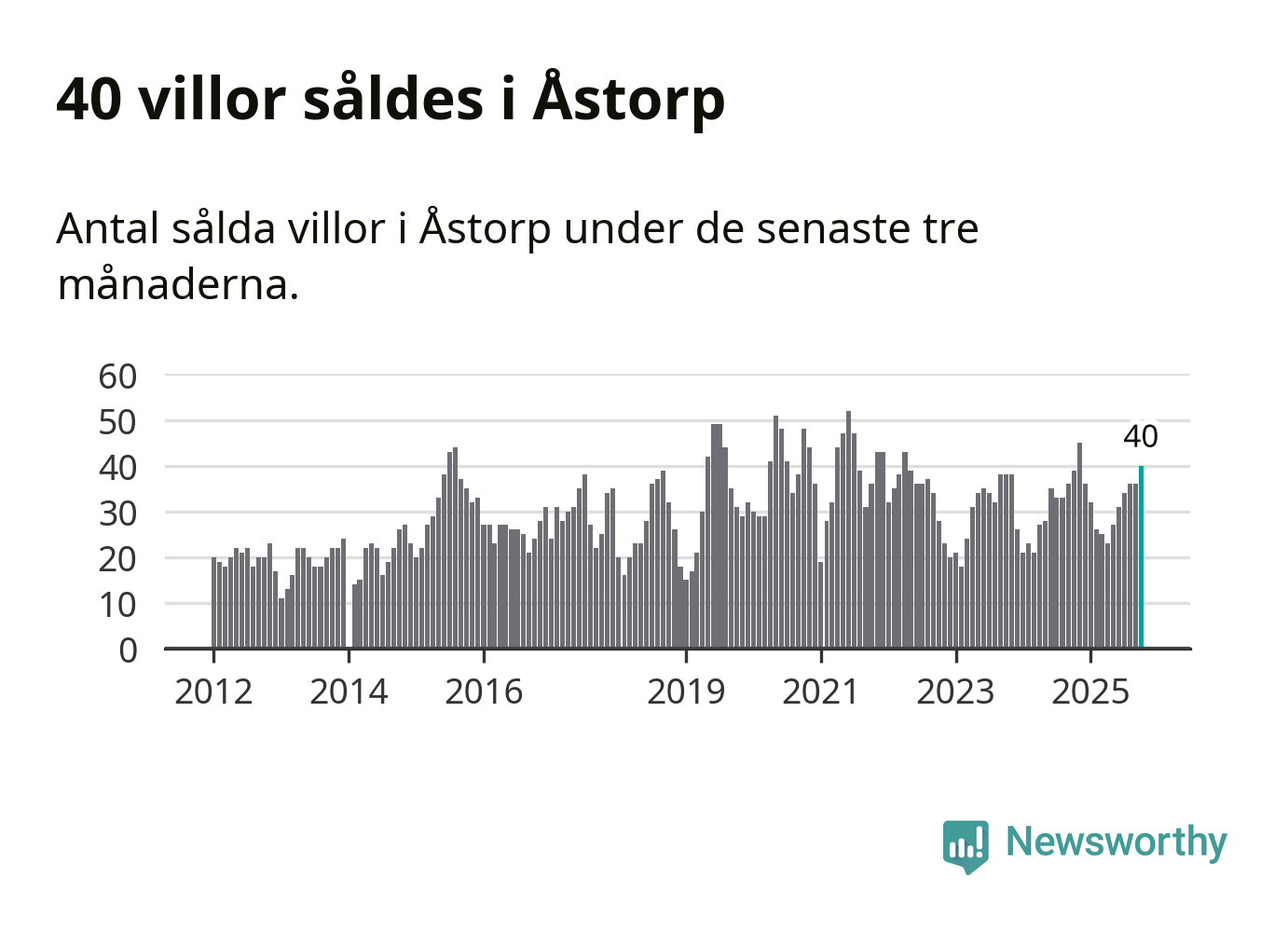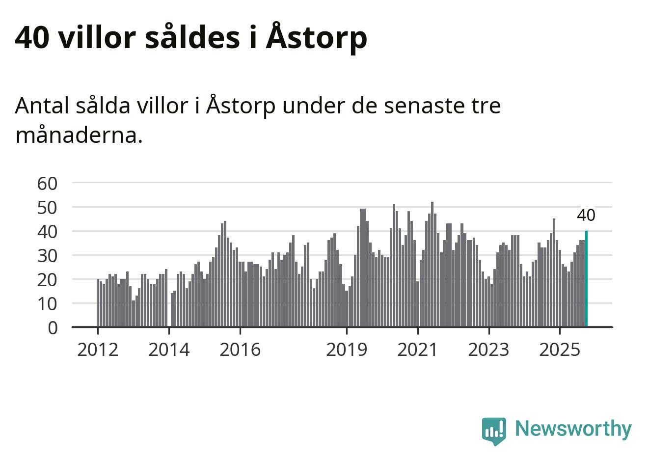 Mellan augusti och oktober gjordes sammanlagt 40 affärer med villor i Åstorps kommun. Det kan jämföras med 39 vid motsvarande tid i fjol.