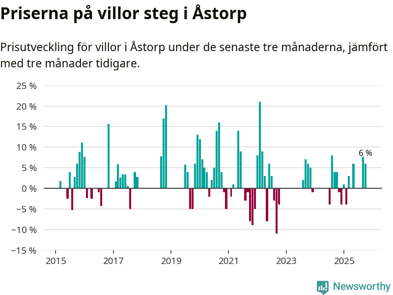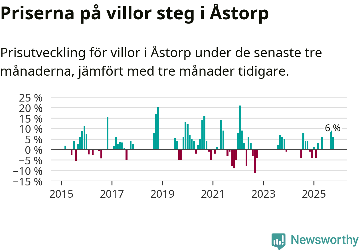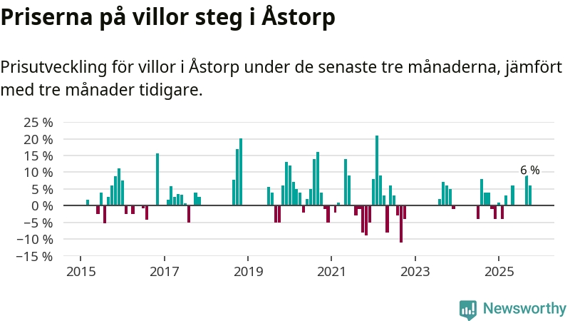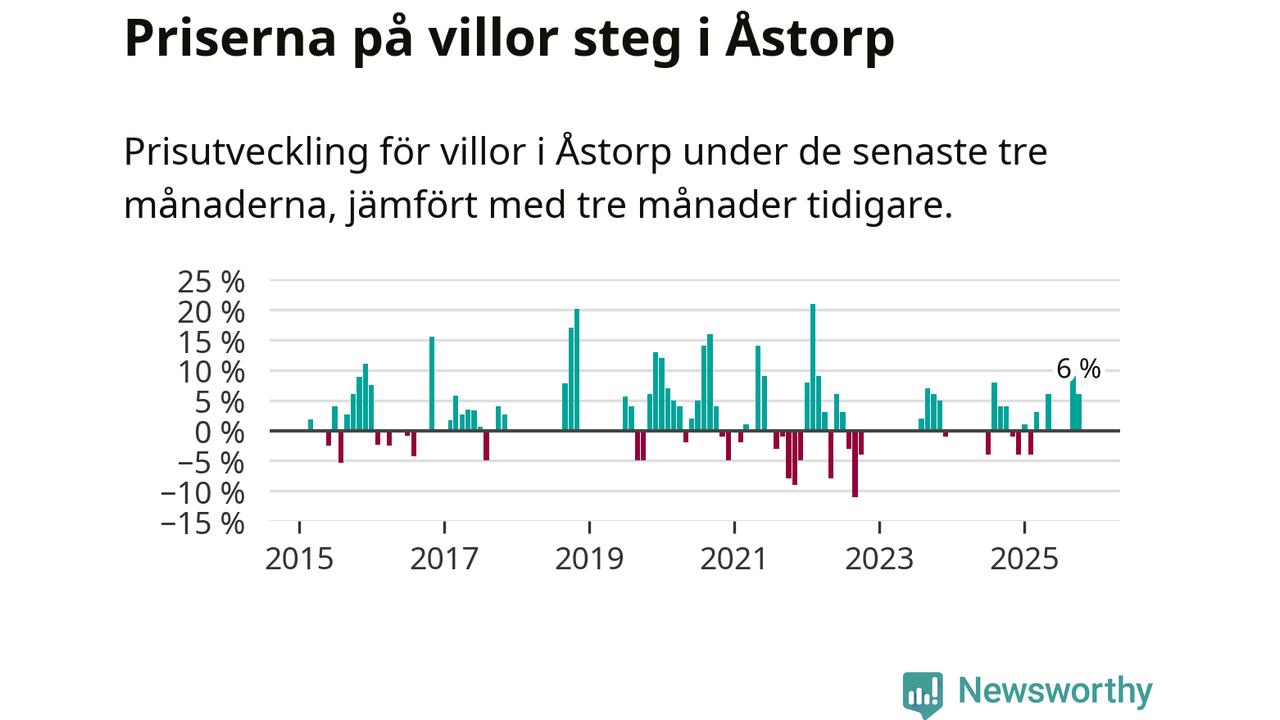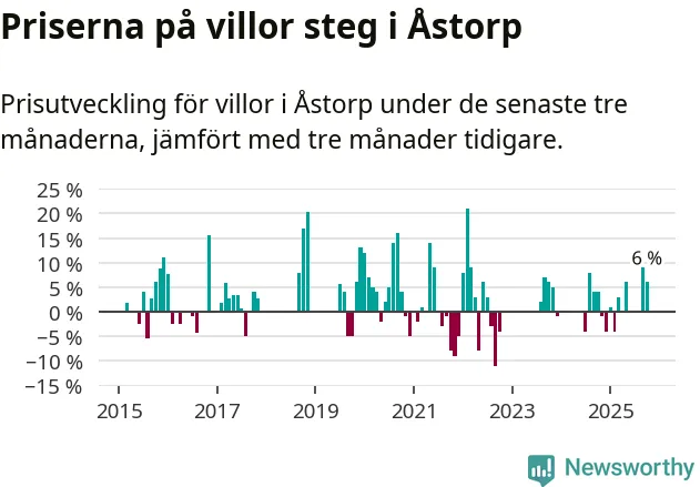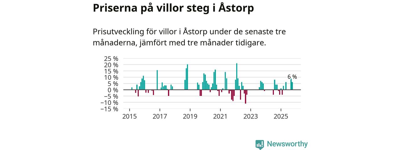 Statistiken visar även på en kännbar prisuppgång i Åstorps kommun. Medelpriset på försäljningarna av villor i kommunen var 6 procent högre än för tre månader sedan. I hela Skåne däremot ligger villapriserna stilla.