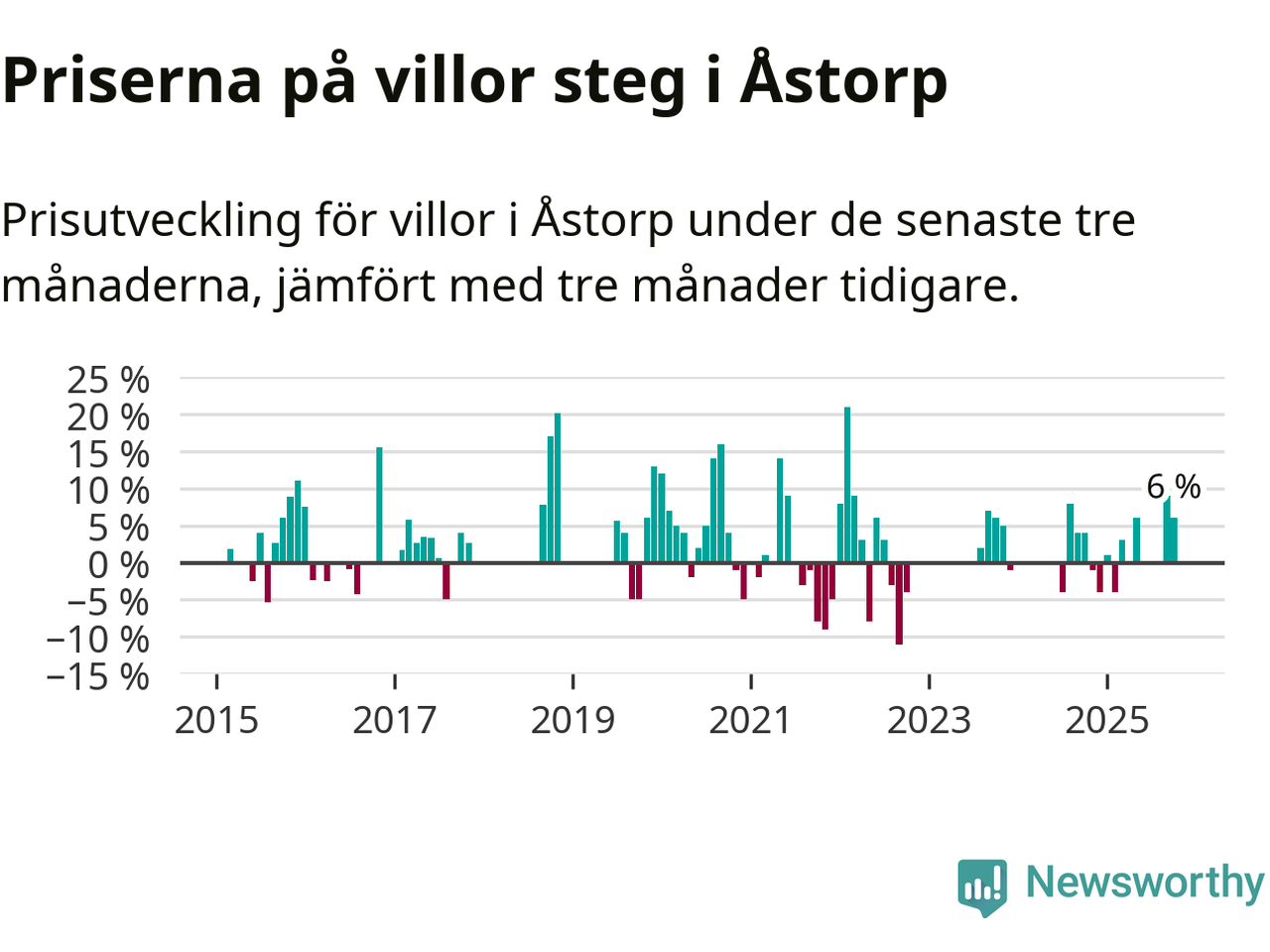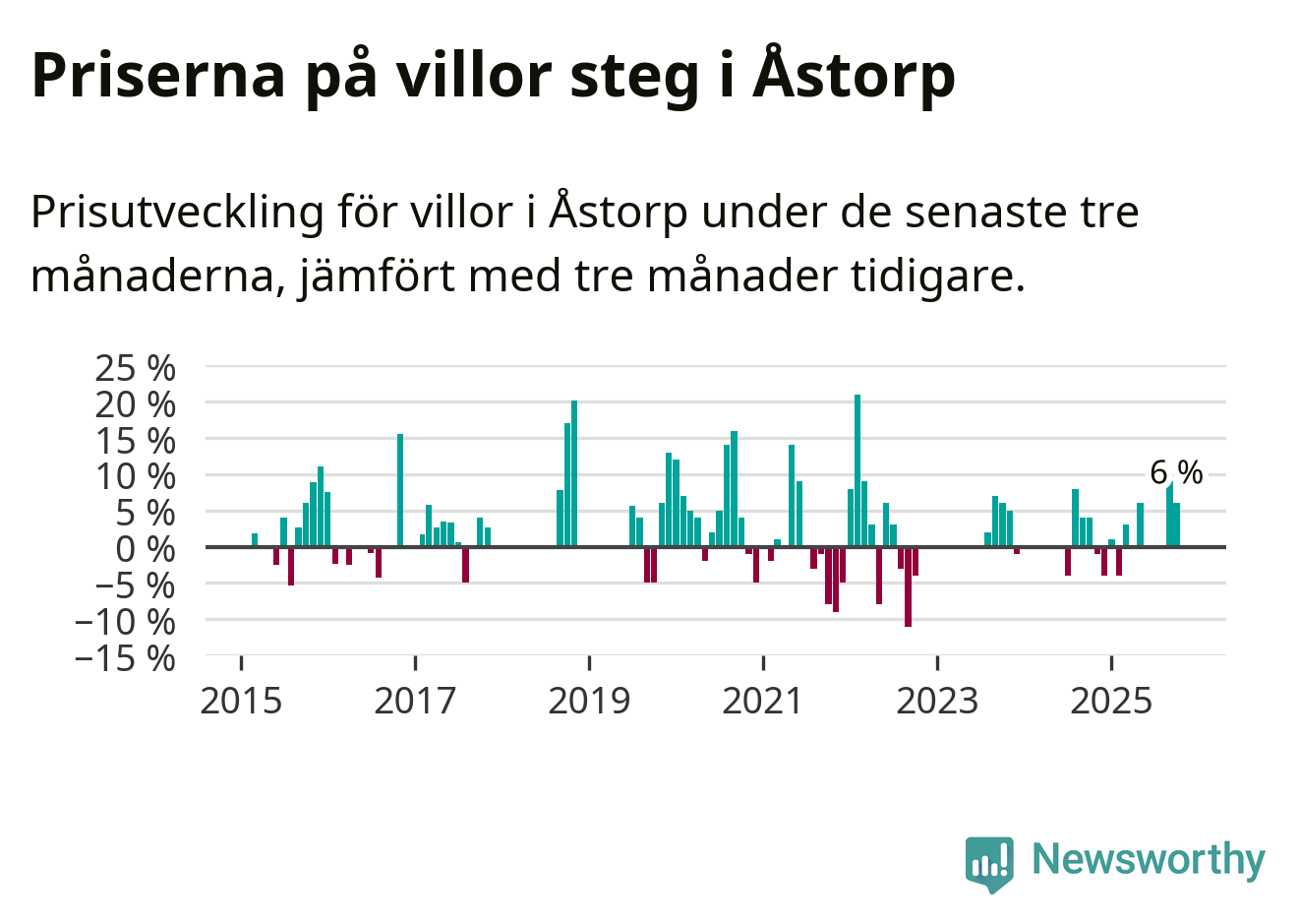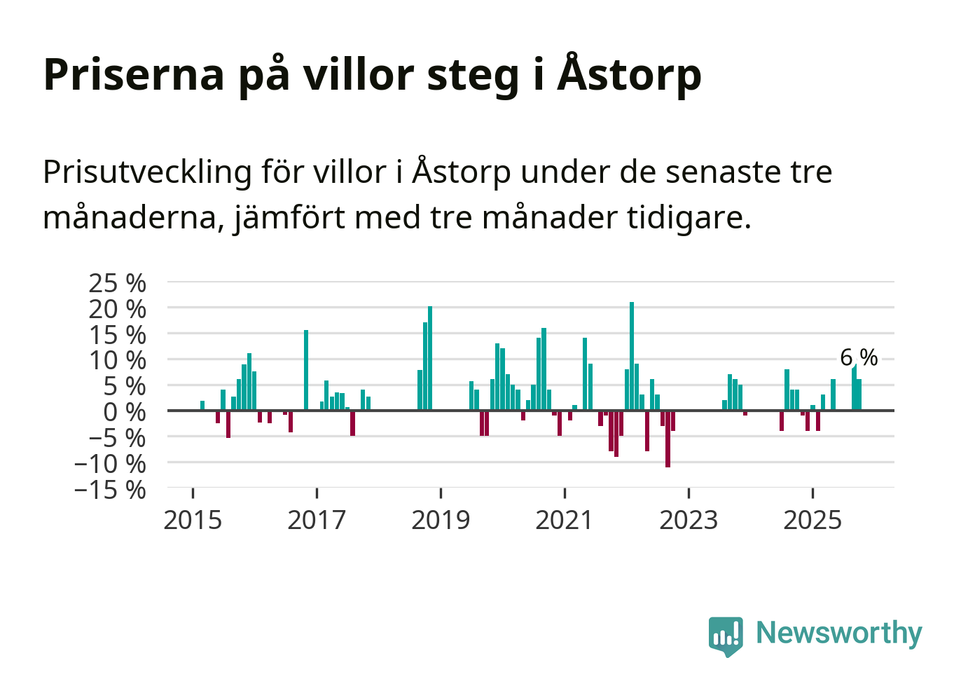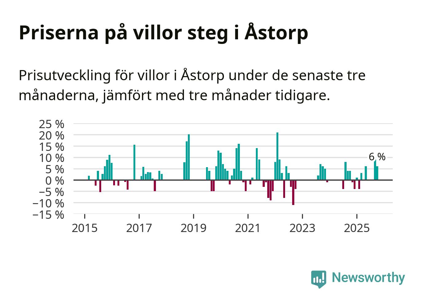 Statistiken visar även på en kännbar prisuppgång i Åstorps kommun. Medelpriset på försäljningarna av villor i kommunen var 6 procent högre än för tre månader sedan. I hela Skåne däremot ligger villapriserna stilla.