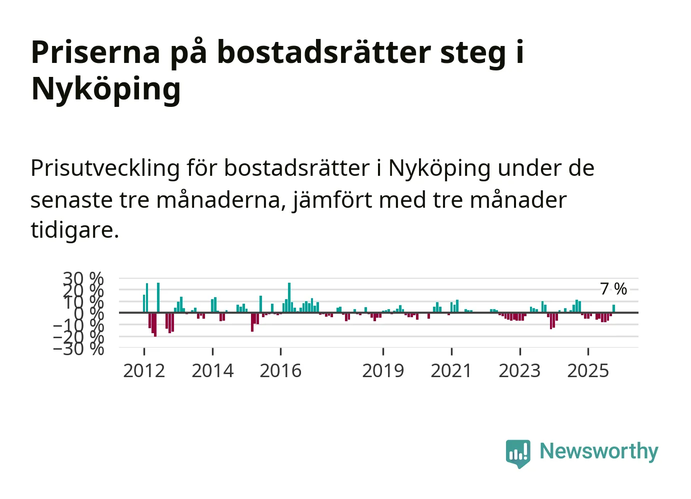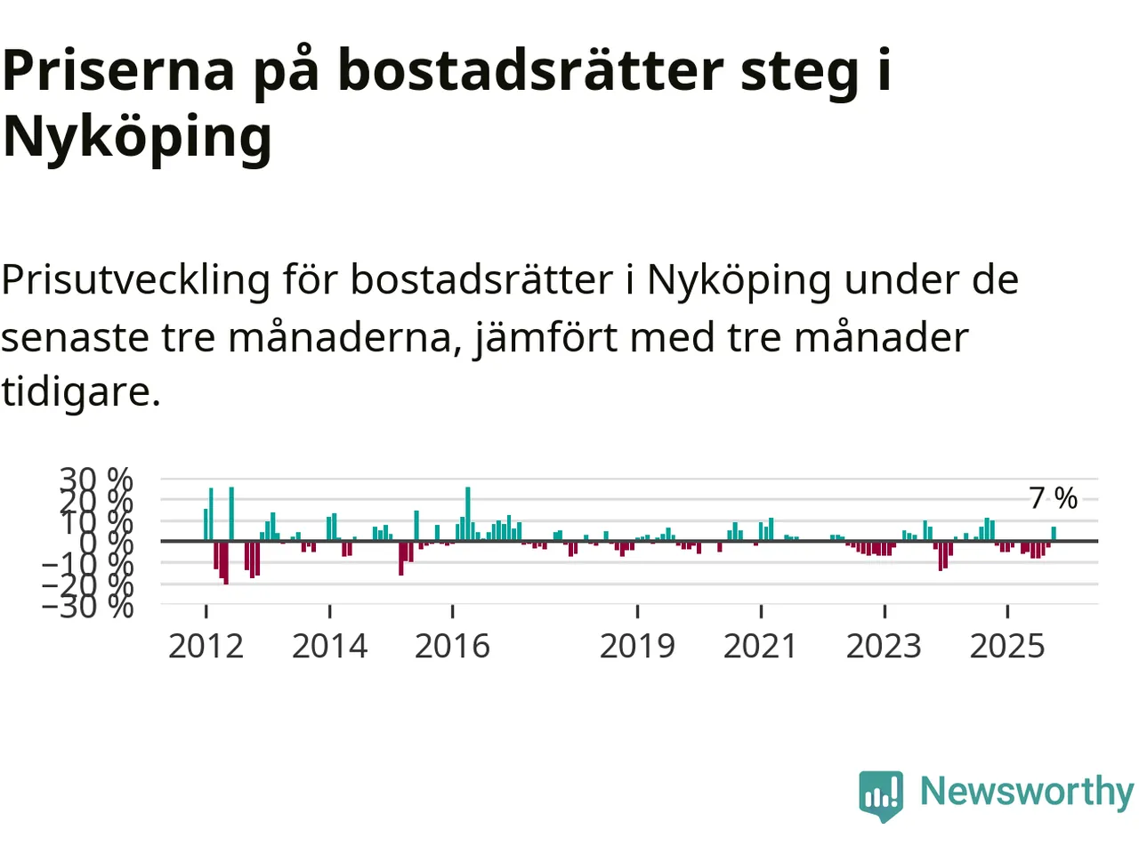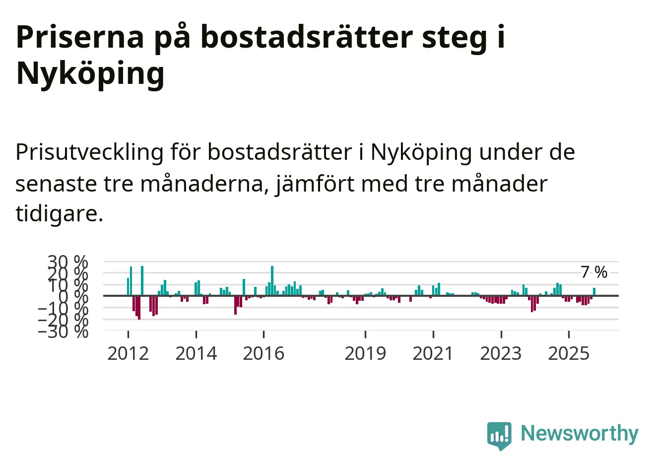 Sedan oktober 2024 har priserna på bostadsrätter sjunkit i Nyköpings kommun, men försäljningarna under de senaste tre månaderna visar på en uppgång med 7 procent.