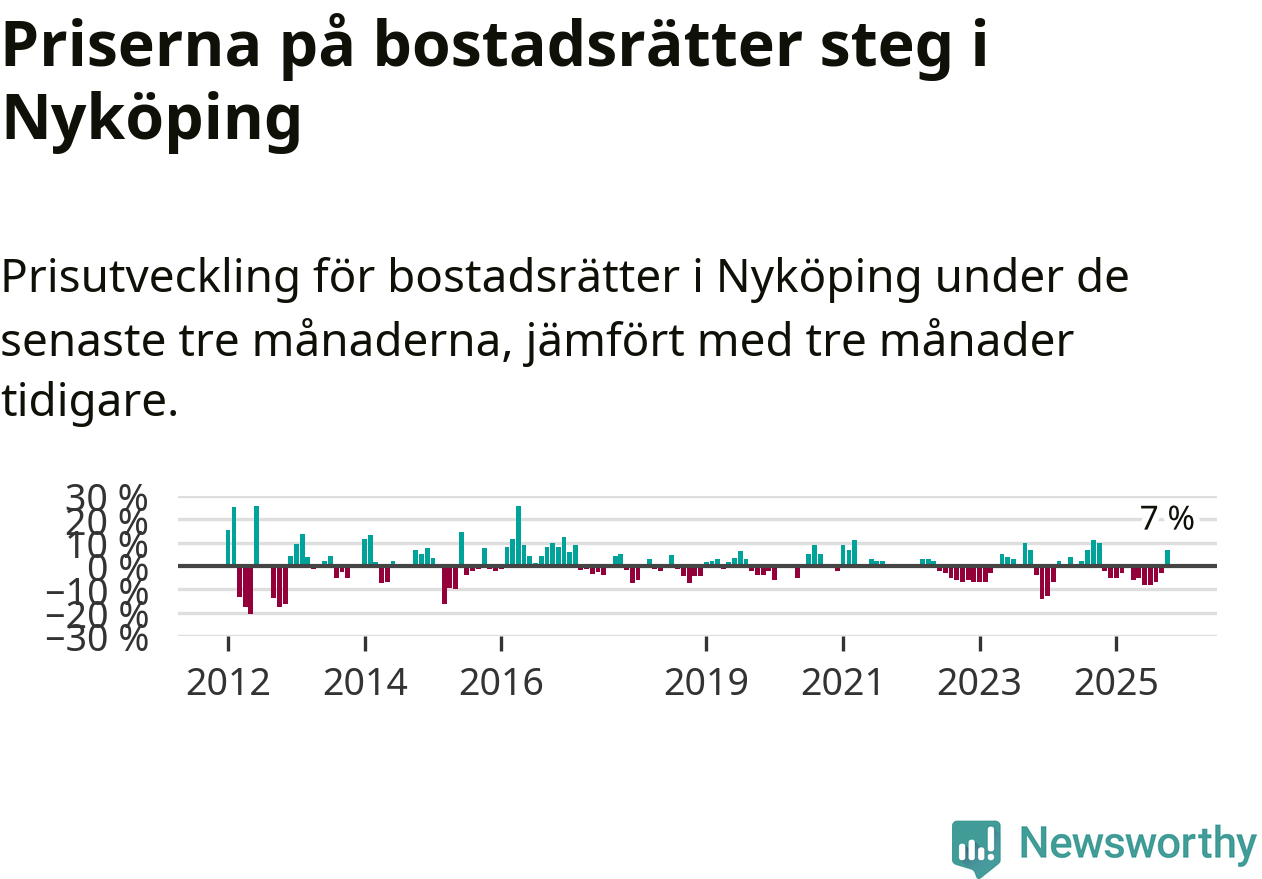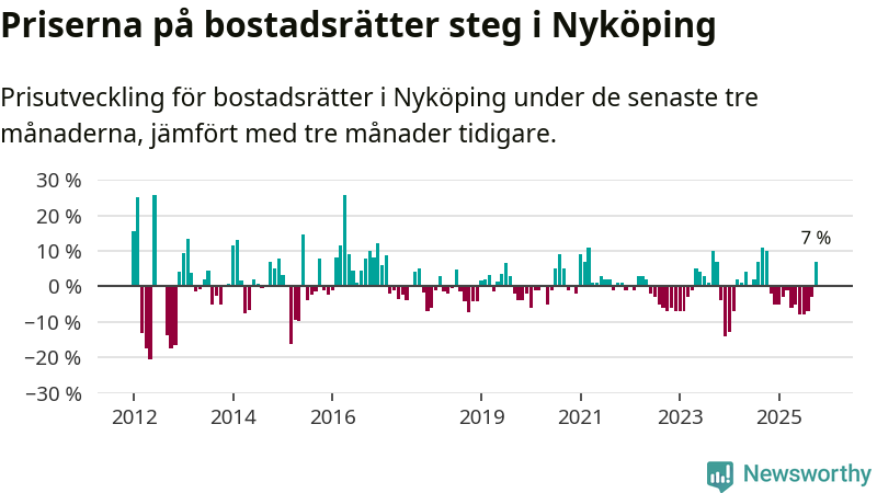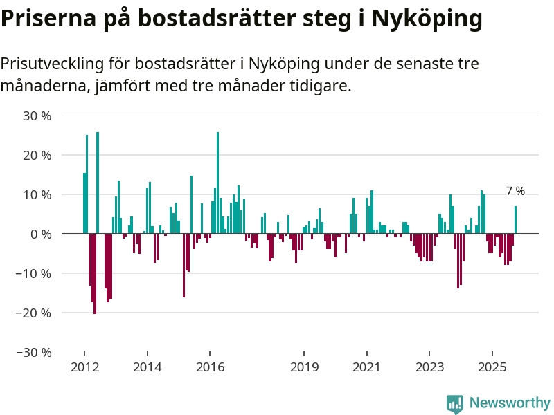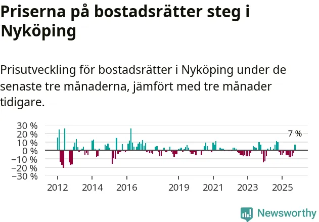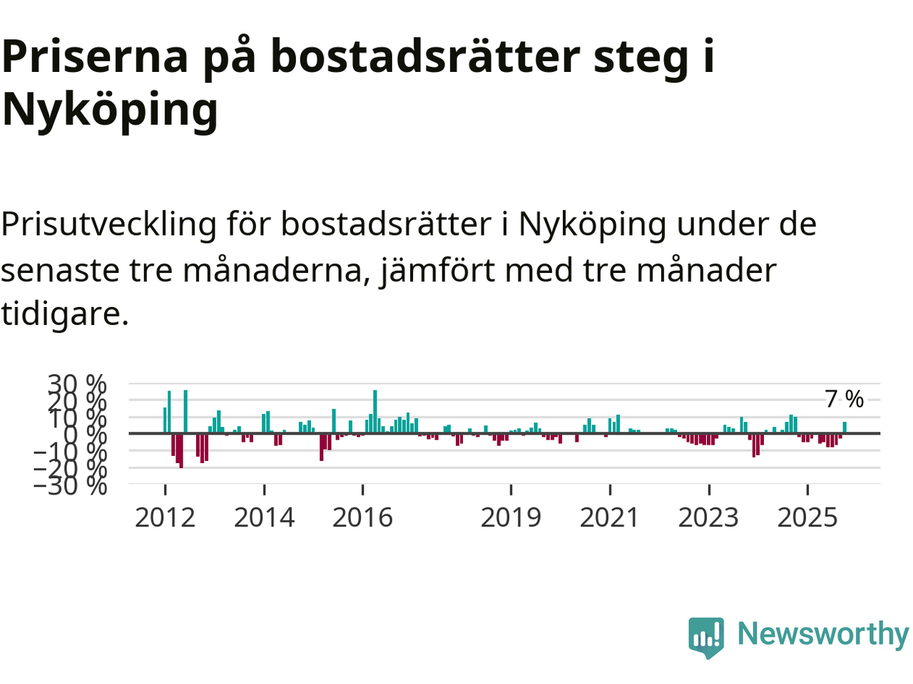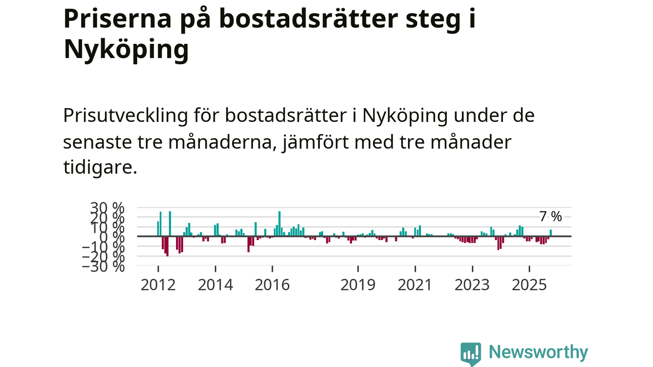 Sedan oktober 2024 har priserna på bostadsrätter sjunkit i Nyköpings kommun, men försäljningarna under de senaste tre månaderna visar på en uppgång med 7 procent.