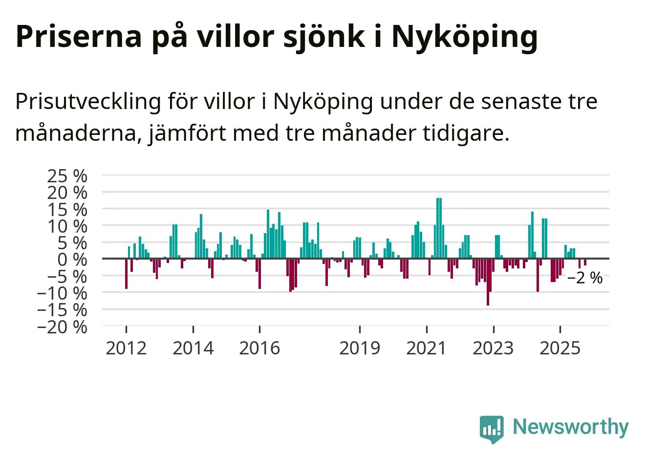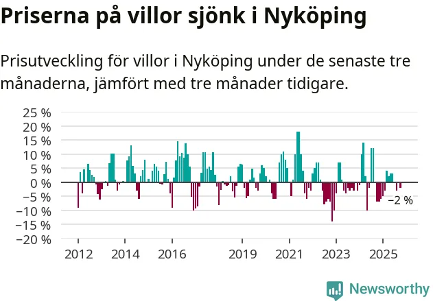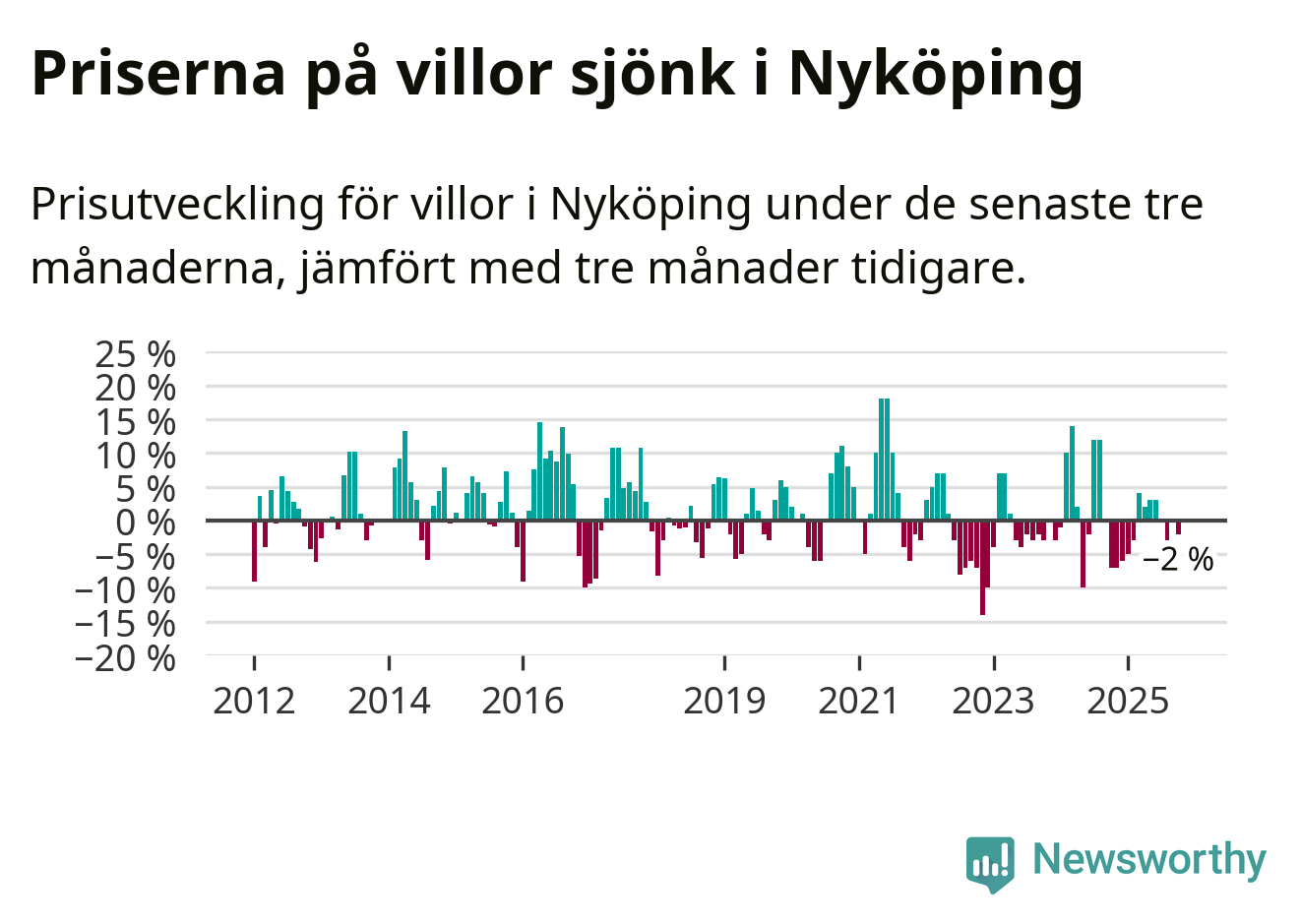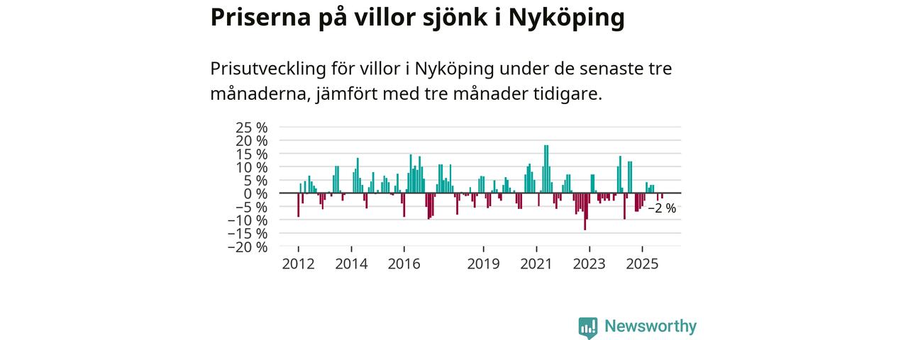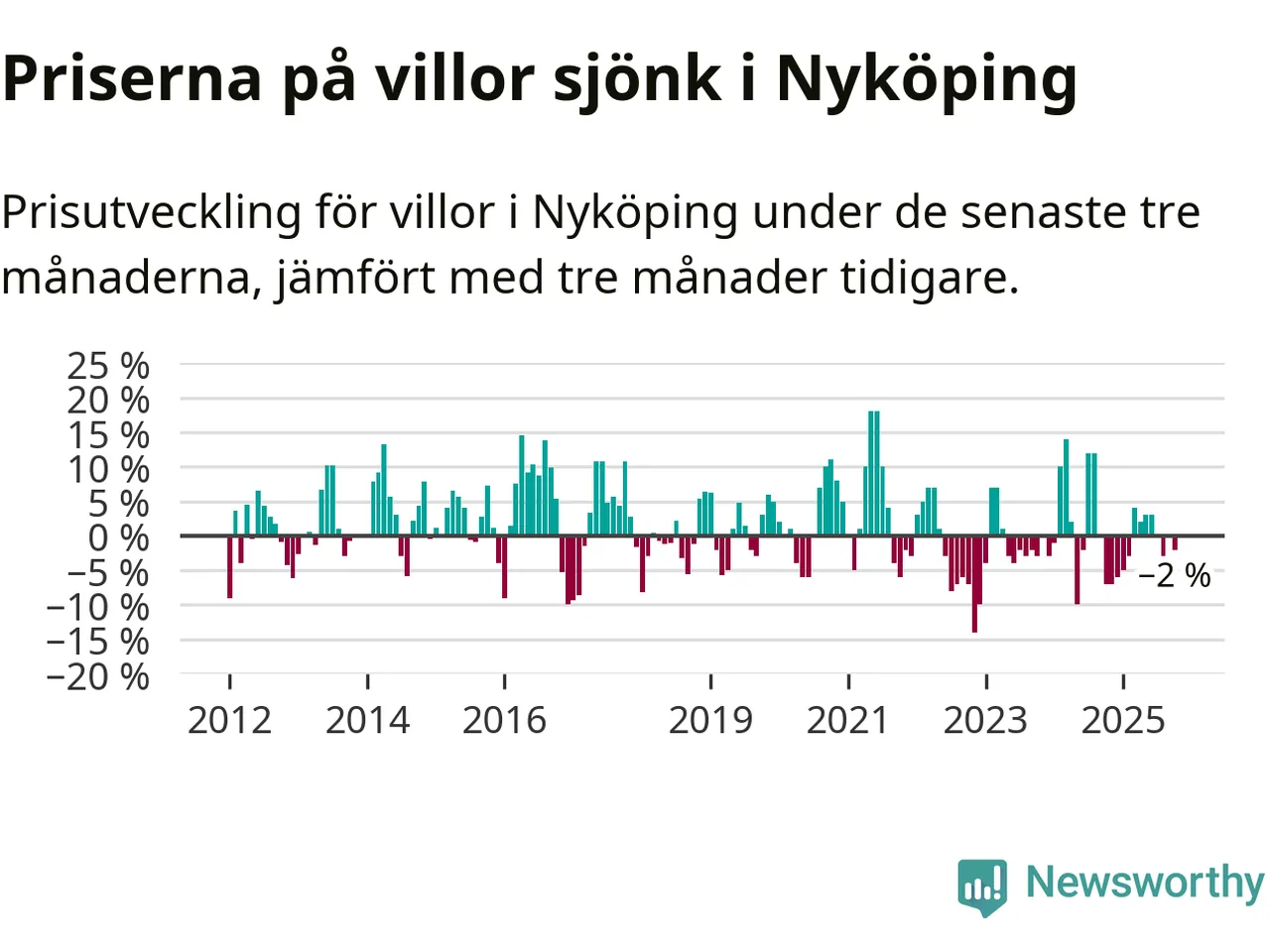Statistiken visar även på en prisnedgång i Nyköpings kommun. Medelpriset på försäljningarna av villor i kommunen var 2 procent lägre än för tre månader sedan. Även i hela Södermanland sjunker villapriserna. I hela länet noterades en prisnedgång på 5 procent.