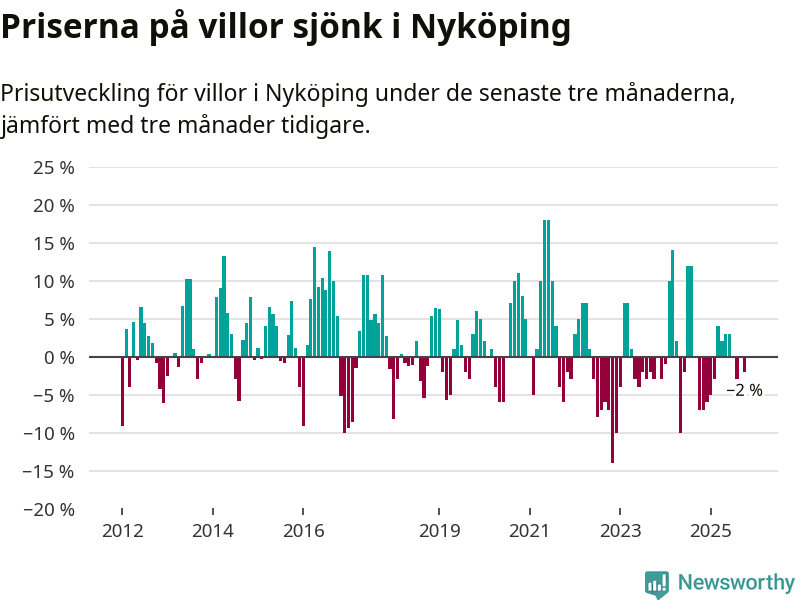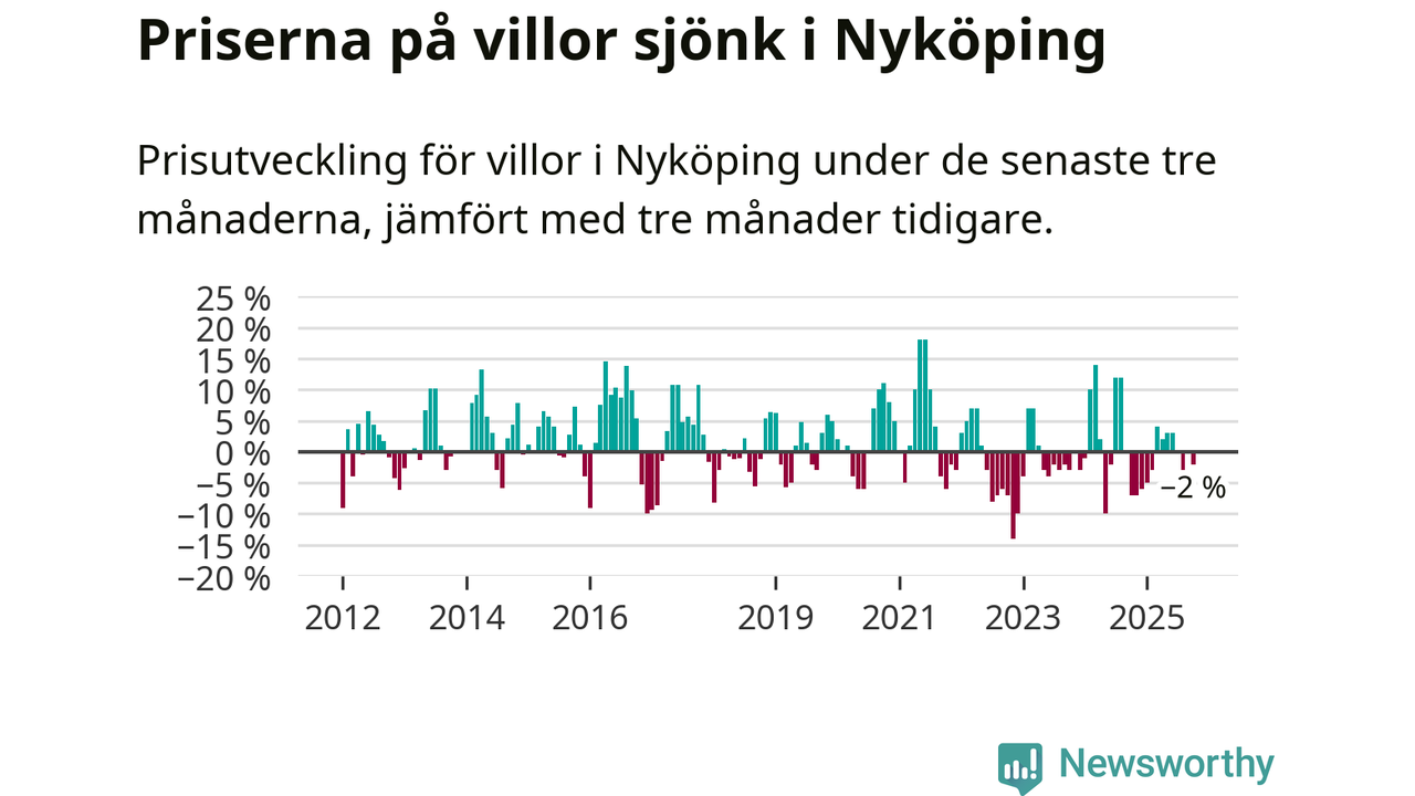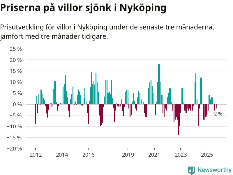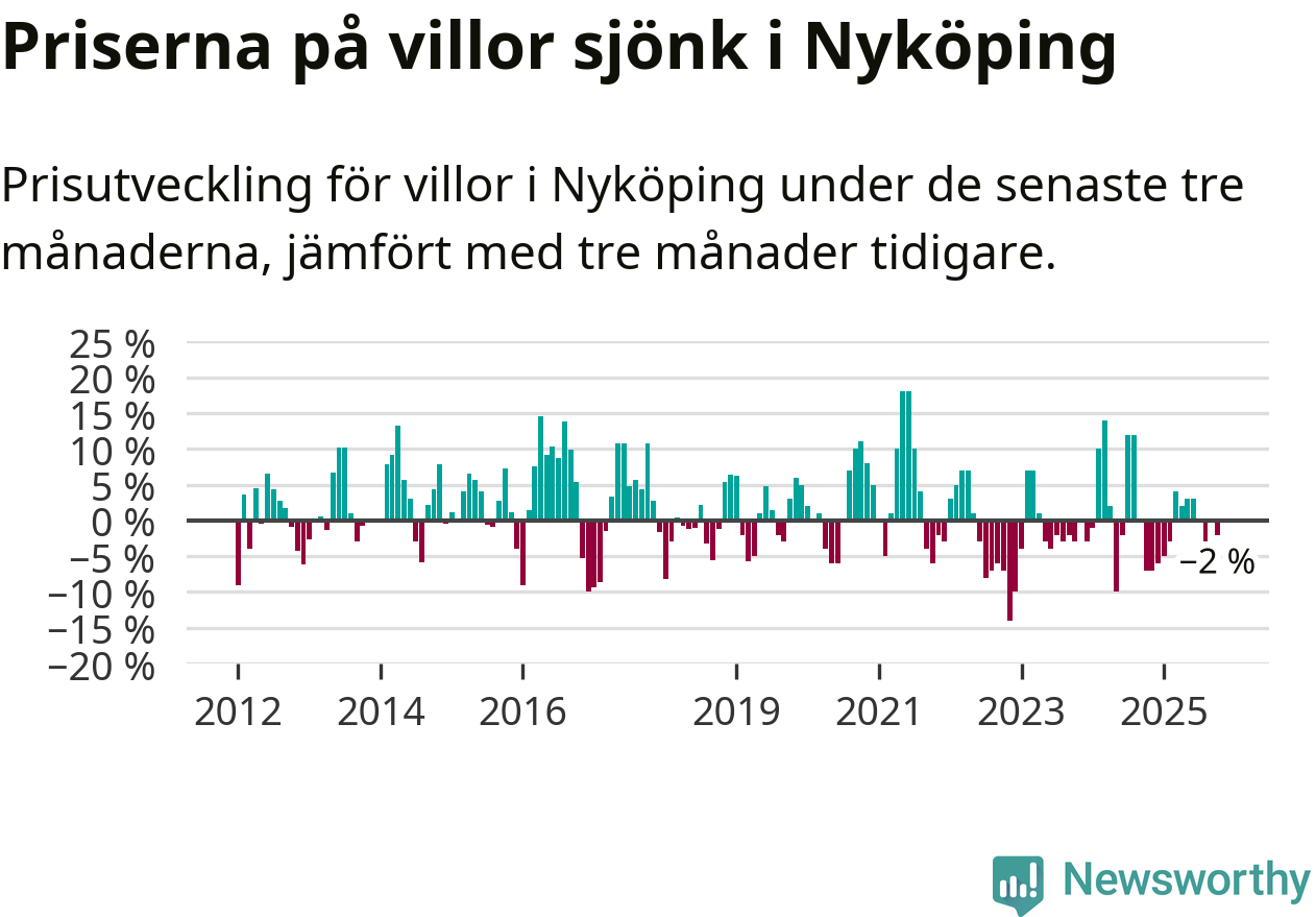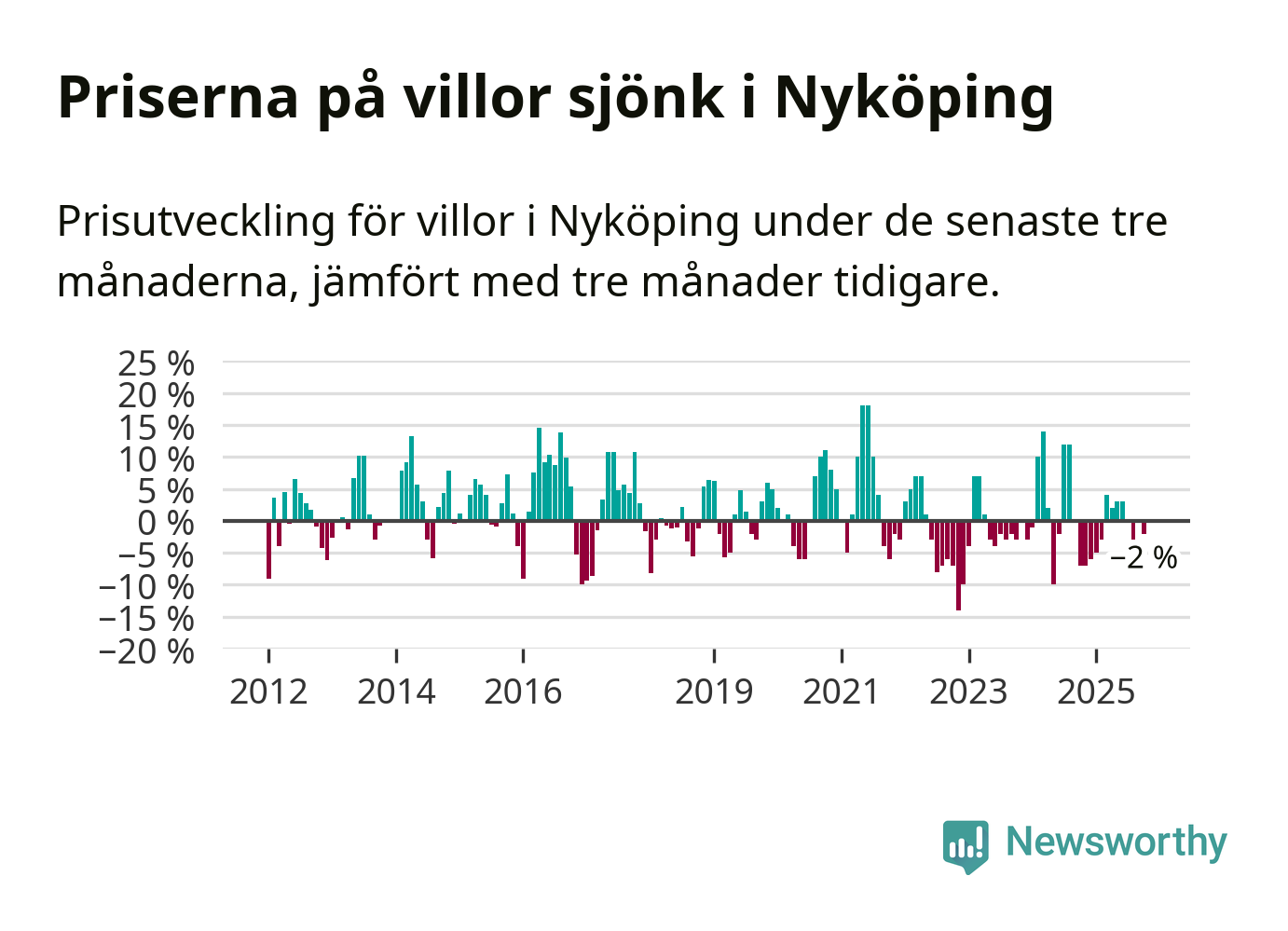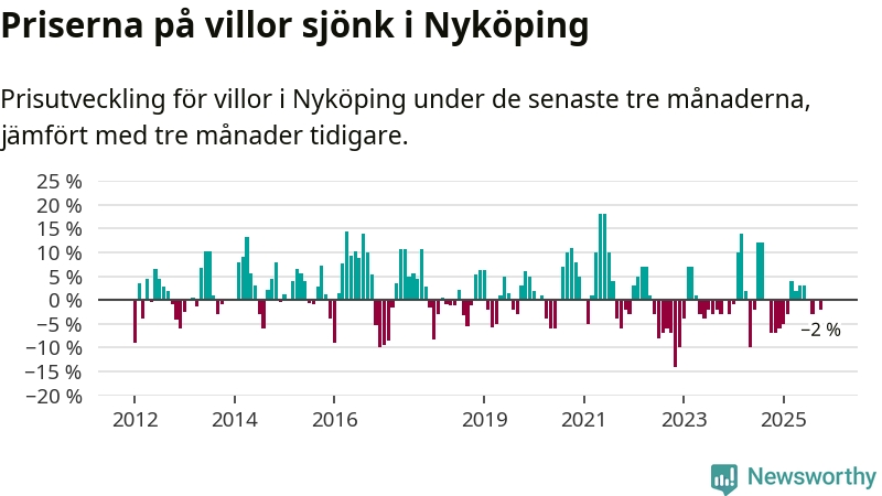 Statistiken visar även på en prisnedgång i Nyköpings kommun. Medelpriset på försäljningarna av villor i kommunen var 2 procent lägre än för tre månader sedan. Även i hela Södermanland sjunker villapriserna. I hela länet noterades en prisnedgång på 5 procent.