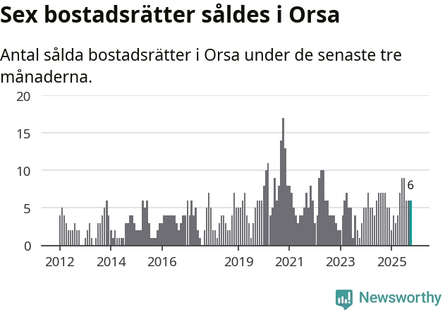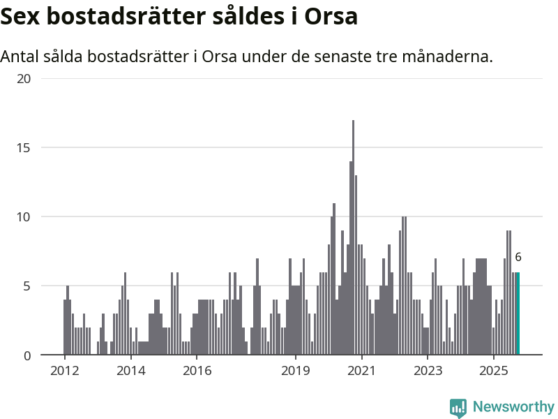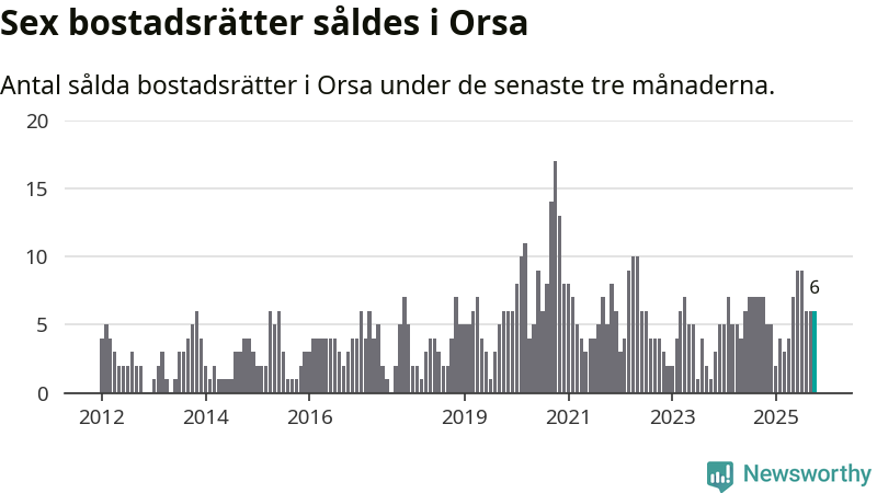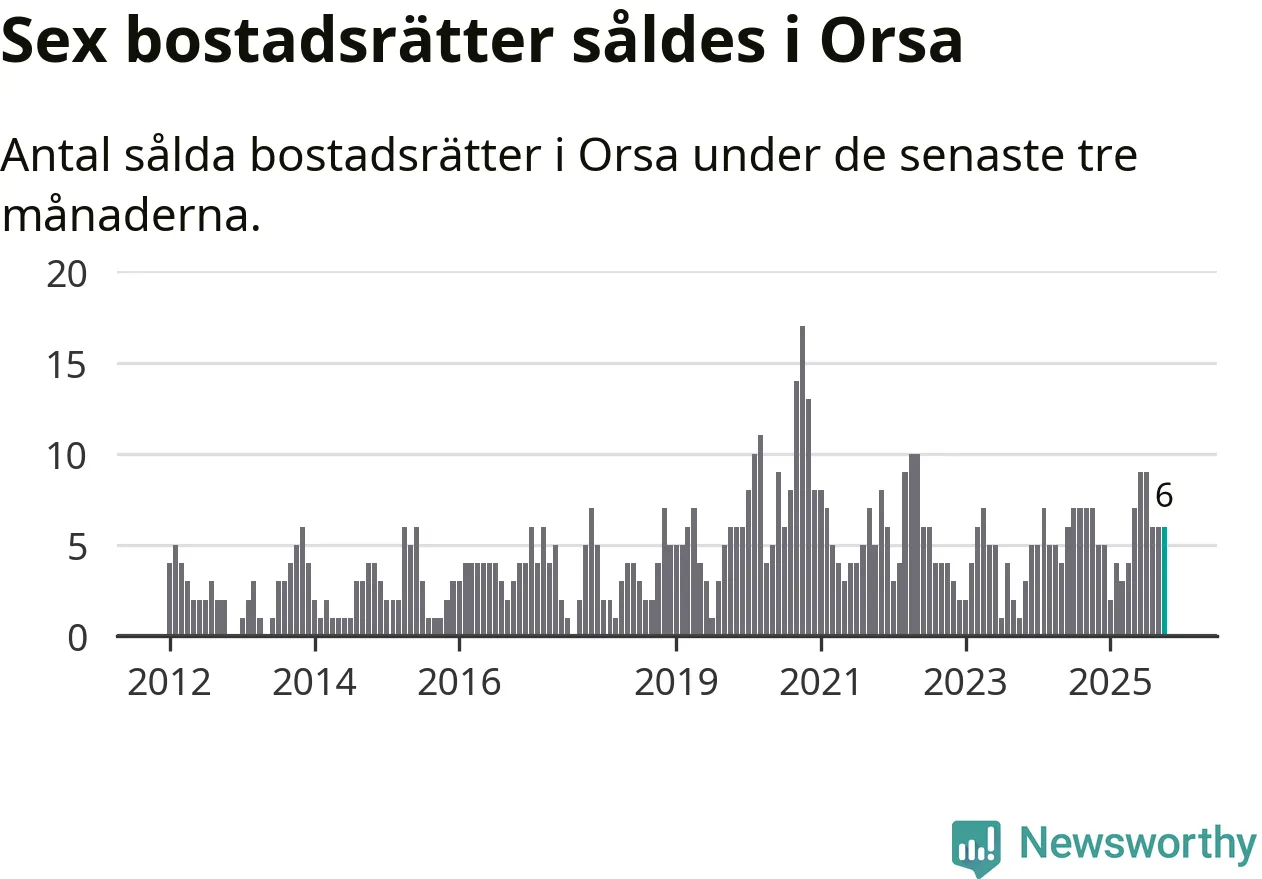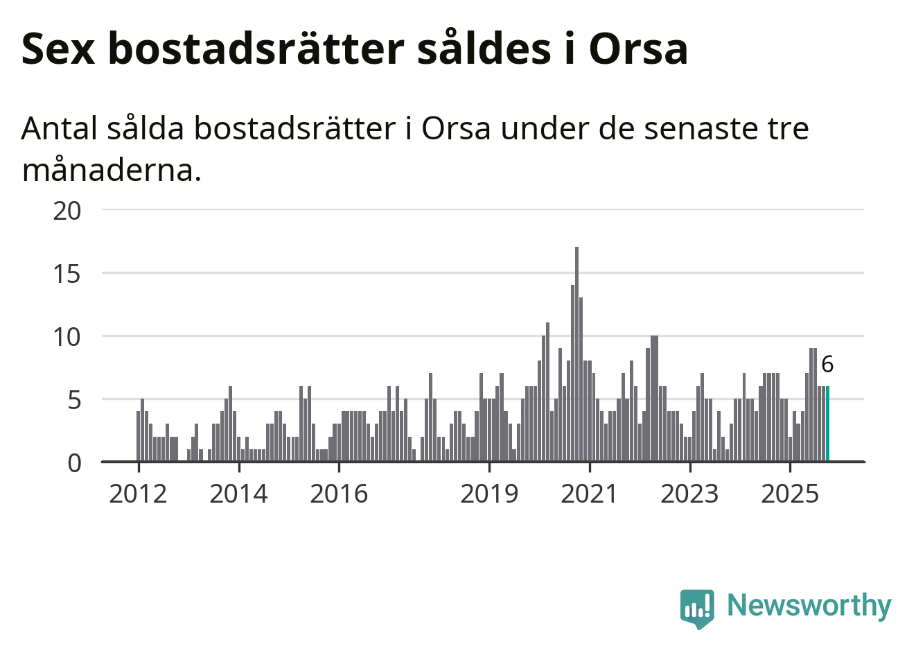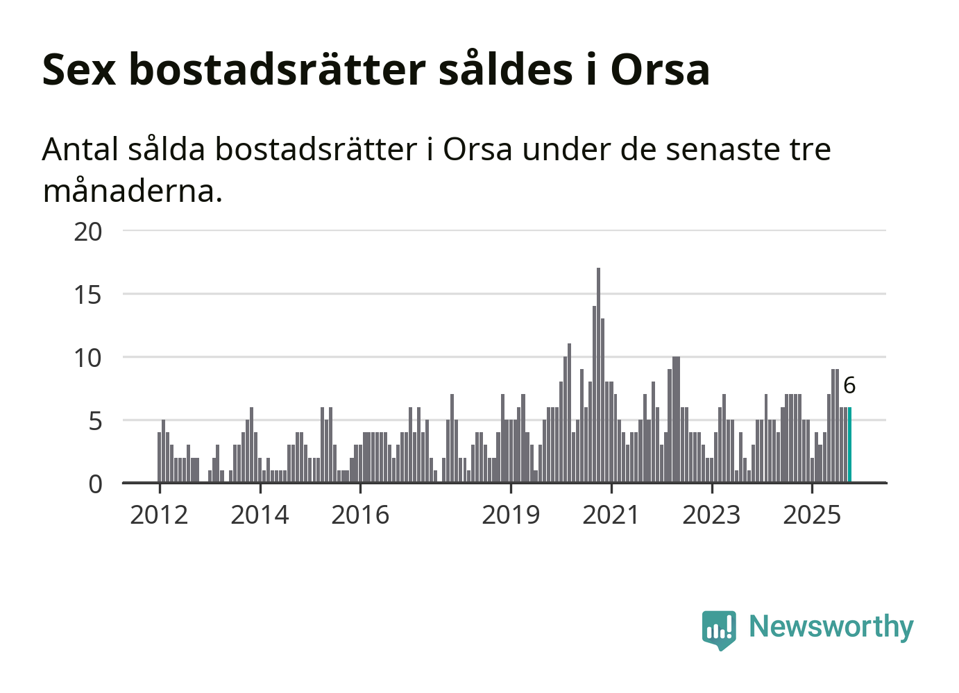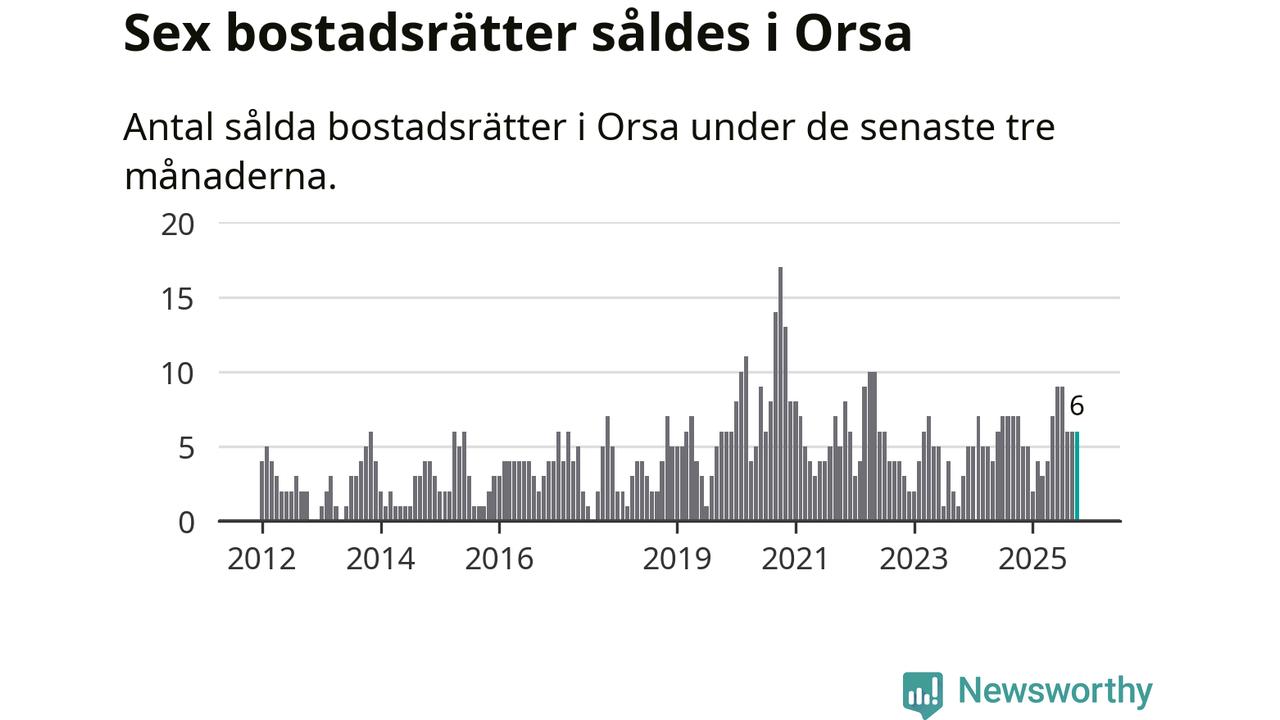 Mellan augusti och oktober gjordes sammanlagt sex affärer med bostadsrätter i Orsa kommun. Det kan jämföras med sju vid motsvarande tid i fjol.