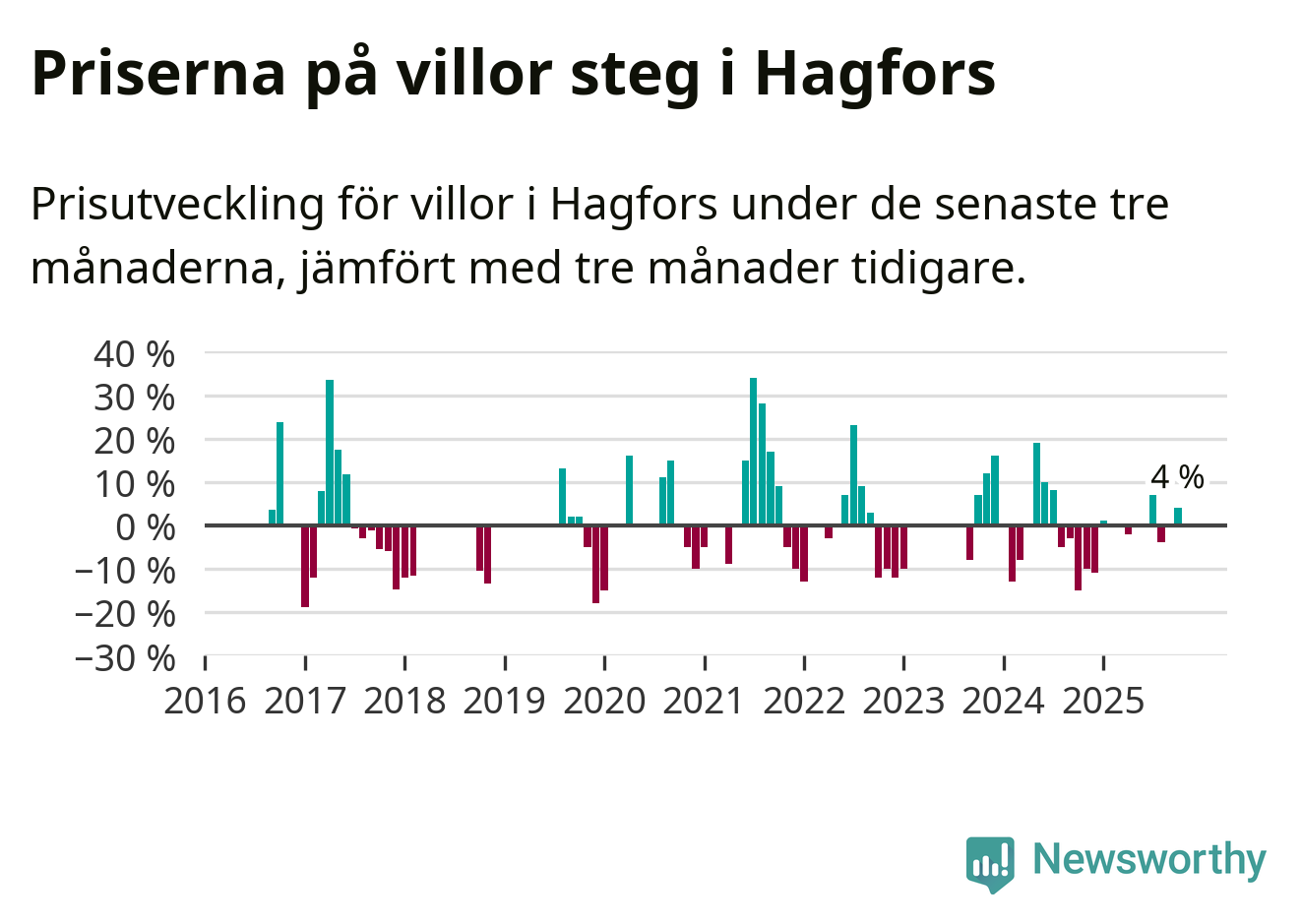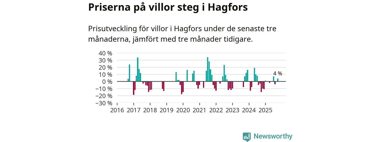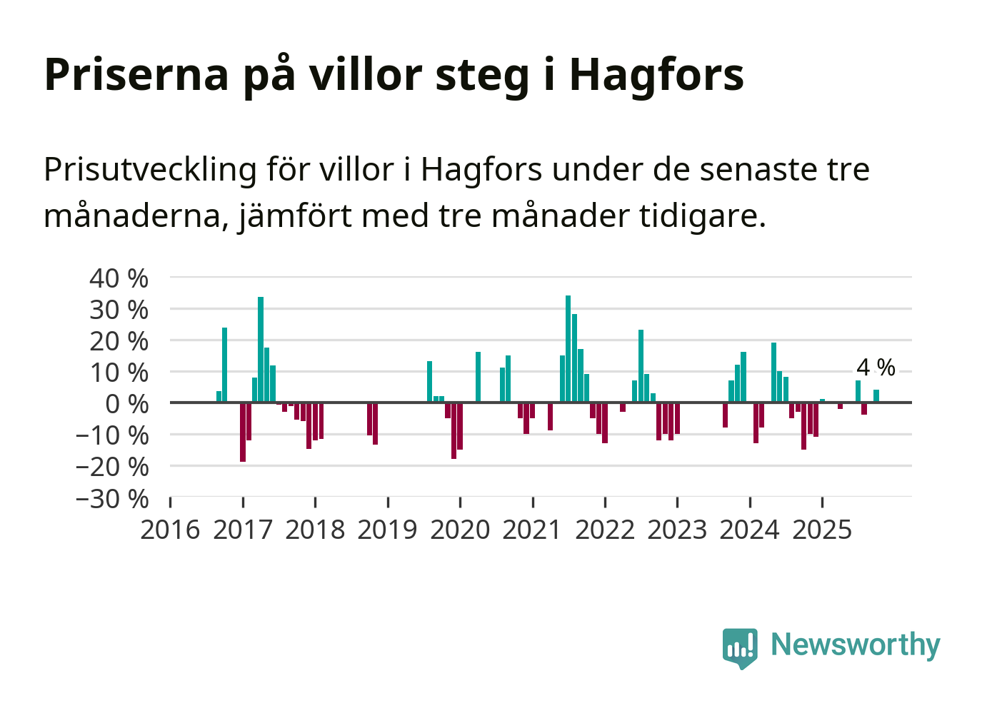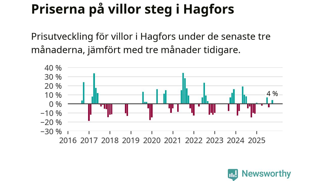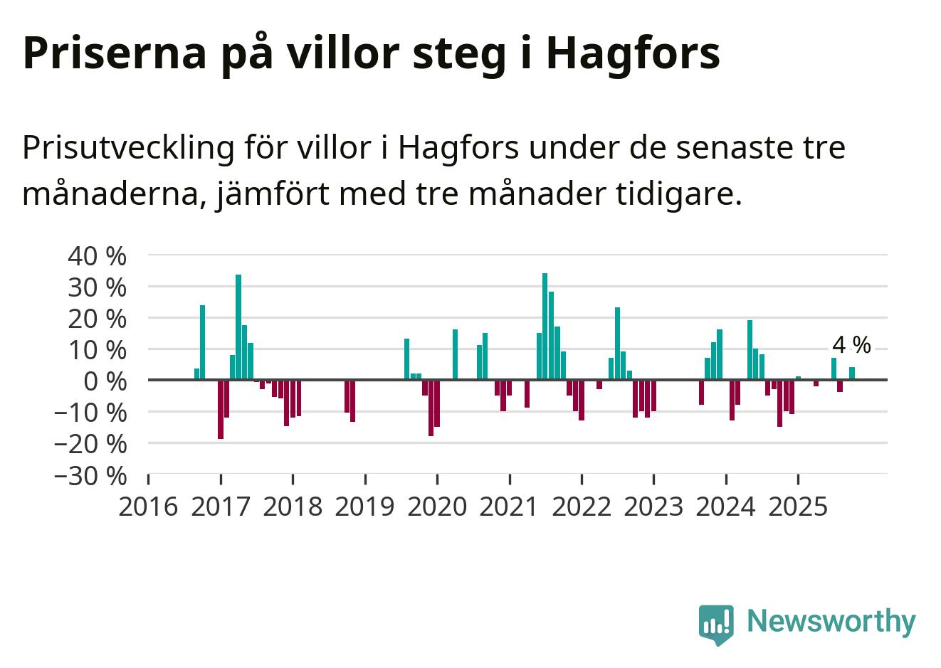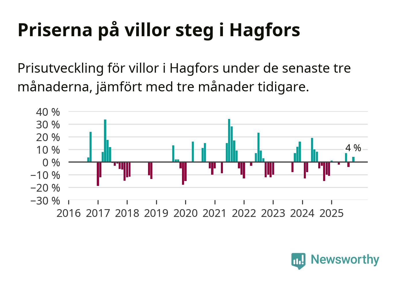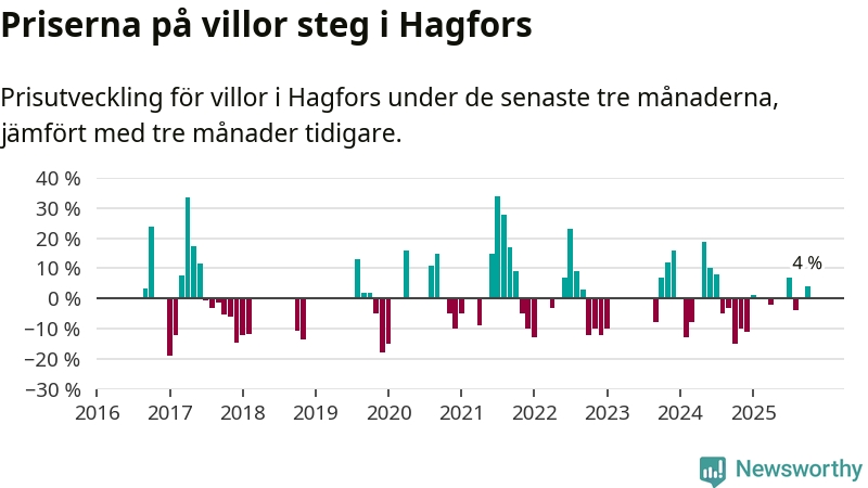 Statistiken visar även på en kännbar prisuppgång i Hagfors kommun. Medelpriset på försäljningarna av villor i kommunen var 4 procent högre än för tre månader sedan. I hela Värmland däremot sjunker villapriserna. I hela länet noterades en prisnedgång på 1 procent.