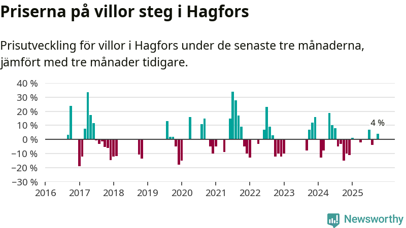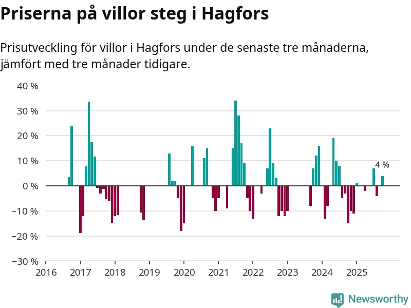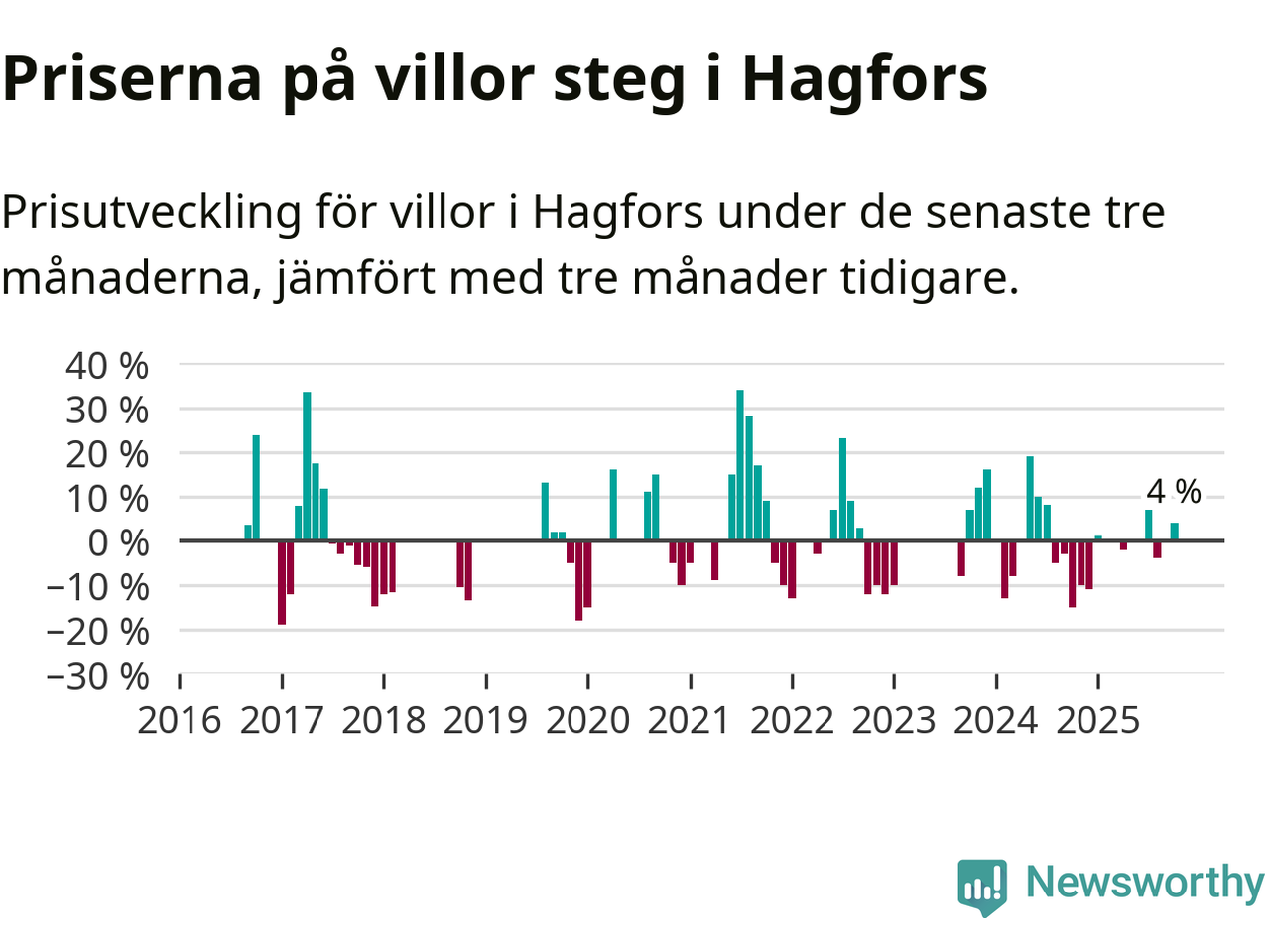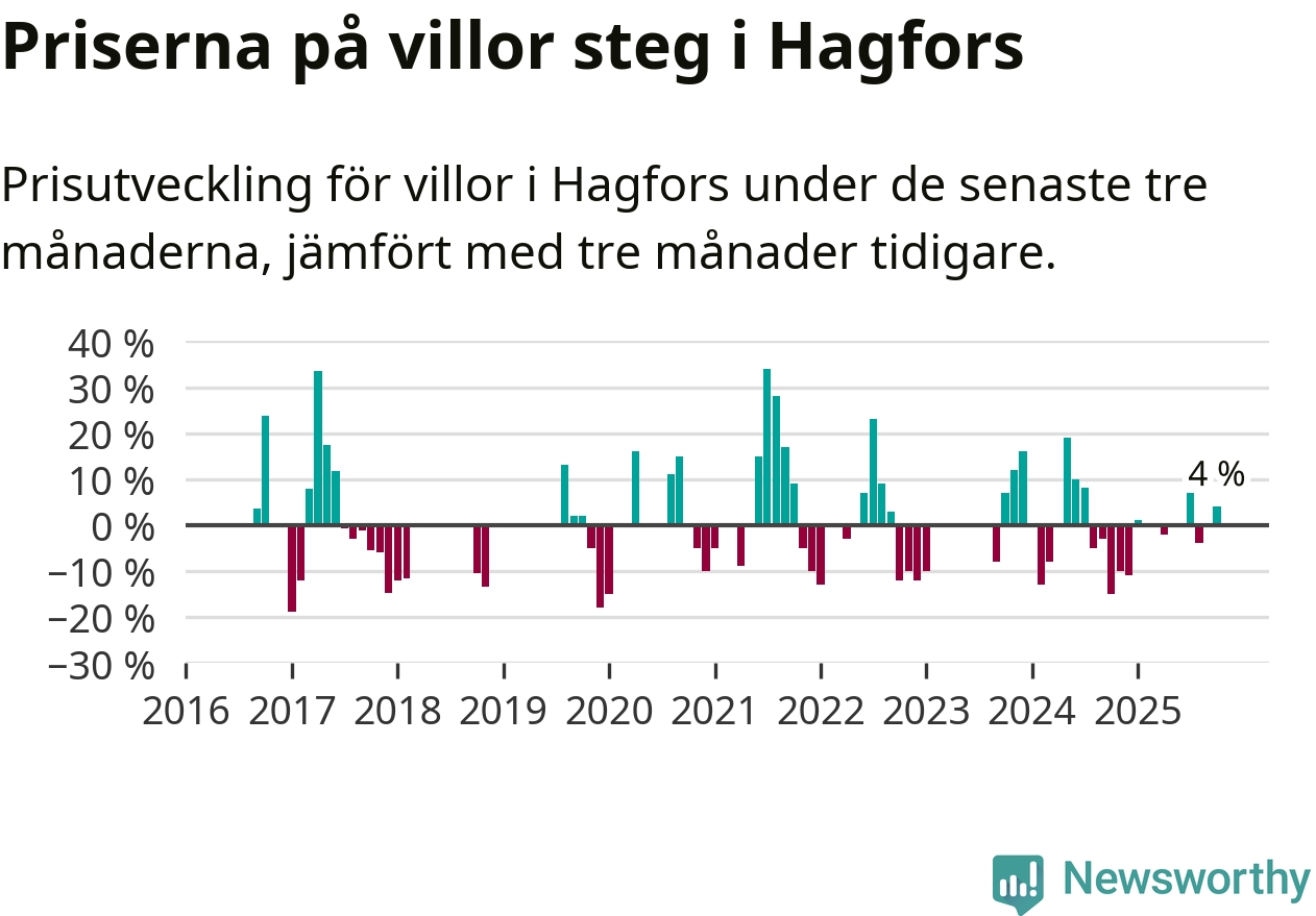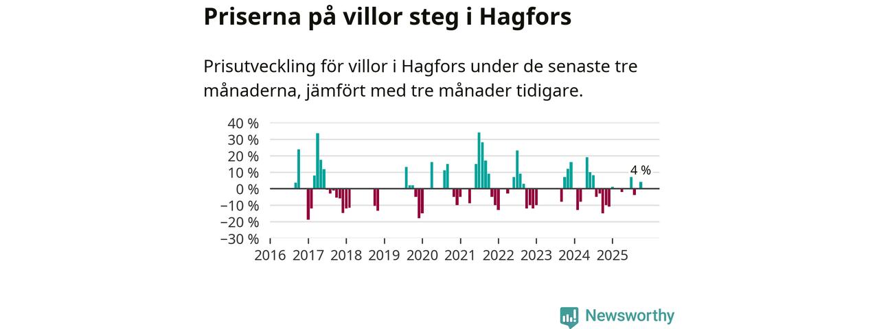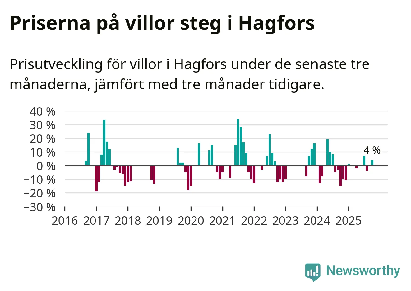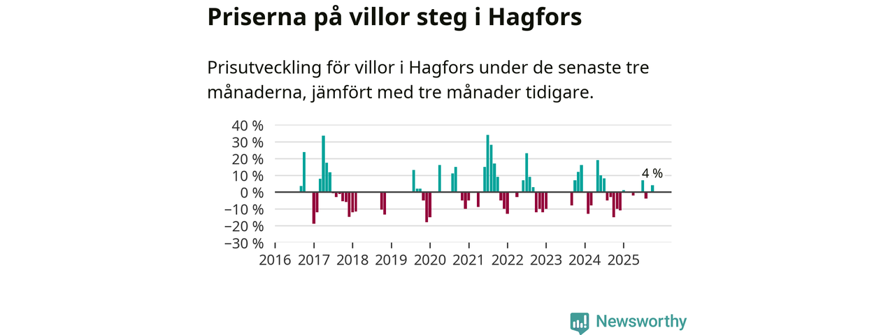 Statistiken visar även på en kännbar prisuppgång i Hagfors kommun. Medelpriset på försäljningarna av villor i kommunen var 4 procent högre än för tre månader sedan. I hela Värmland däremot sjunker villapriserna. I hela länet noterades en prisnedgång på 1 procent.