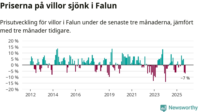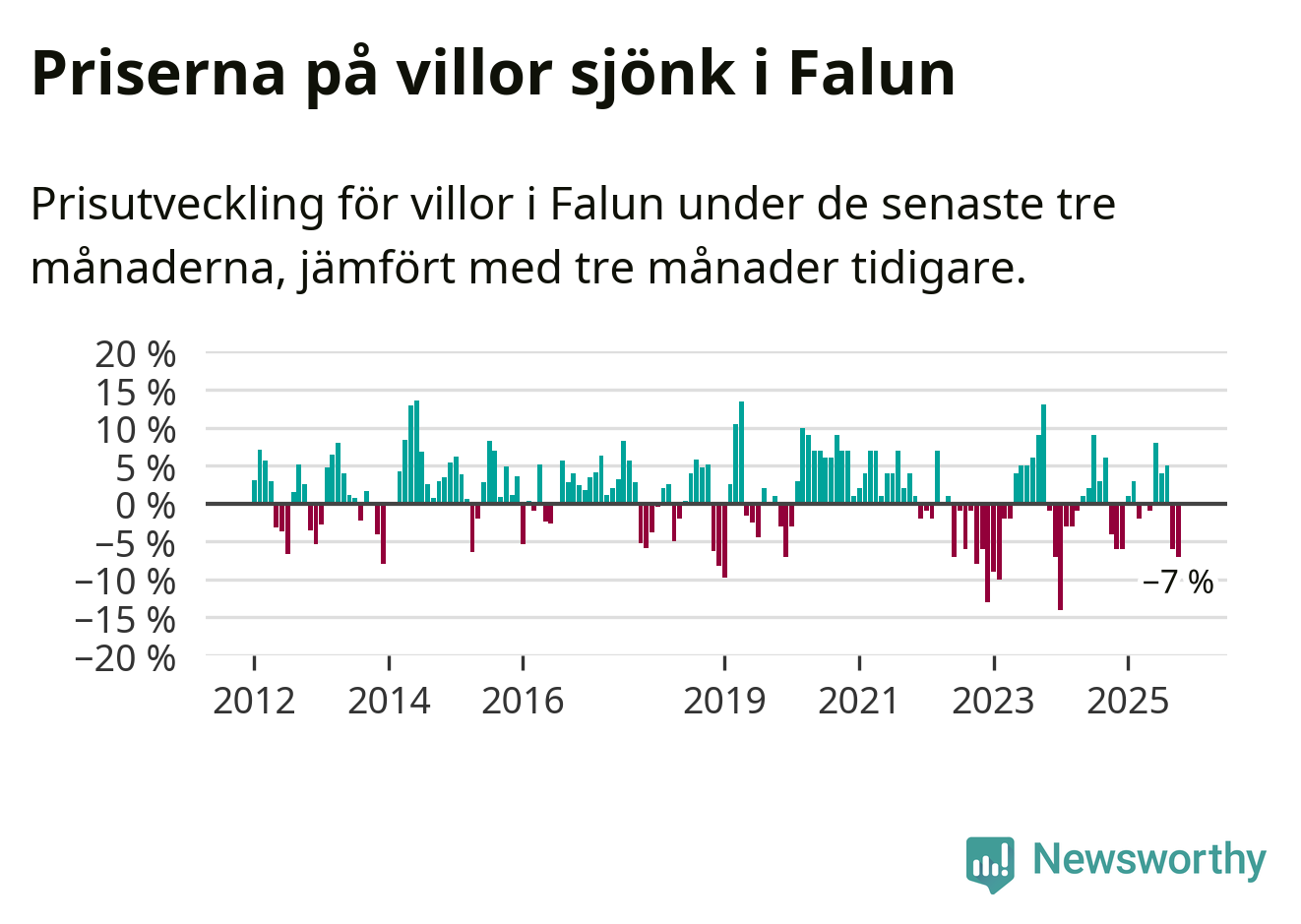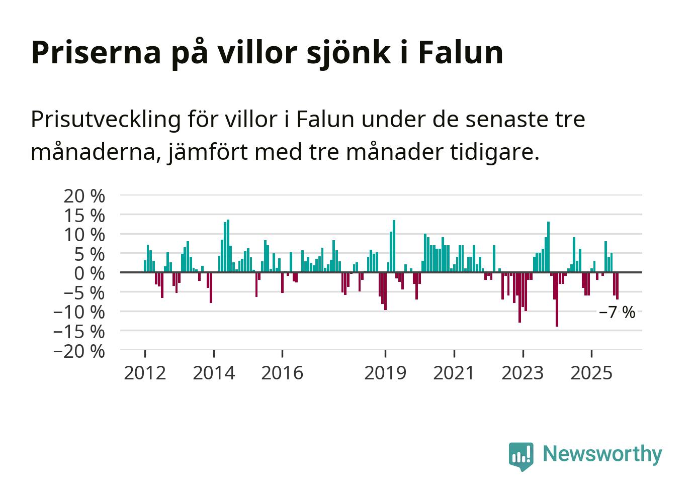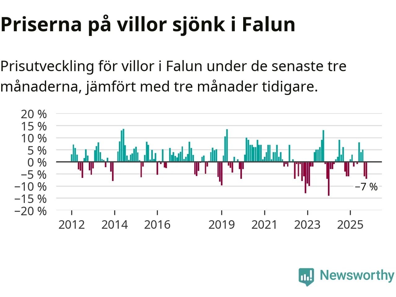 Villapriserna har gått ner i Falu kommun. Medelpriset på försäljningarna under de senaste tre månaderna visar på en nedgång med 7 procent.