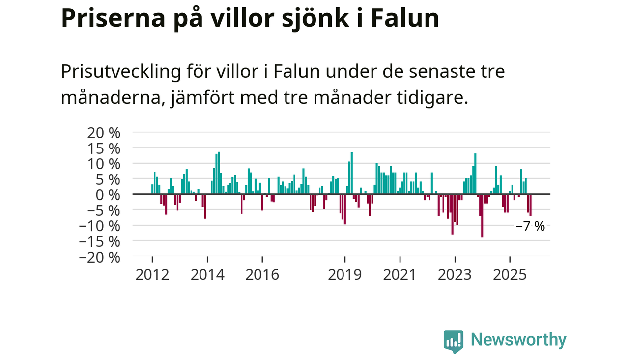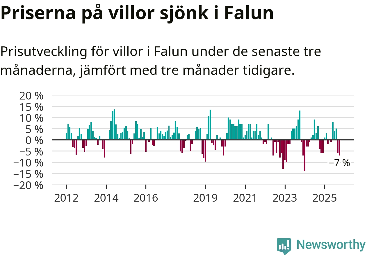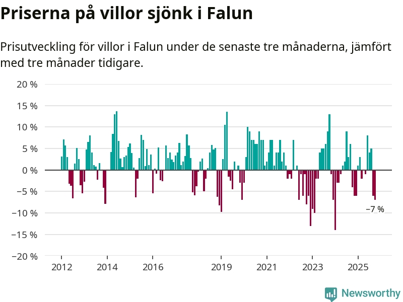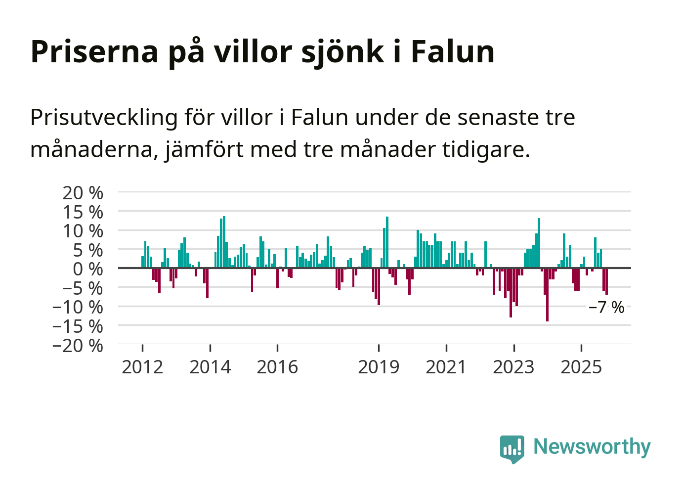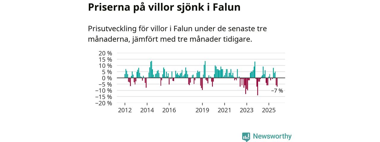 Villapriserna har gått ner i Falu kommun. Medelpriset på försäljningarna under de senaste tre månaderna visar på en nedgång med 7 procent.