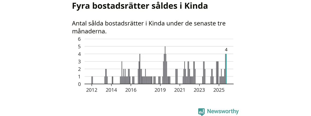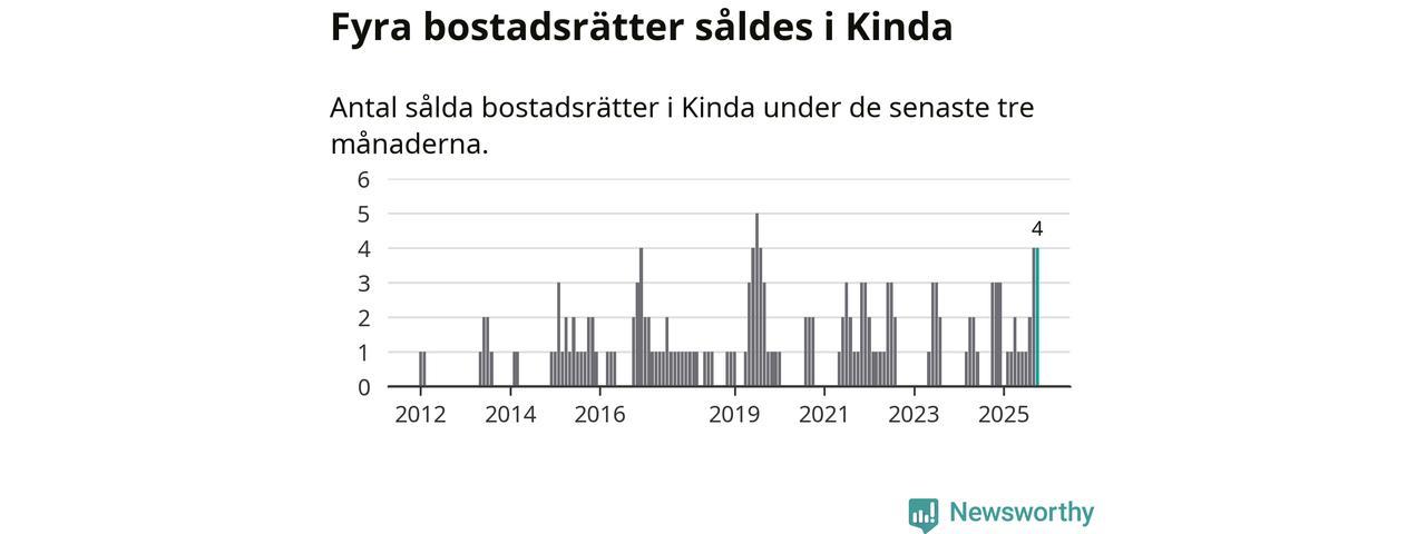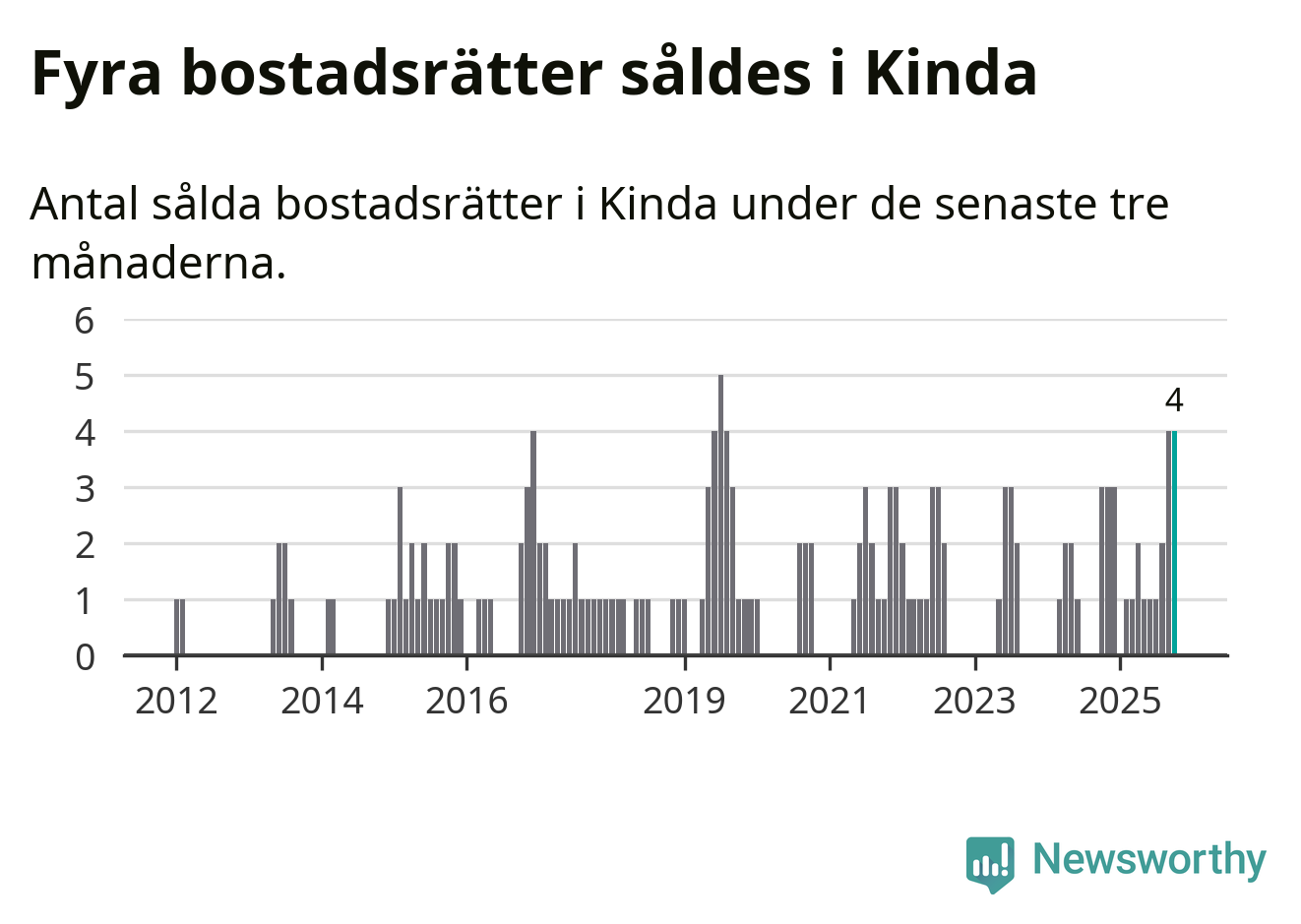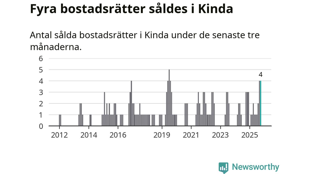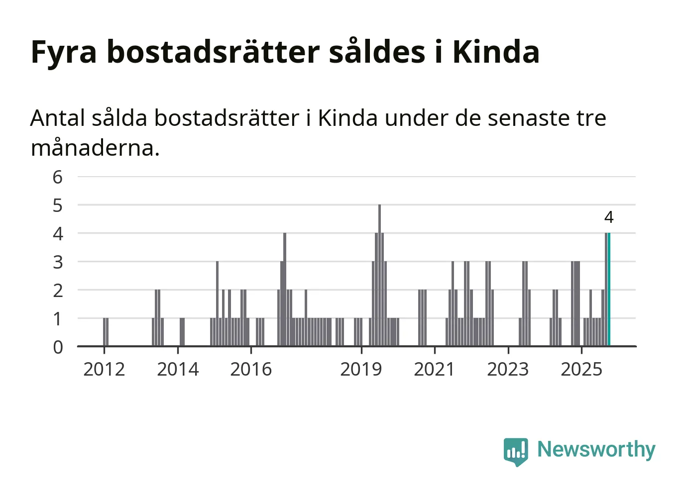 Mellan augusti och oktober gjordes sammanlagt fyra affärer med bostadsrätter i Kinda kommun. Det kan jämföras med tre vid motsvarande tid i fjol.