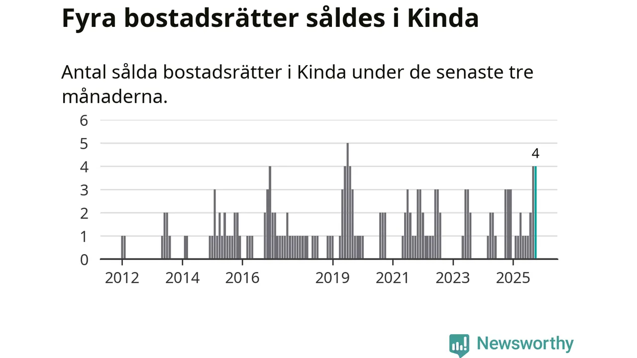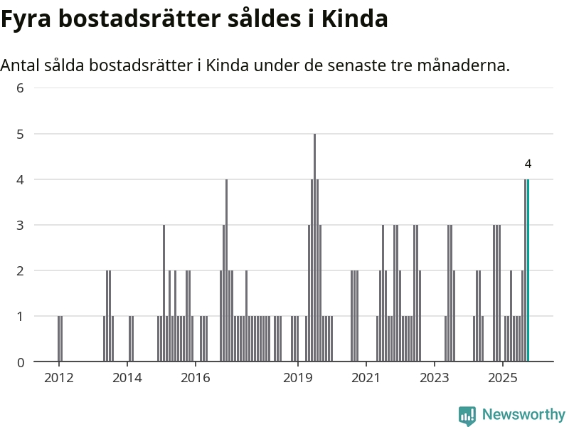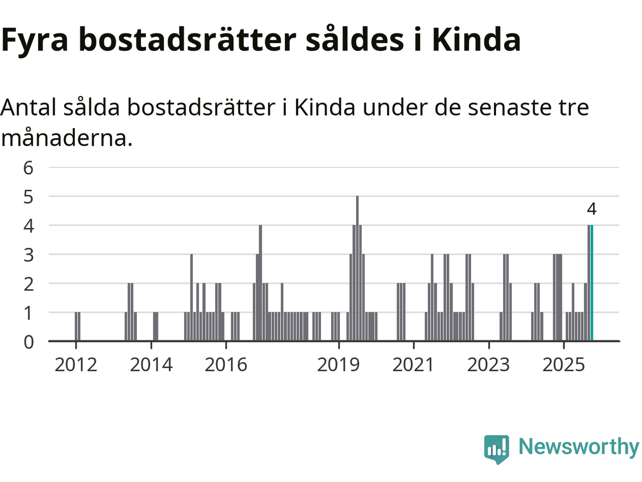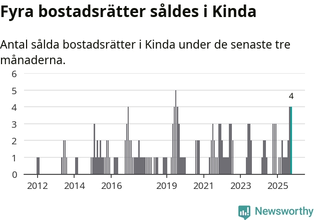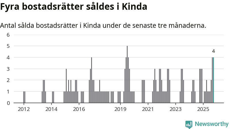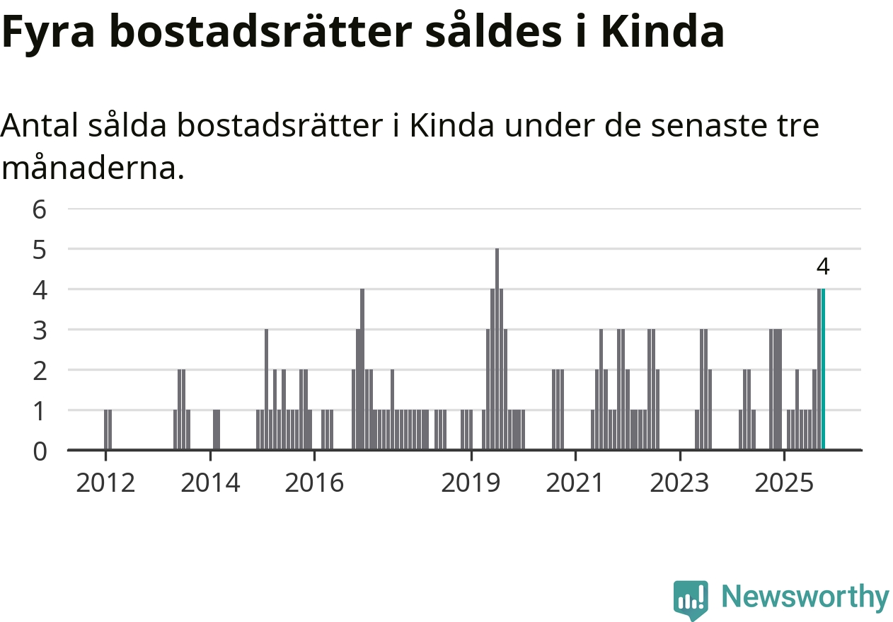 Mellan augusti och oktober gjordes sammanlagt fyra affärer med bostadsrätter i Kinda kommun. Det kan jämföras med tre vid motsvarande tid i fjol.