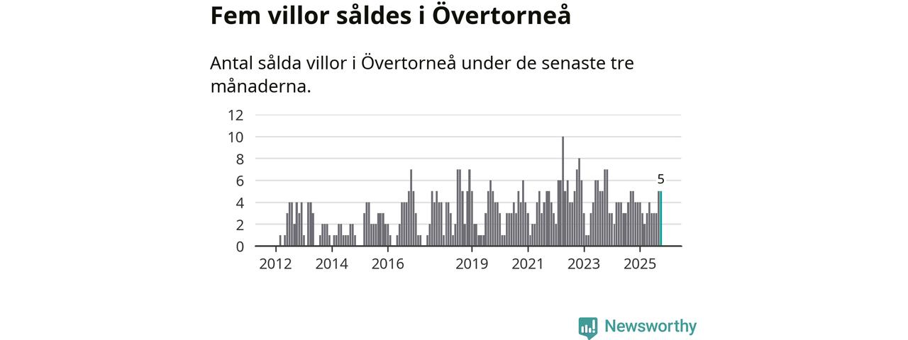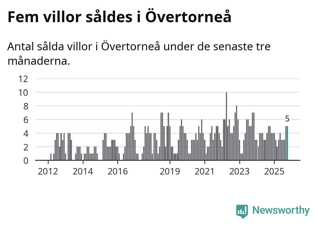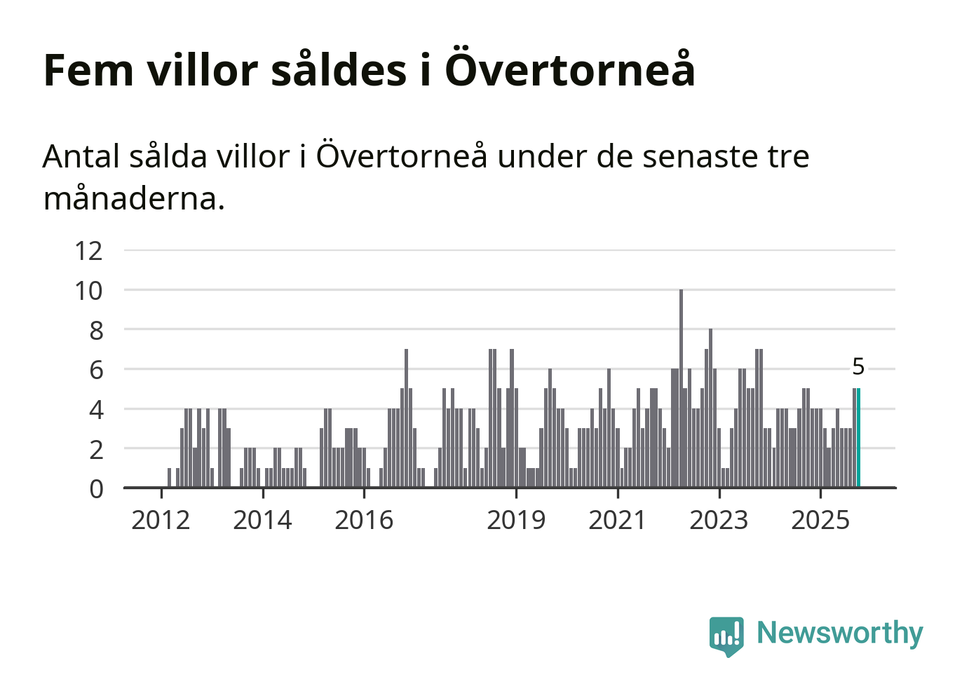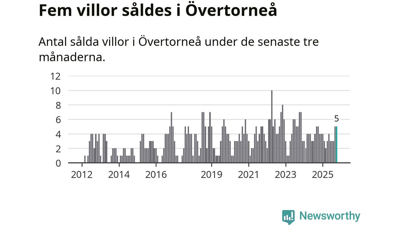 Mellan augusti och oktober gjordes sammanlagt fem affärer med villor i Övertorneå kommun. Det är lika många affärer som vid motsvarande tid i fjol.