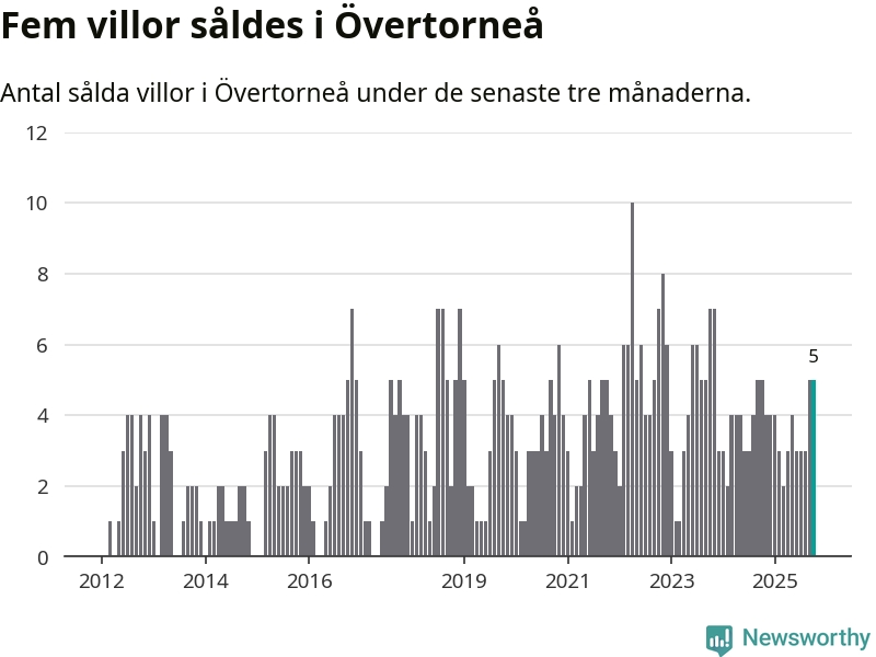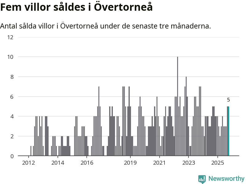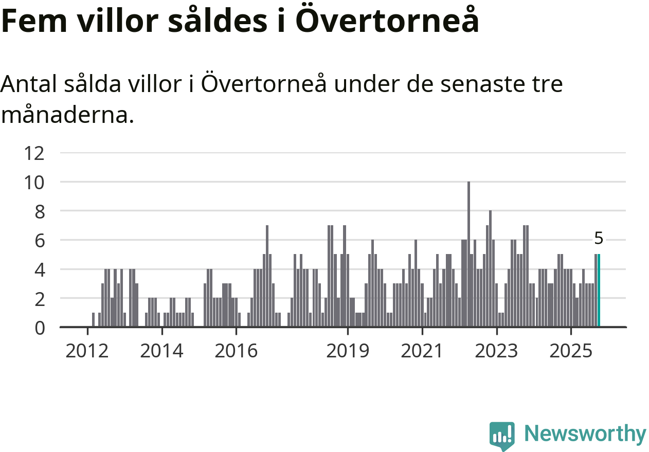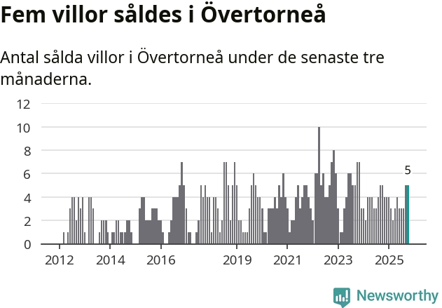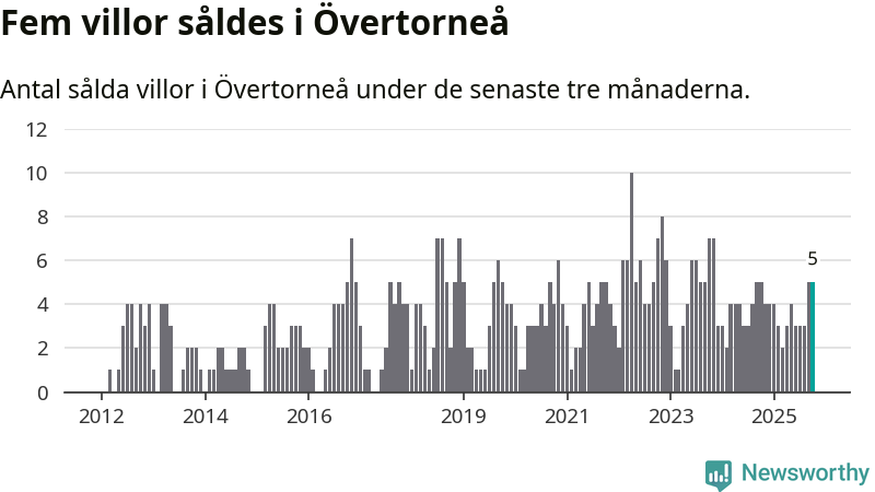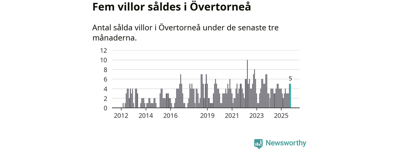 Mellan augusti och oktober gjordes sammanlagt fem affärer med villor i Övertorneå kommun. Det är lika många affärer som vid motsvarande tid i fjol.