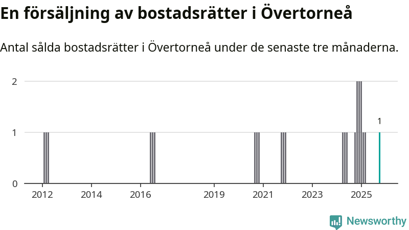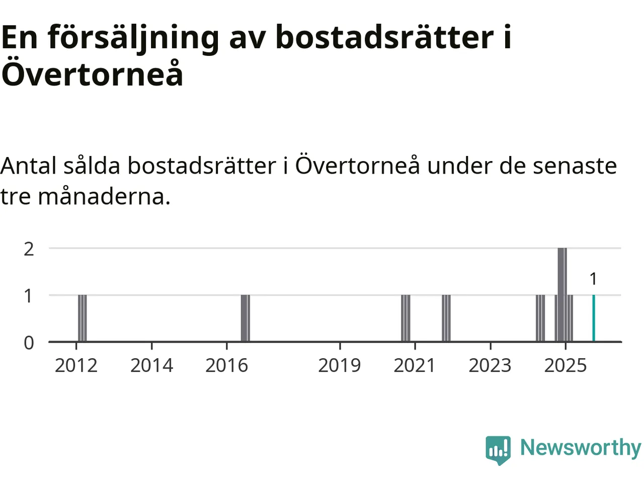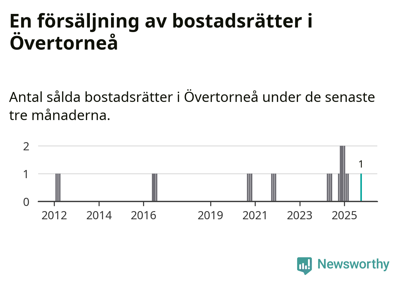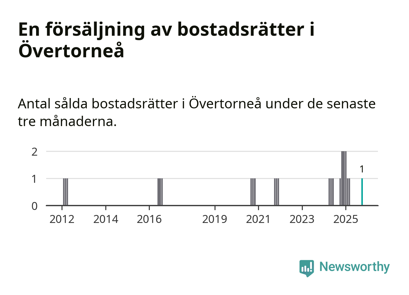 Mellan augusti och oktober gjordes sammanlagt en affär med bostadsrätter i Övertorneå kommun. Det är lika många affärer som vid motsvarande tid i fjol.