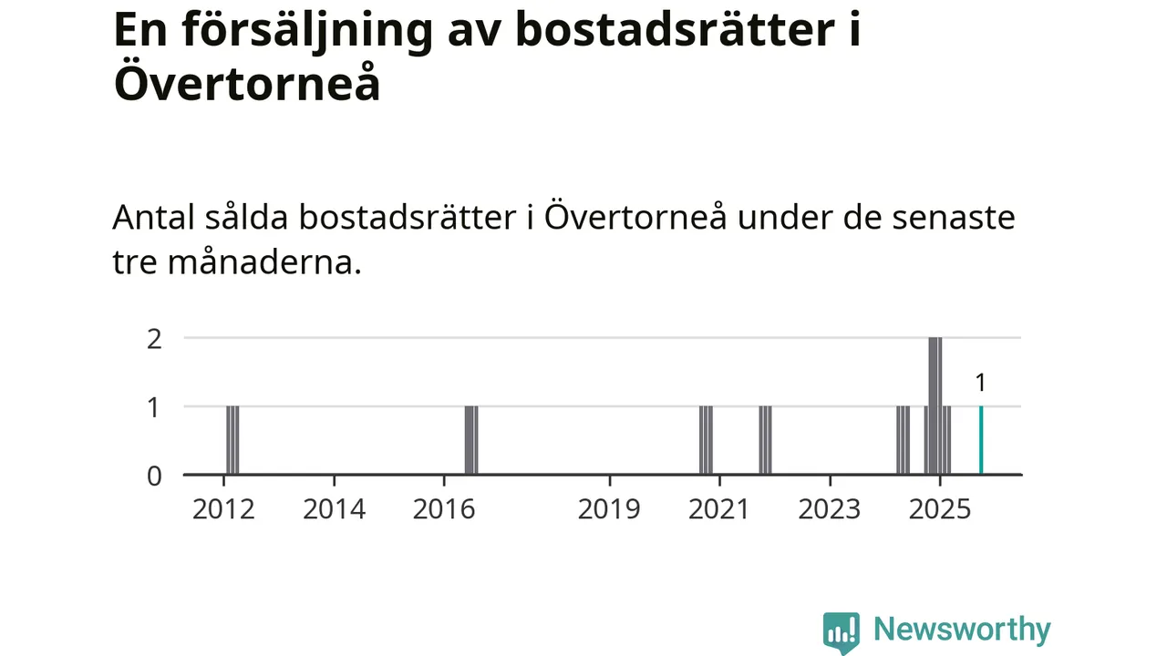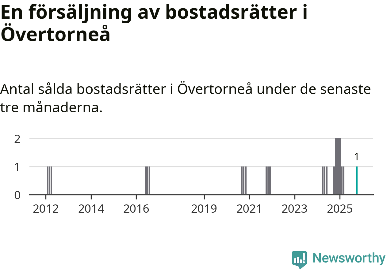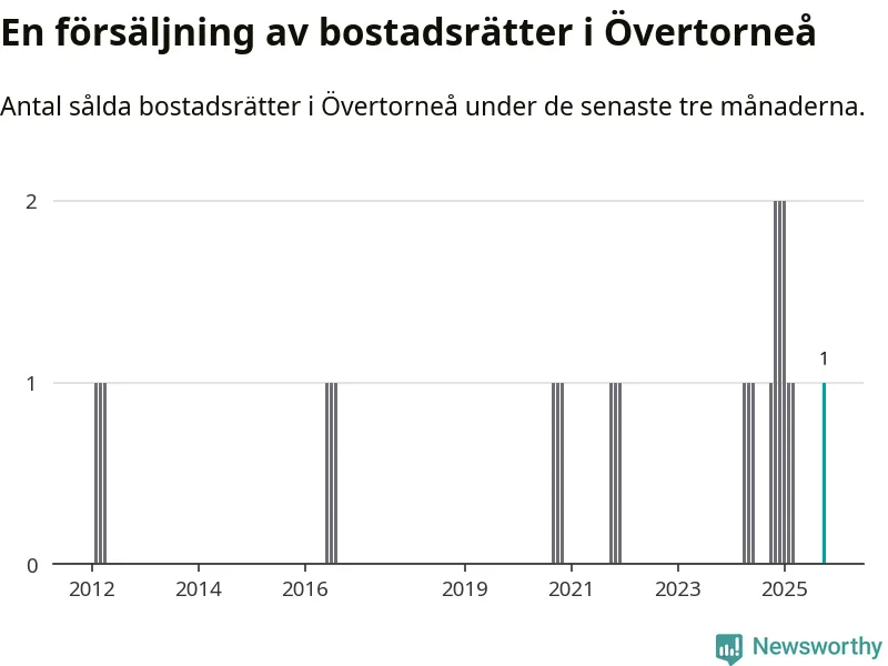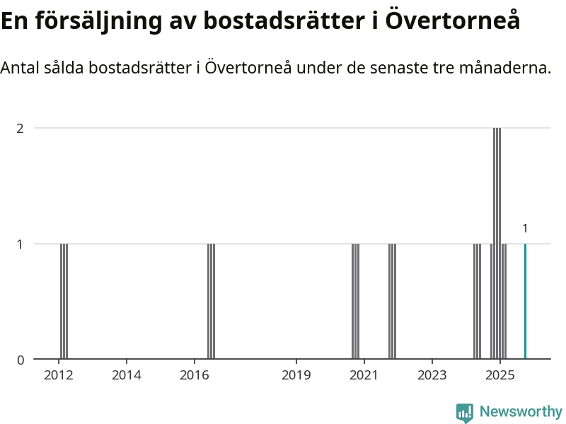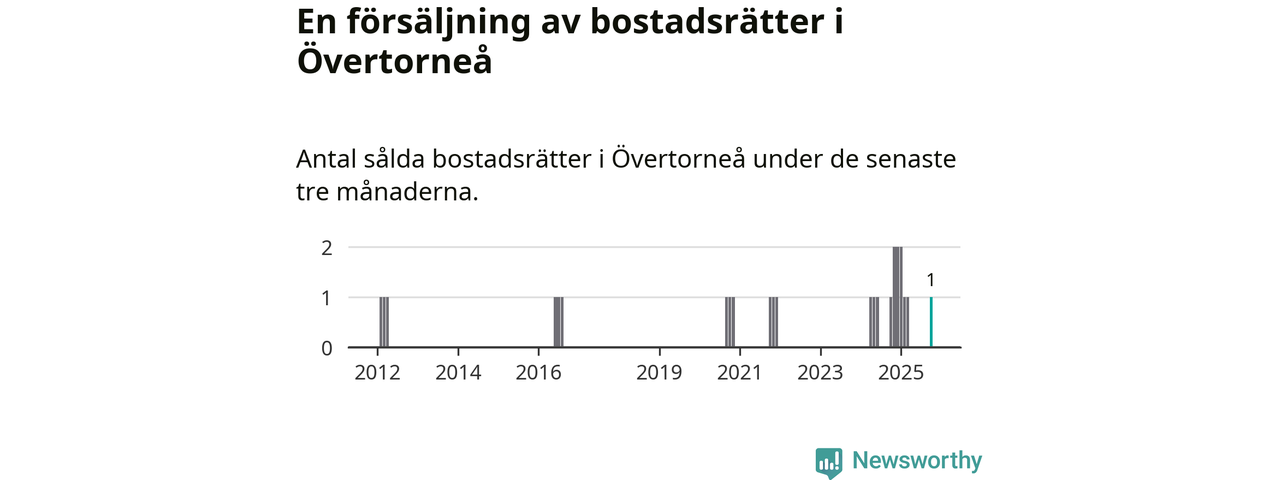 Mellan augusti och oktober gjordes sammanlagt en affär med bostadsrätter i Övertorneå kommun. Det är lika många affärer som vid motsvarande tid i fjol.