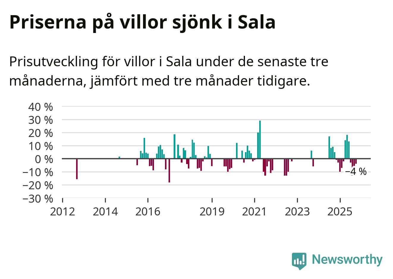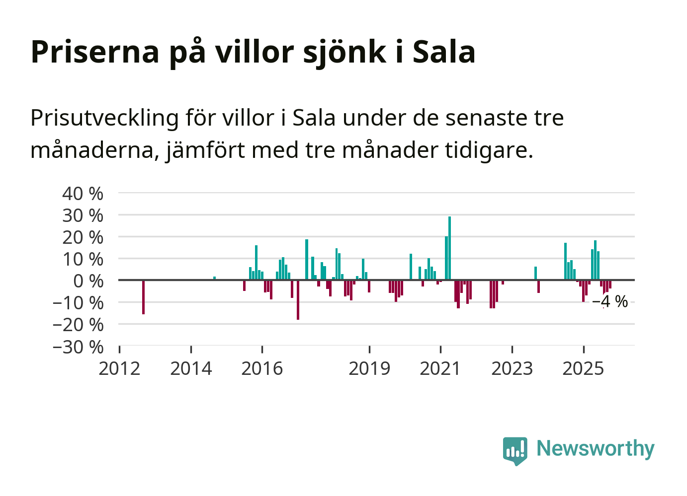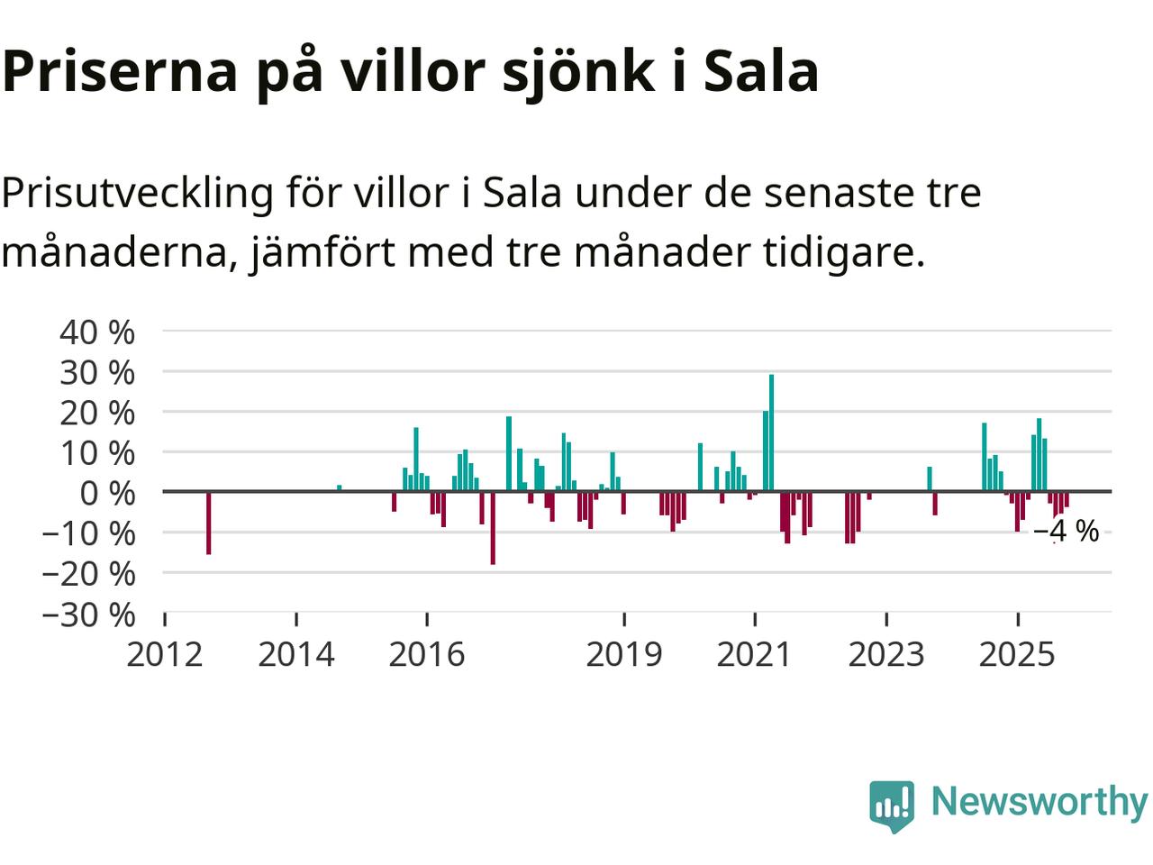 Statistiken visar även på en kännbar prisnedgång i Sala kommun. Medelpriset på försäljningarna av villor i kommunen var 4 procent lägre än för tre månader sedan. Även i hela Västmanland sjunker villapriserna. I hela länet noterades en prisnedgång på 1 procent.