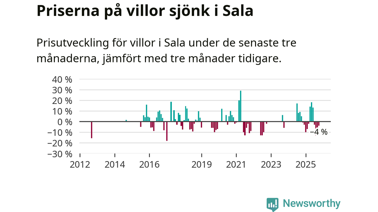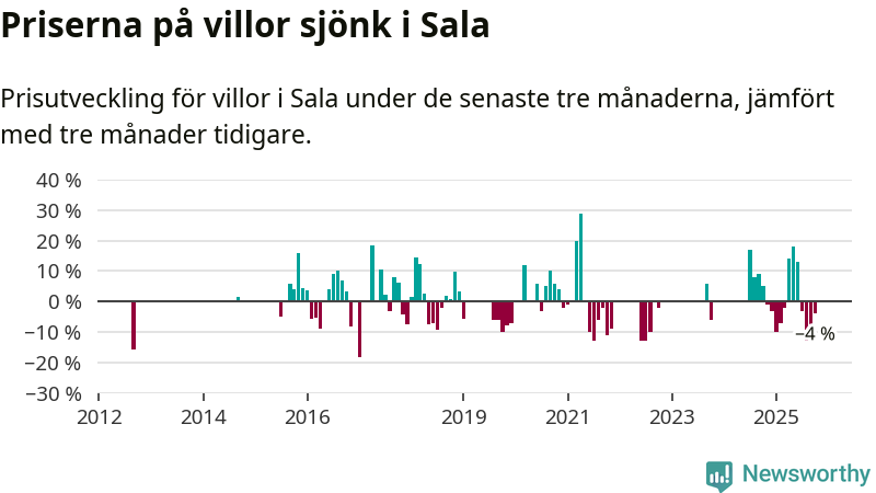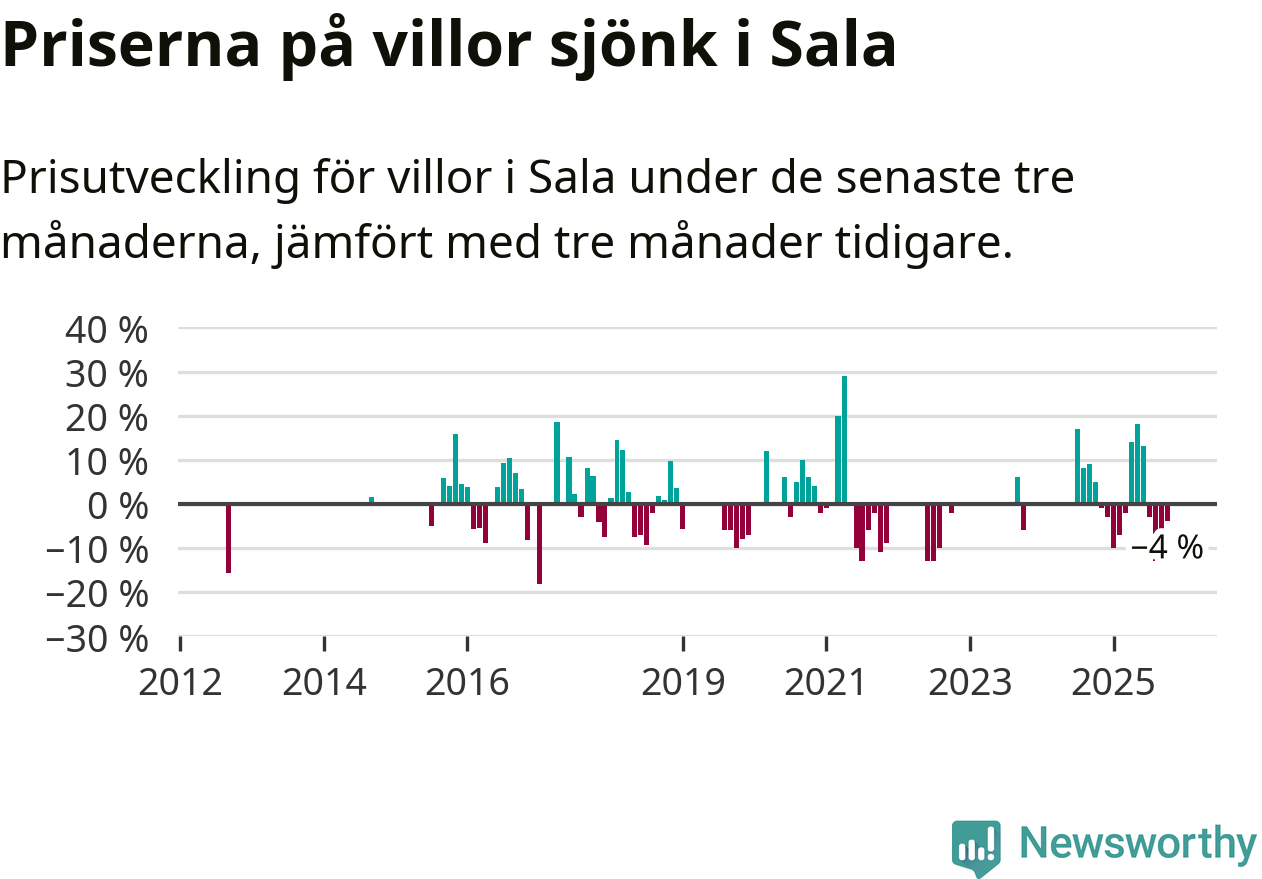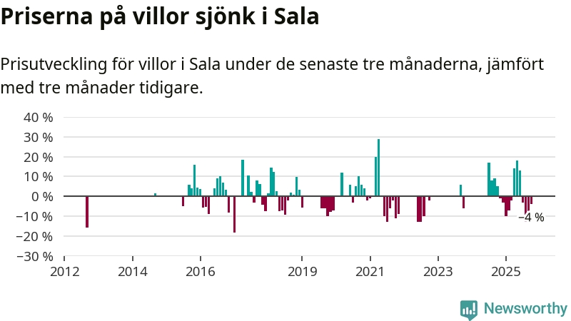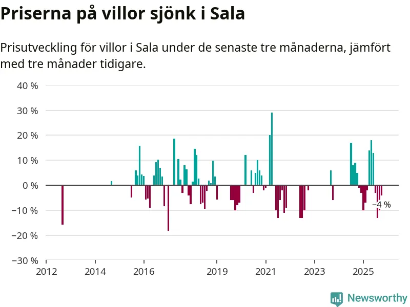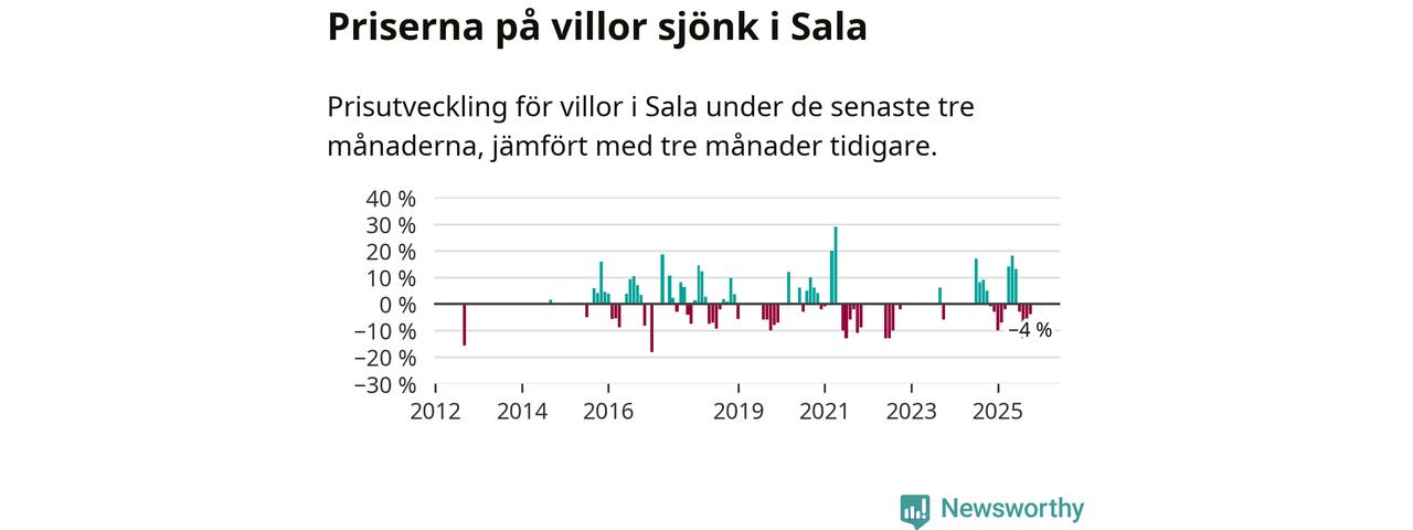 Statistiken visar även på en kännbar prisnedgång i Sala kommun. Medelpriset på försäljningarna av villor i kommunen var 4 procent lägre än för tre månader sedan. Även i hela Västmanland sjunker villapriserna. I hela länet noterades en prisnedgång på 1 procent.