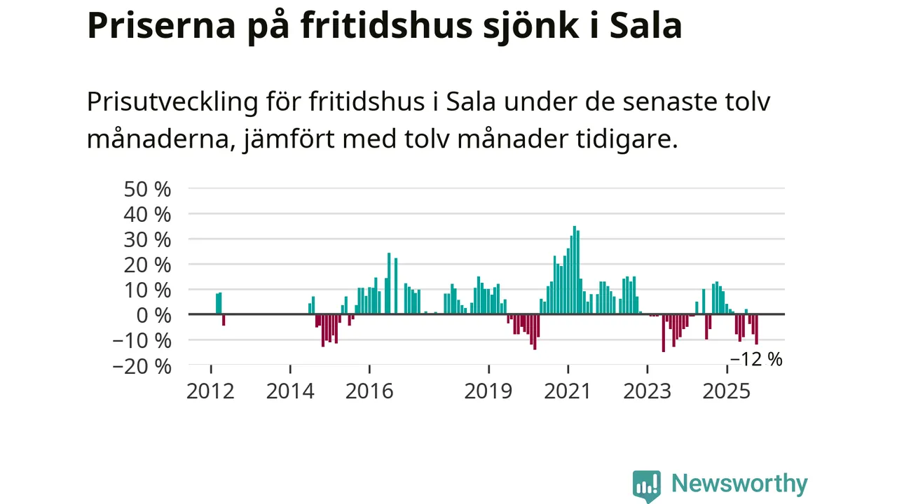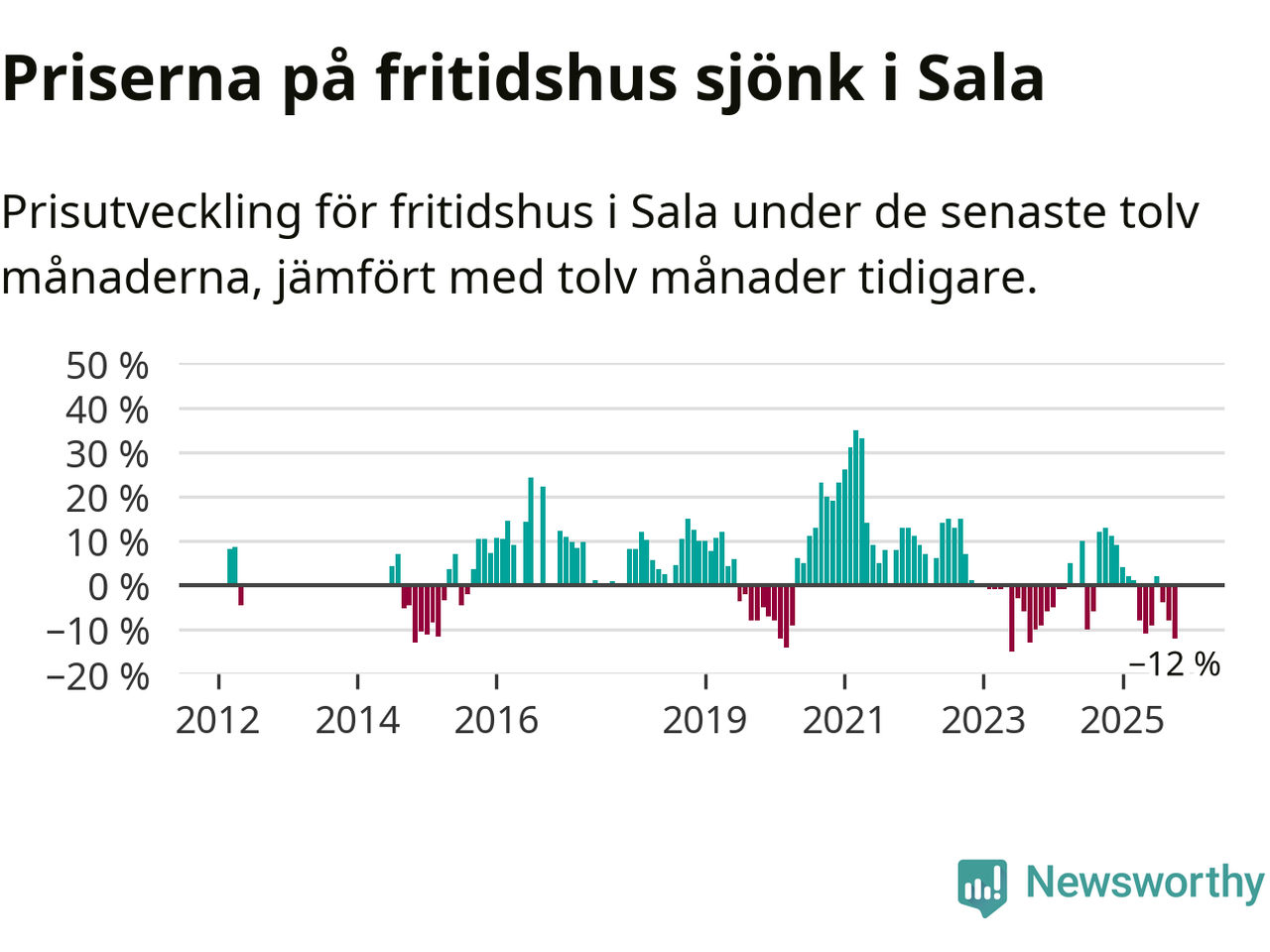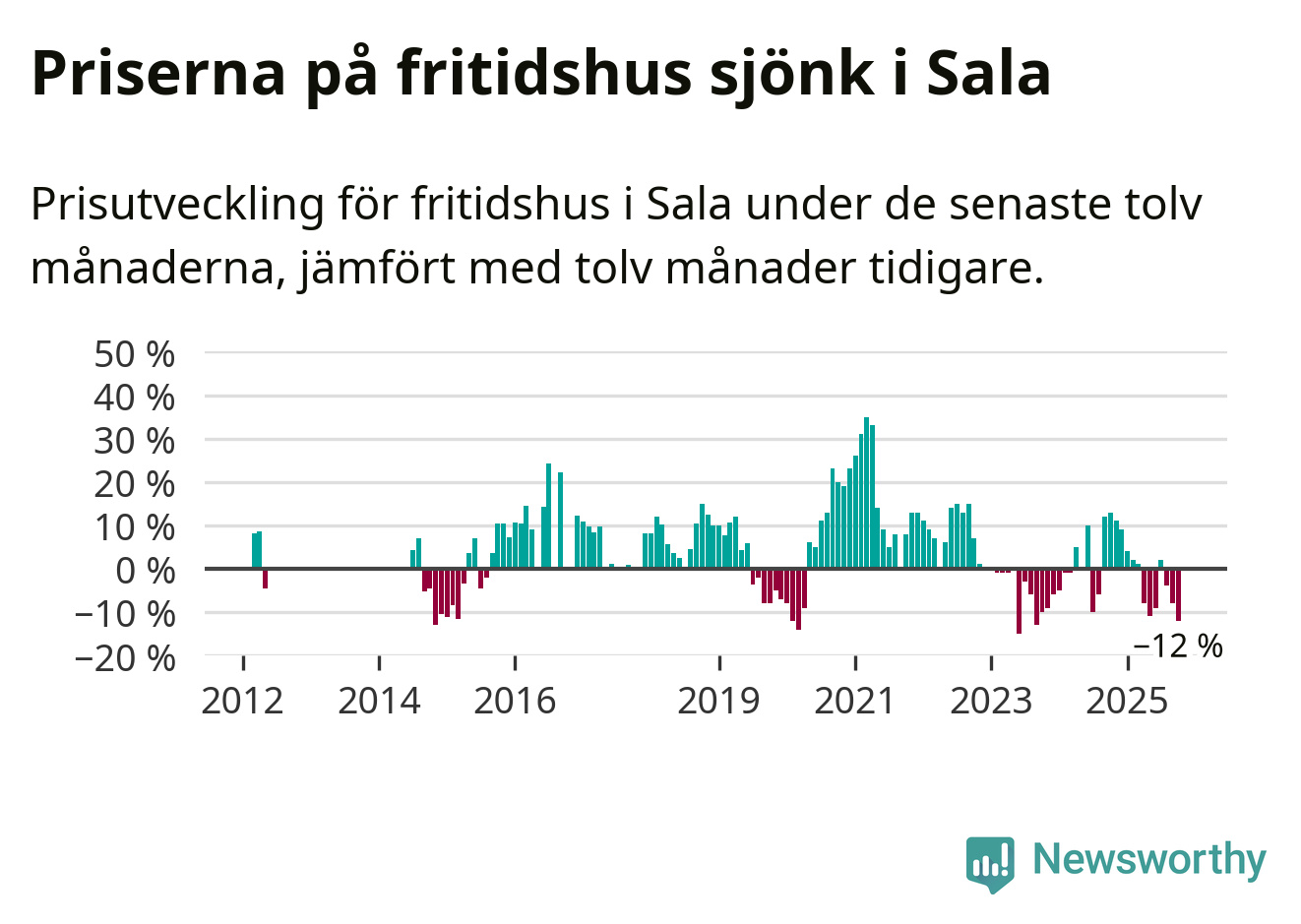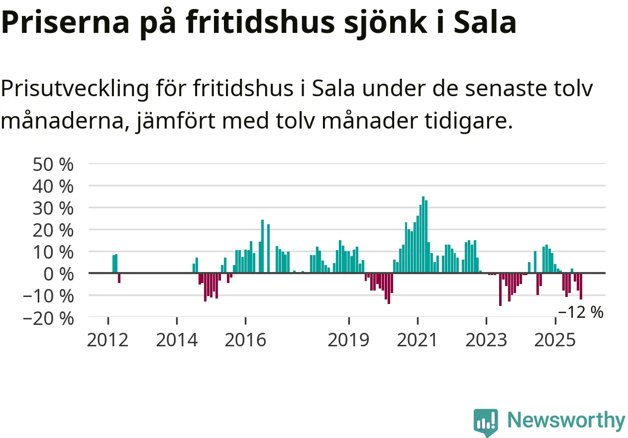 Priserna på fritidshus har gått ner i Sala kommun. Medelpriset på försäljningarna under de senaste tolv månaderna visar på en nedgång med 12 procent.