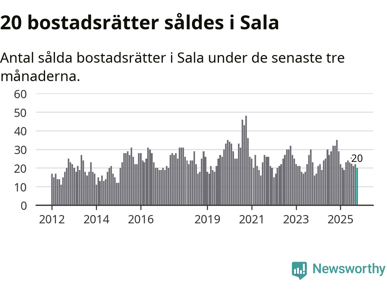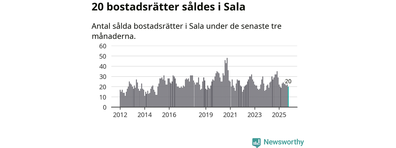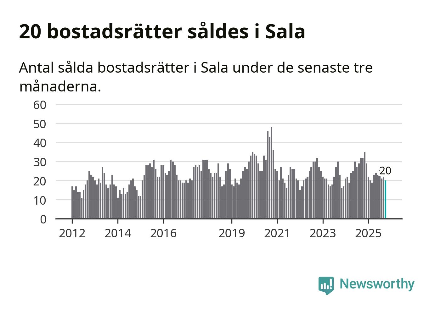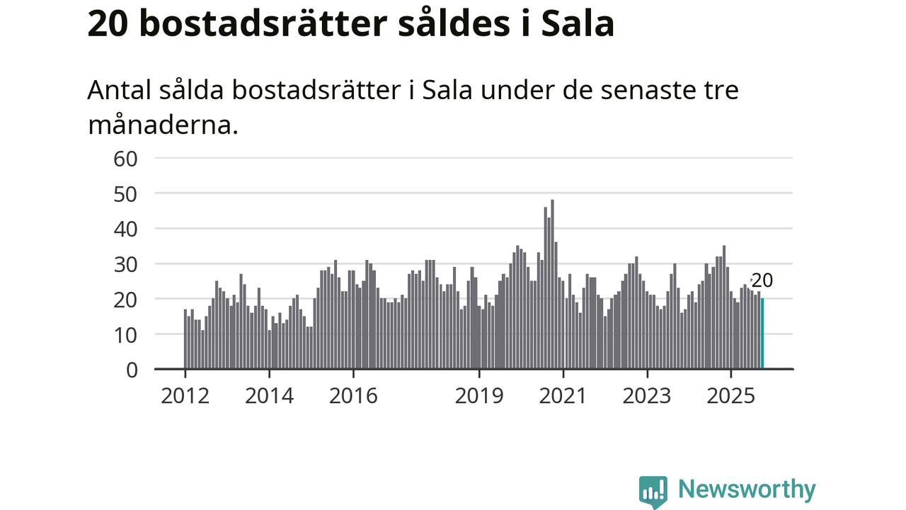 Mellan augusti och oktober såldes 20 bostadsrätter i Sala kommun. Det är relativt få sett till aktiviteten på bostadsmarknaden i kommunen under de senaste tolv månaderna, samt det historiska snittet för den här tiden på året.