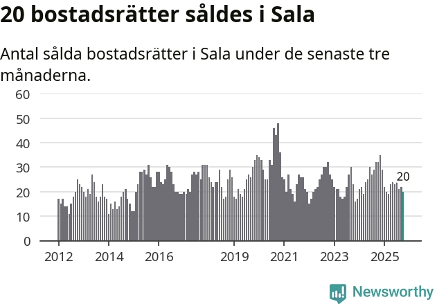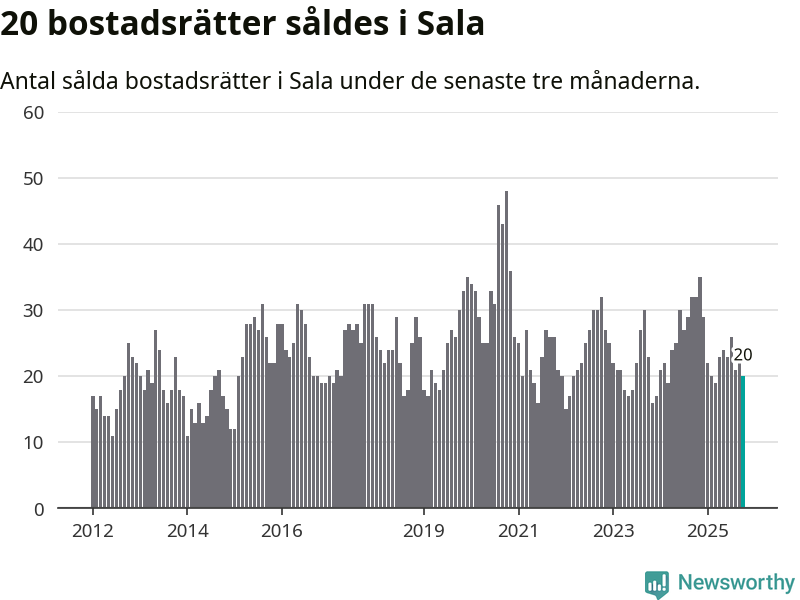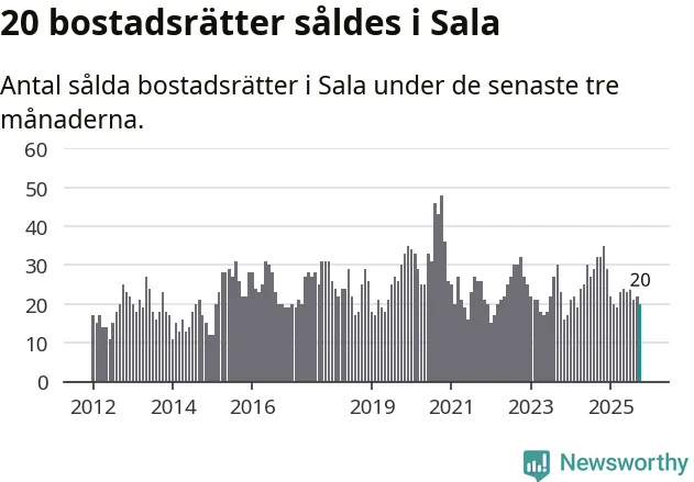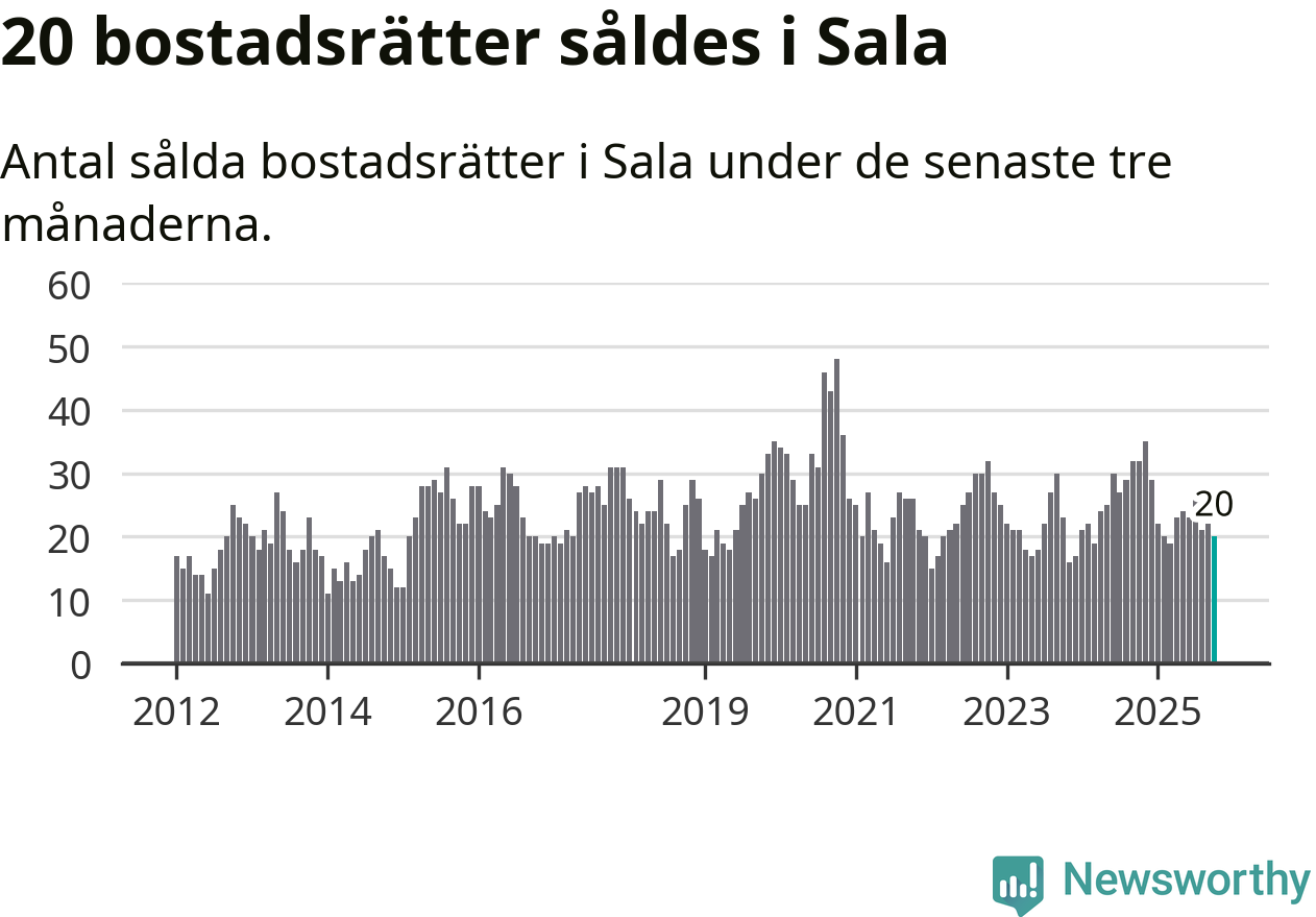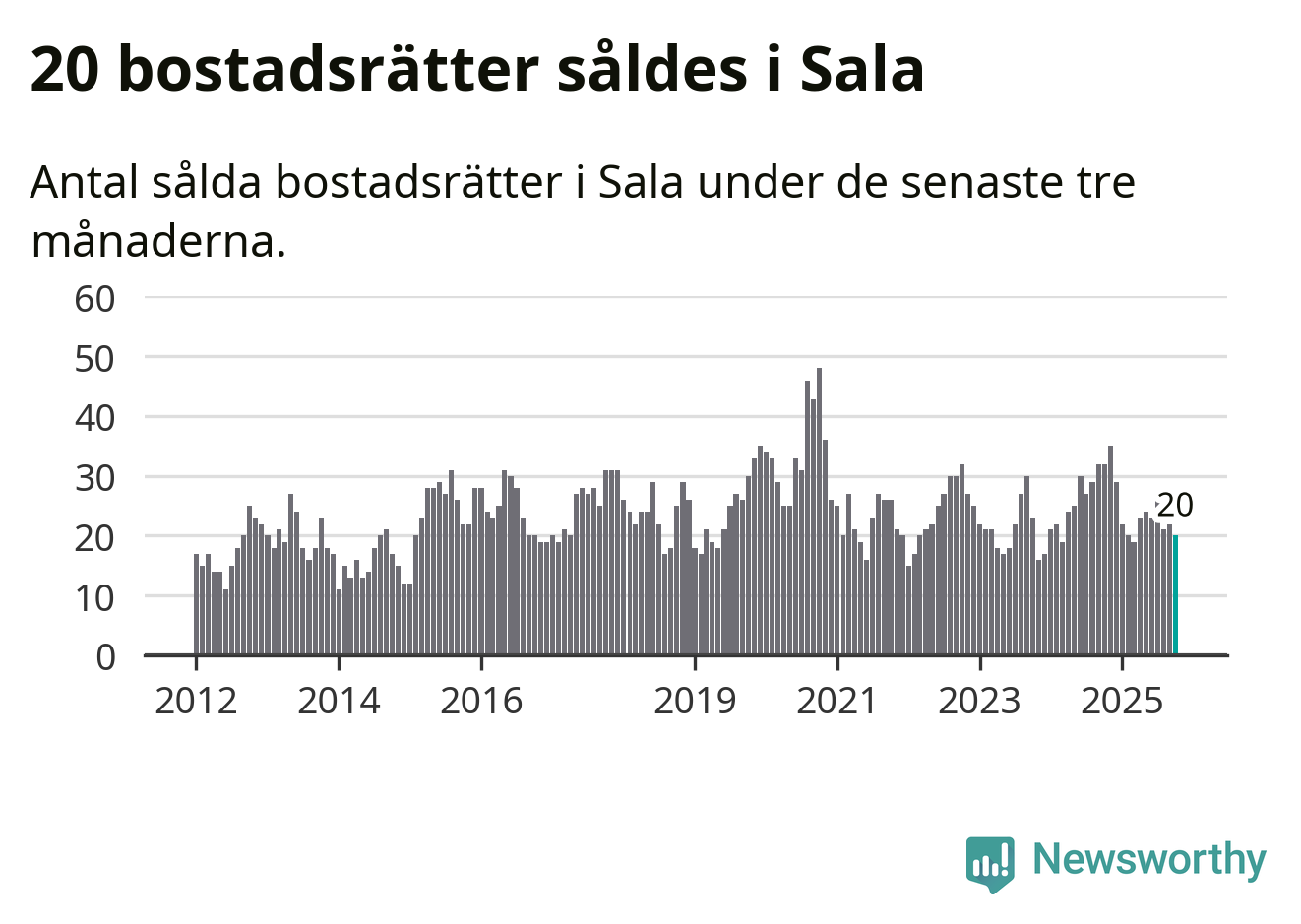 Mellan augusti och oktober såldes 20 bostadsrätter i Sala kommun. Det är relativt få sett till aktiviteten på bostadsmarknaden i kommunen under de senaste tolv månaderna, samt det historiska snittet för den här tiden på året.