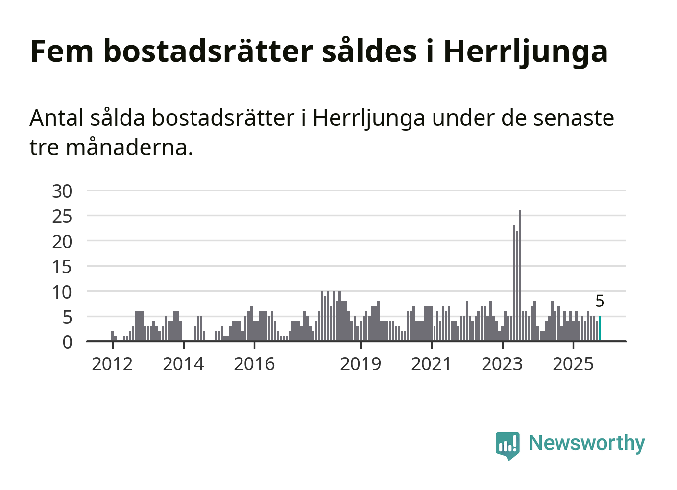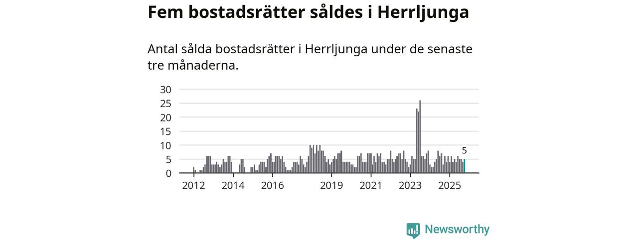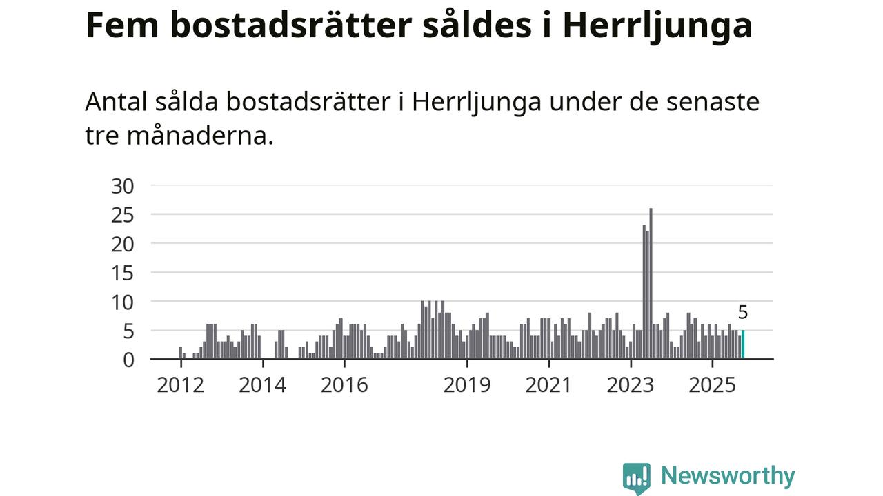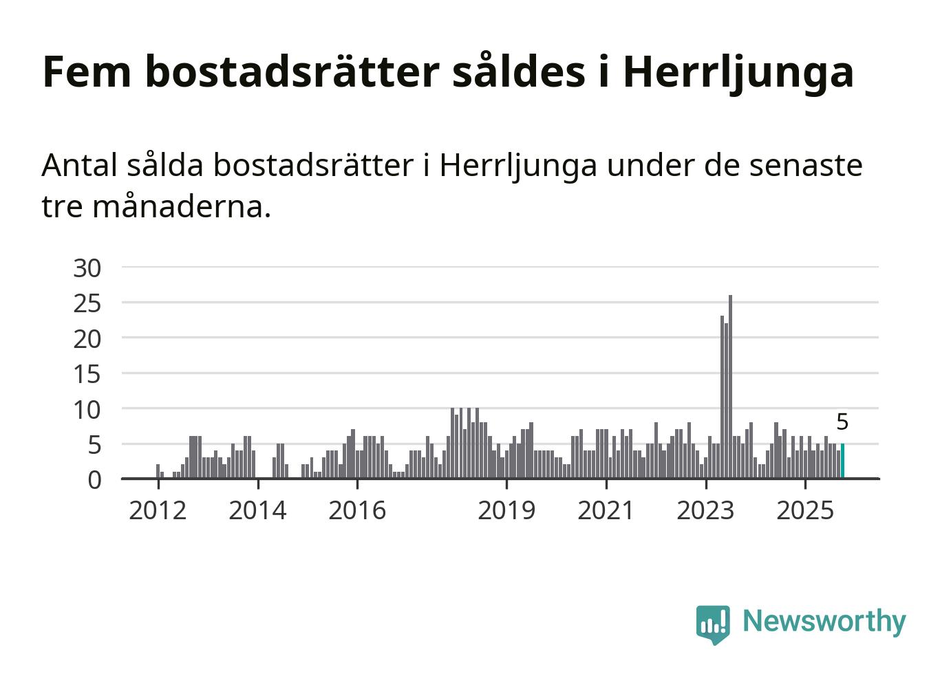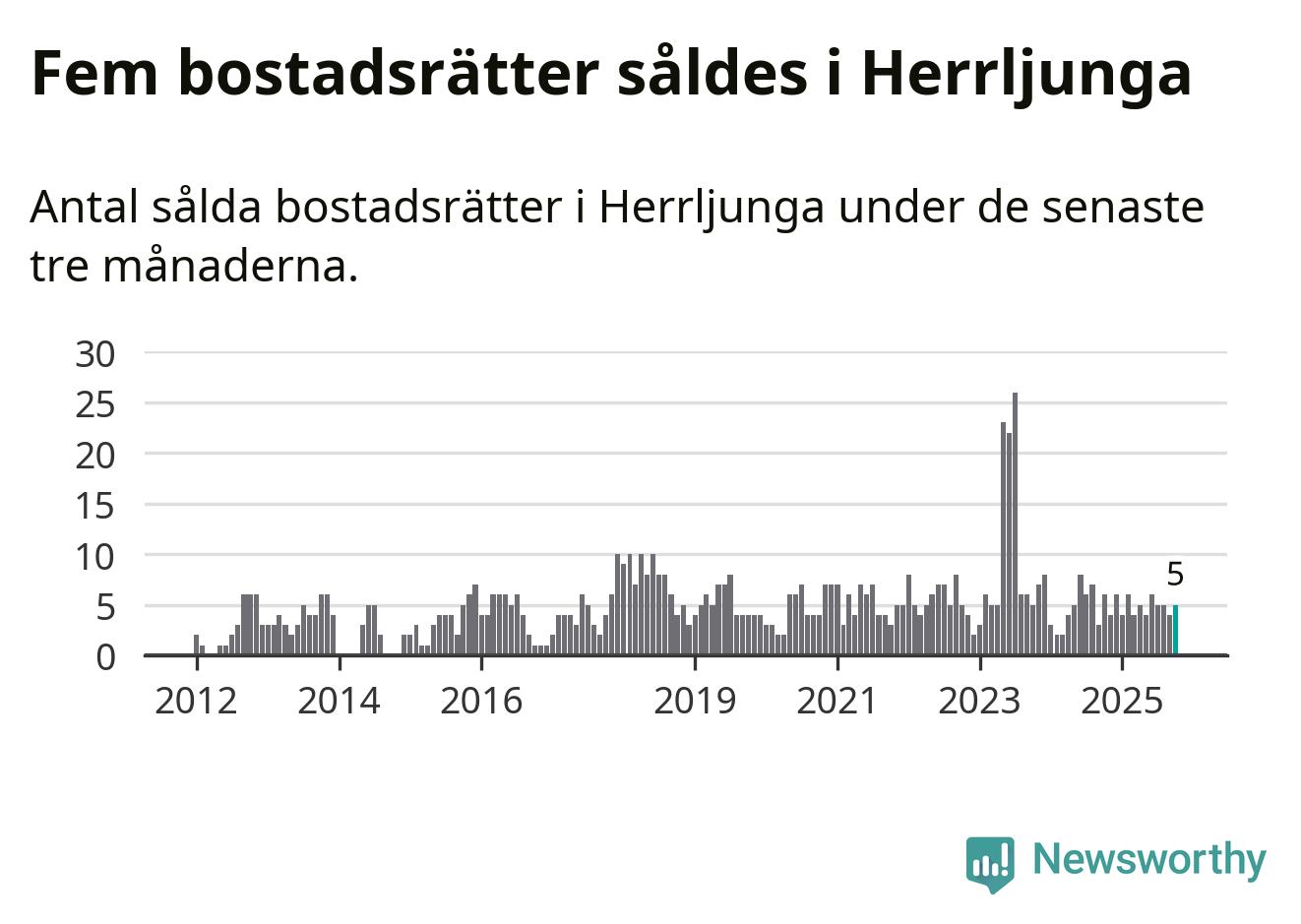 Mellan augusti och oktober gjordes sammanlagt fem affärer med bostadsrätter i Herrljunga kommun. Det kan jämföras med sex vid motsvarande tid i fjol.