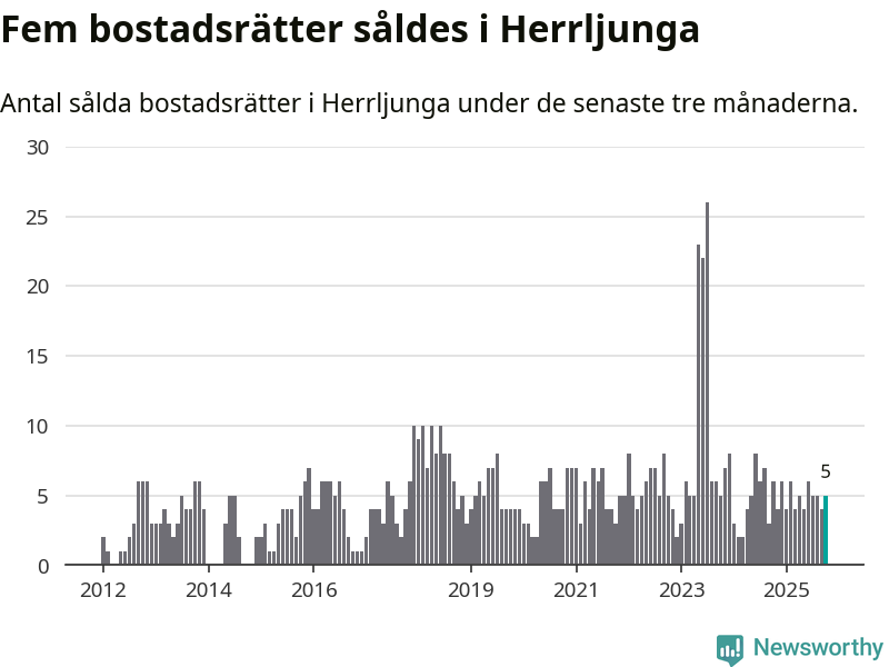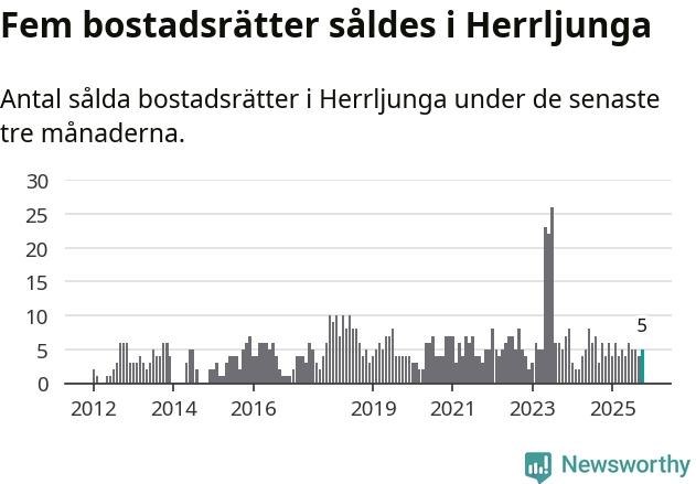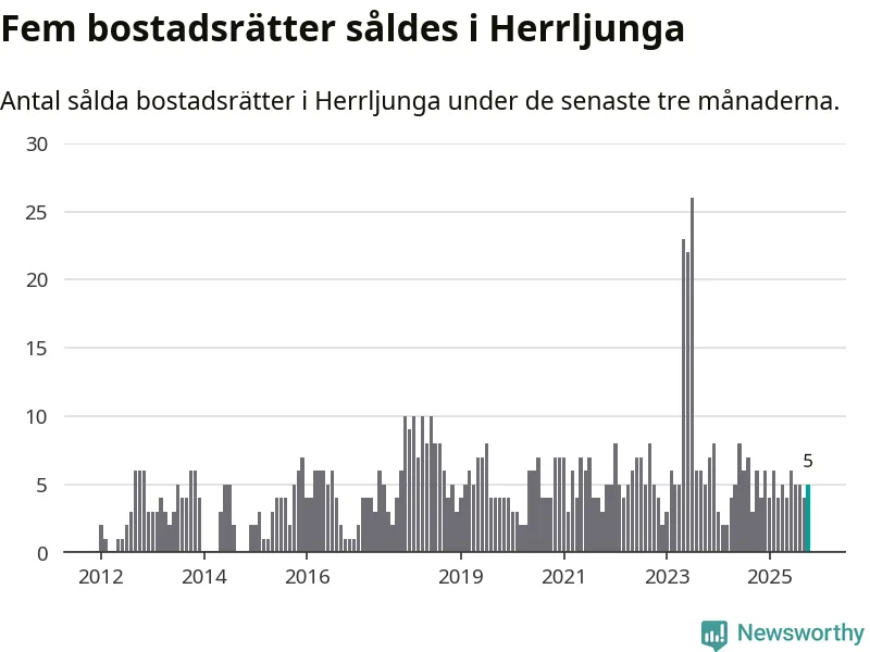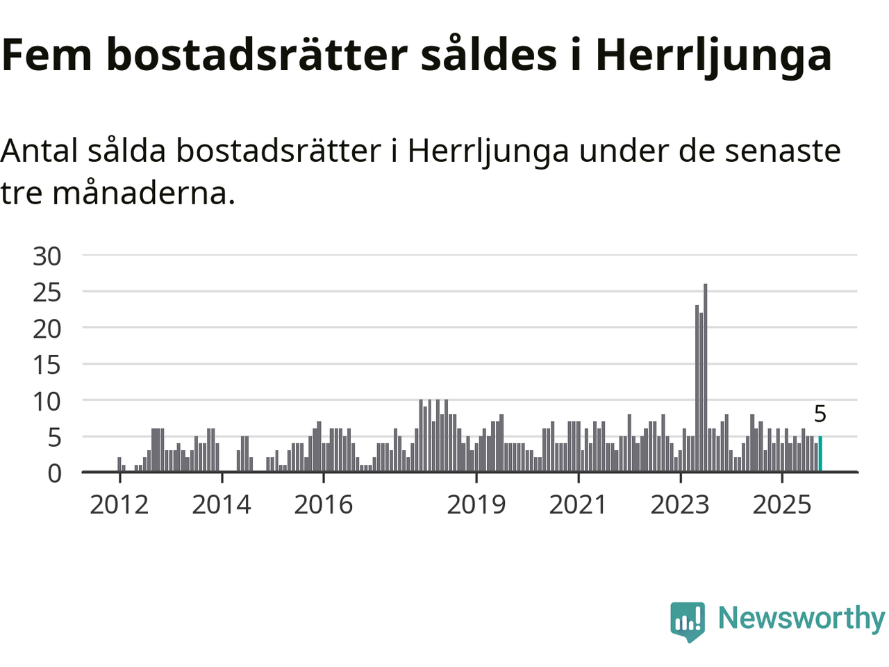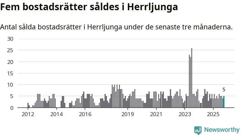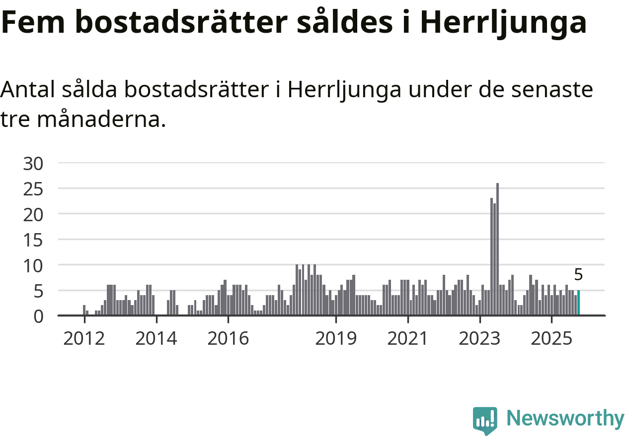 Mellan augusti och oktober gjordes sammanlagt fem affärer med bostadsrätter i Herrljunga kommun. Det kan jämföras med sex vid motsvarande tid i fjol.