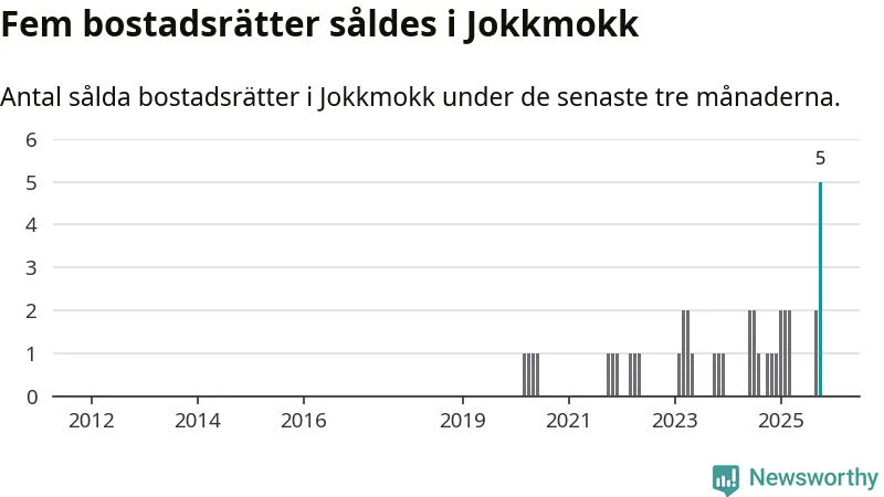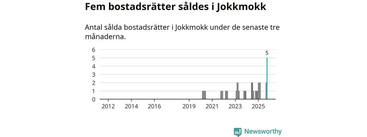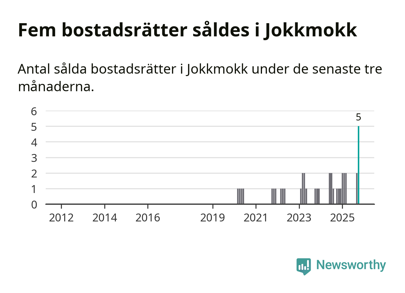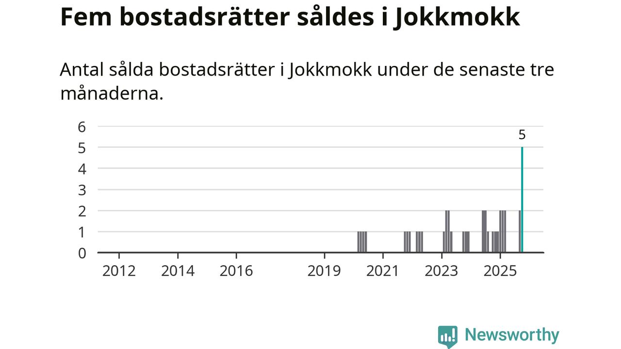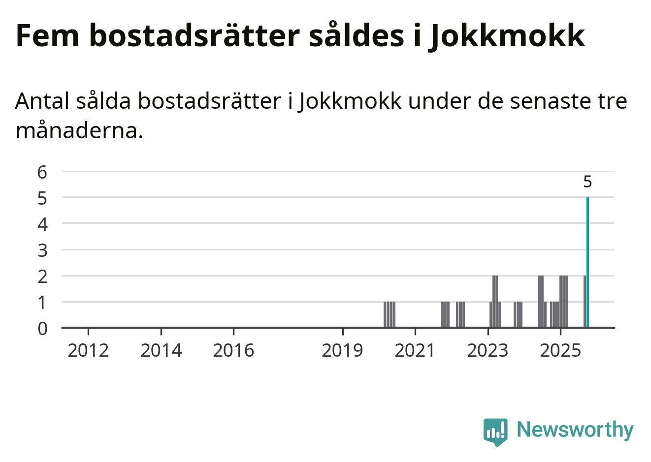 Mellan augusti och oktober gjordes sammanlagt fem affärer med bostadsrätter i Jokkmokks kommun. Det kan jämföras med ett vid motsvarande tid i fjol.
