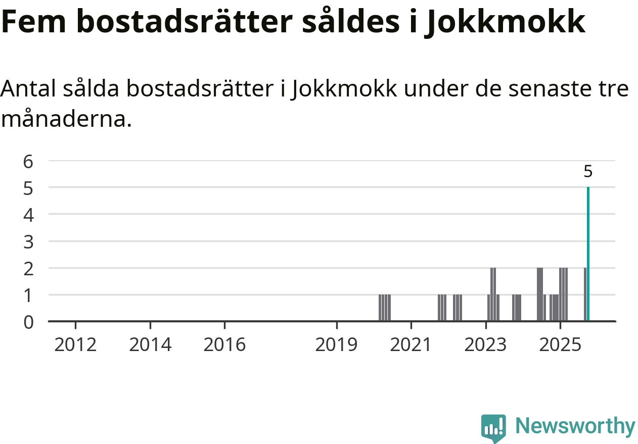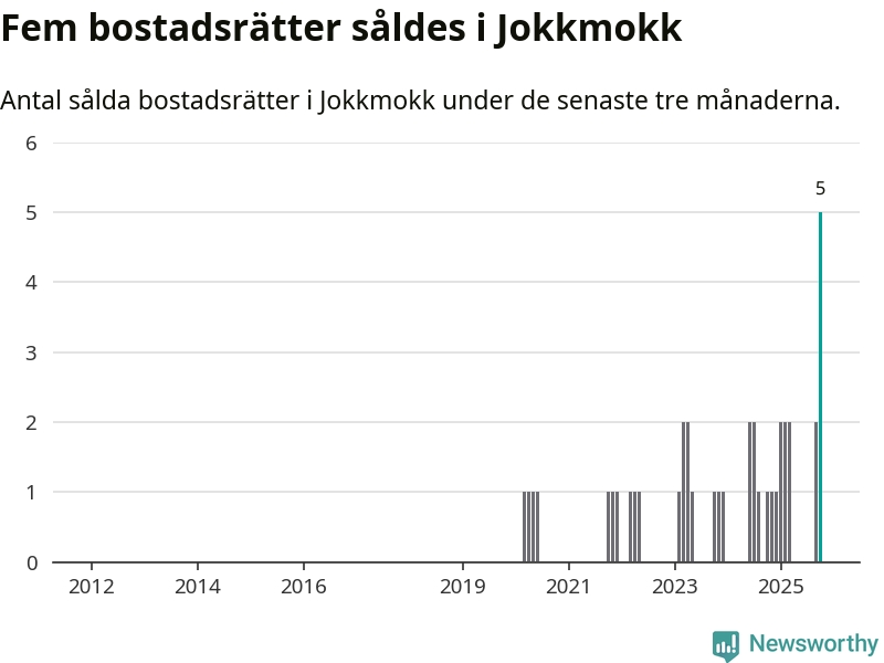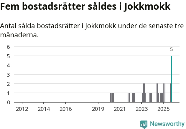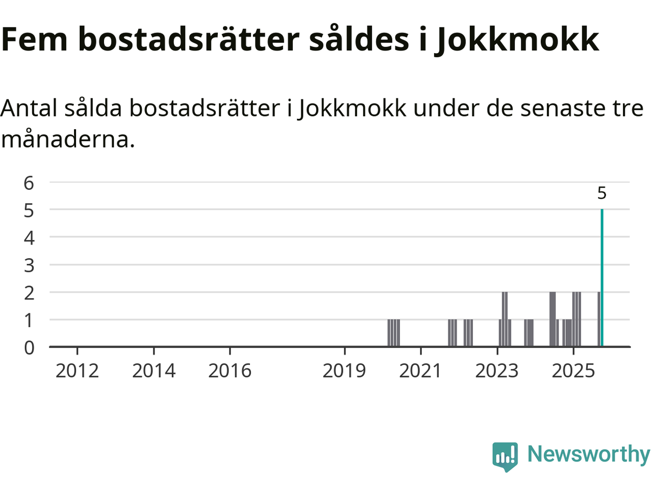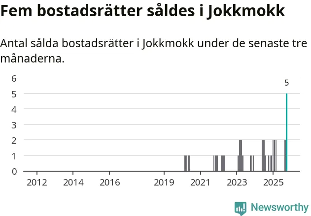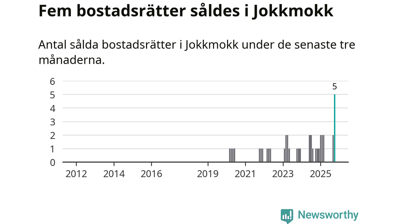 Mellan augusti och oktober gjordes sammanlagt fem affärer med bostadsrätter i Jokkmokks kommun. Det kan jämföras med ett vid motsvarande tid i fjol.
