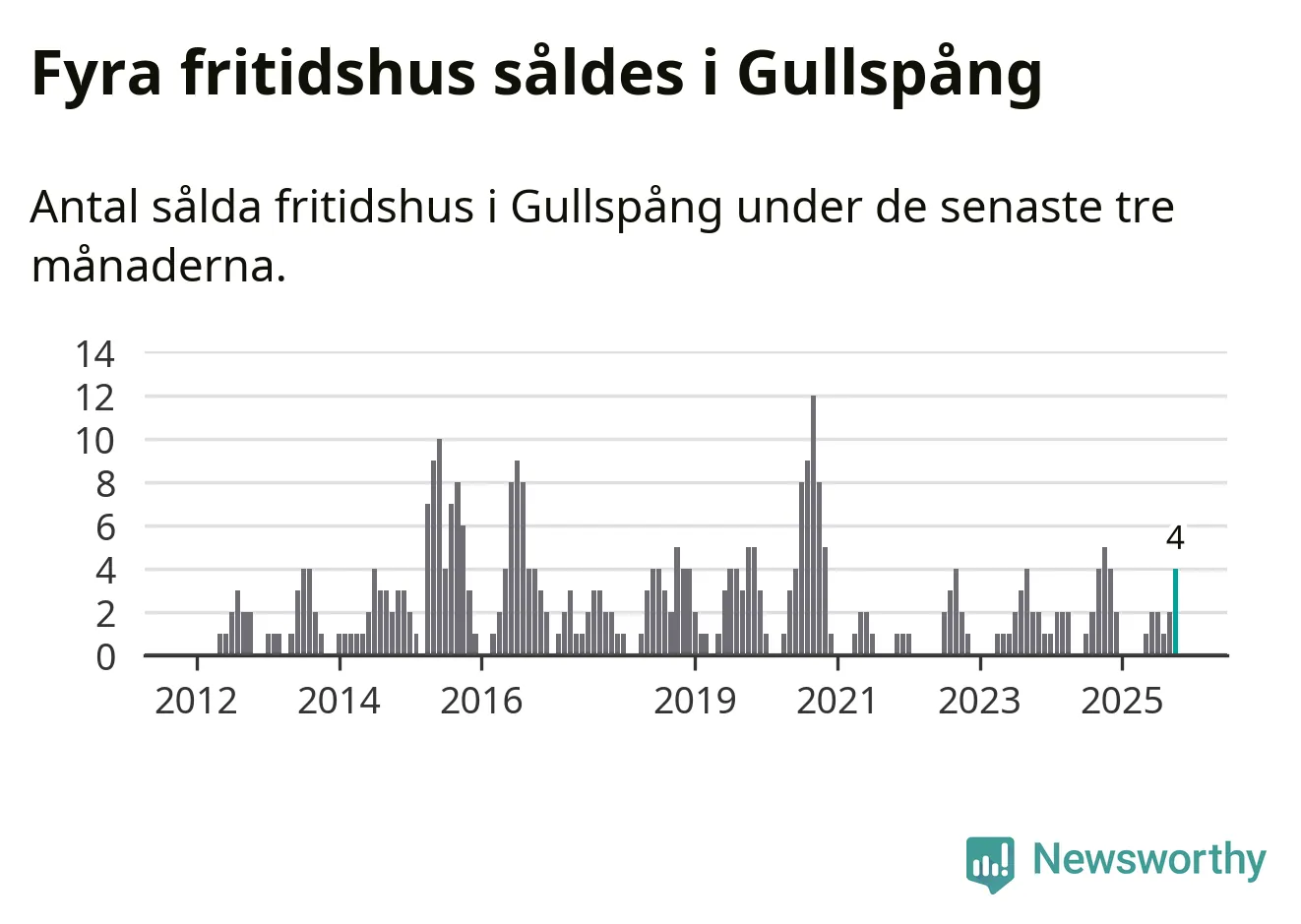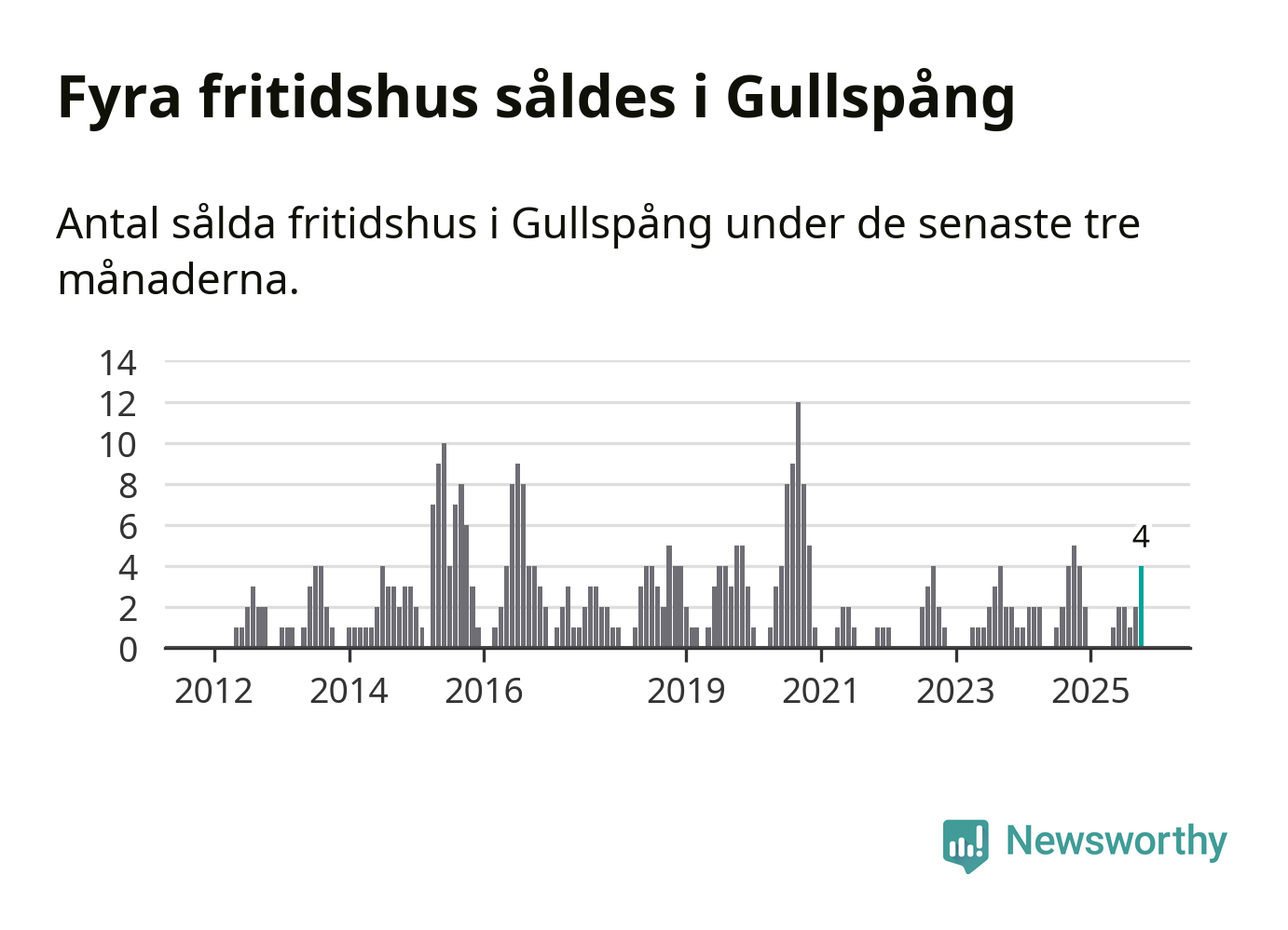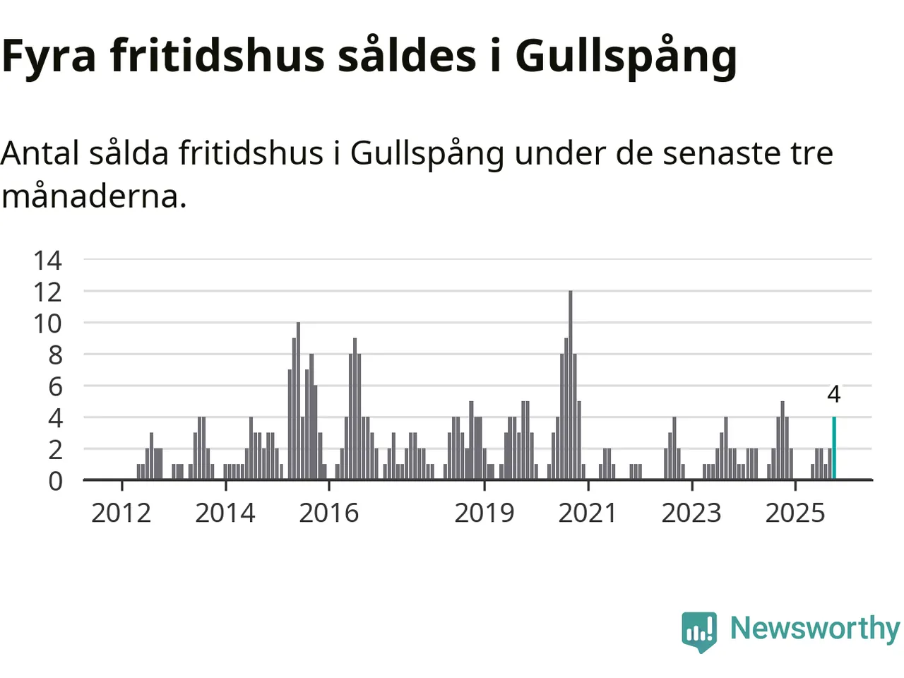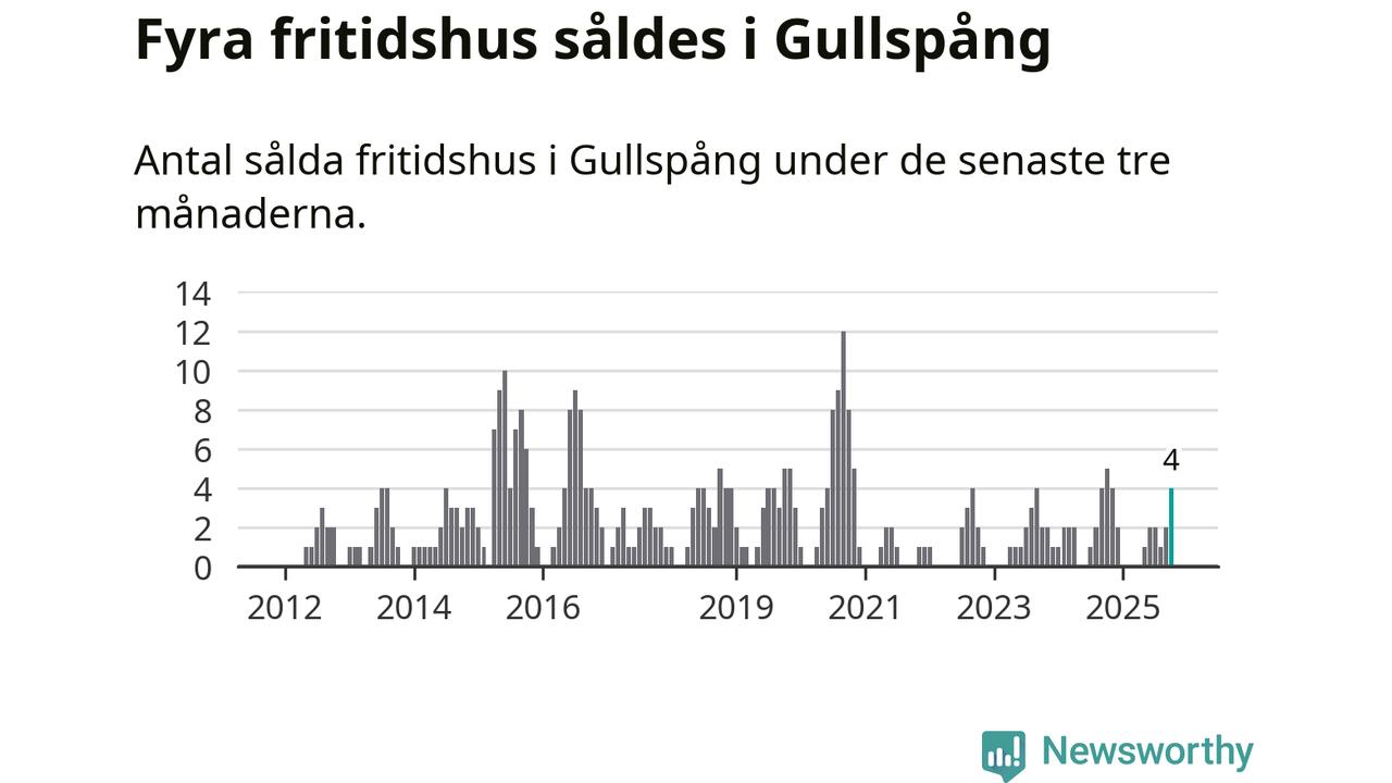 Mellan augusti och oktober gjordes sammanlagt fyra affärer med fritidshus i Gullspångs kommun. Det kan jämföras med fem vid motsvarande tid i fjol.