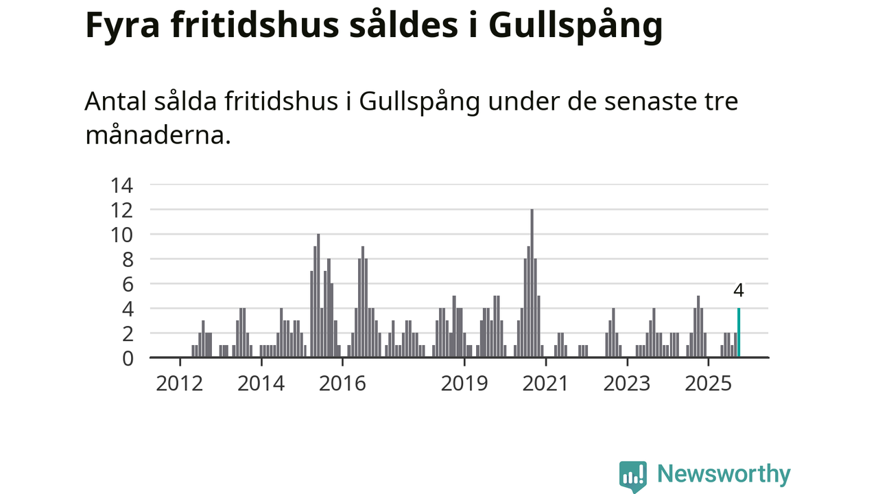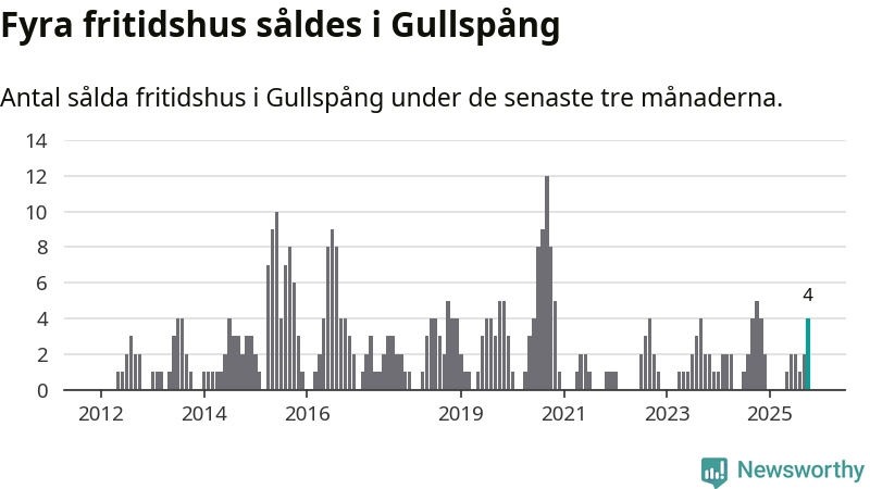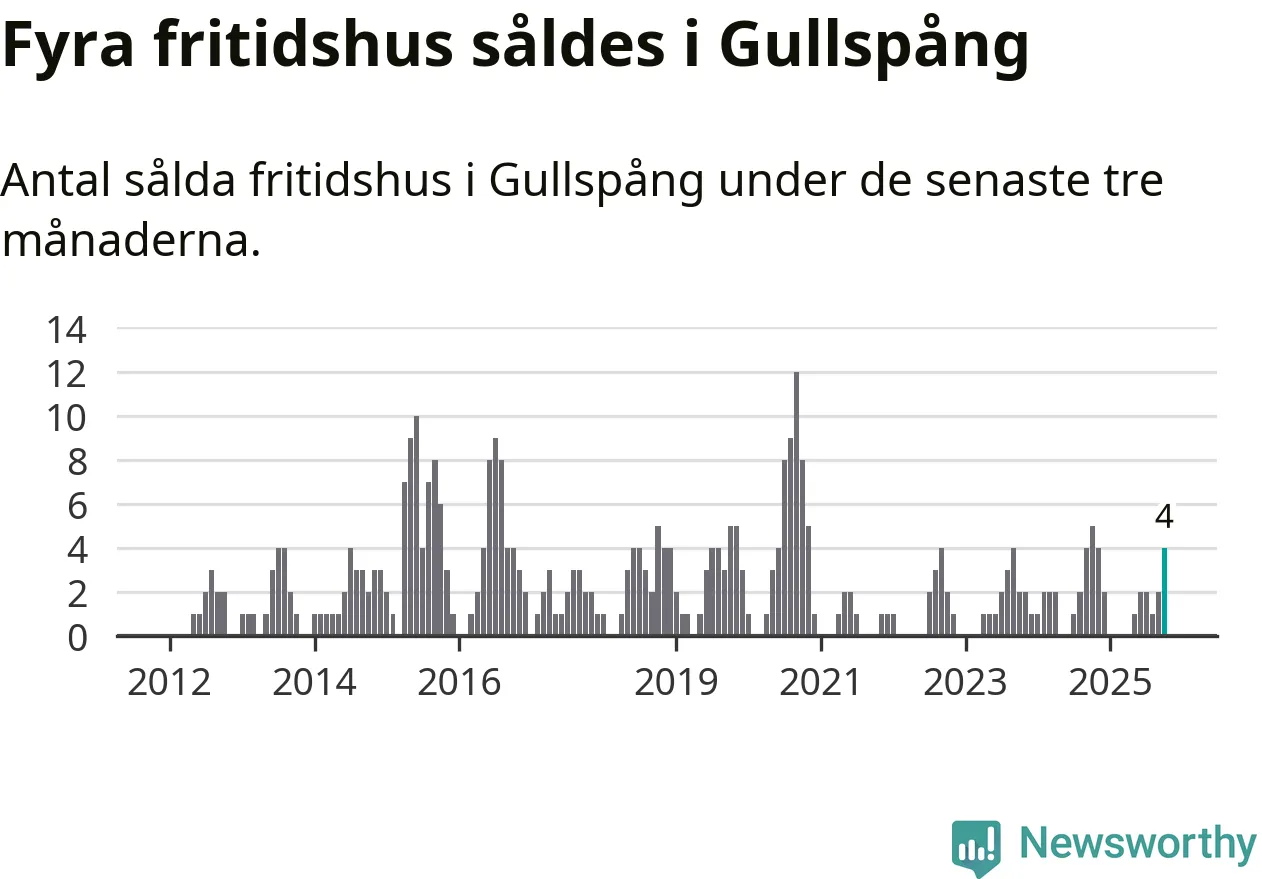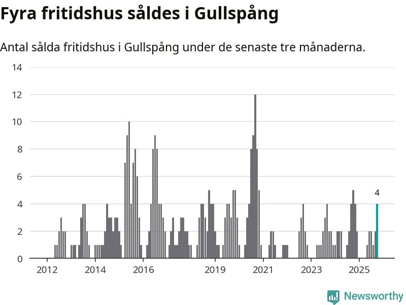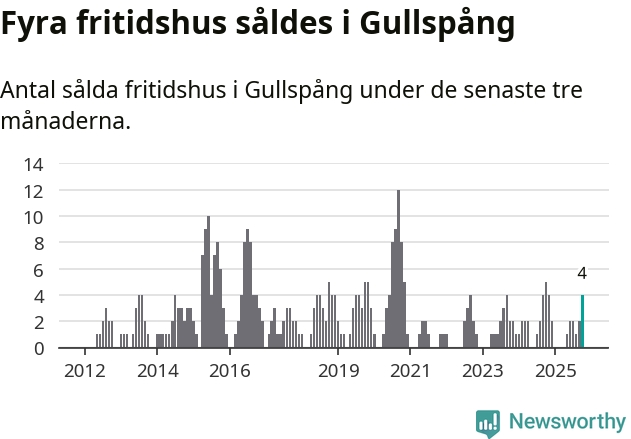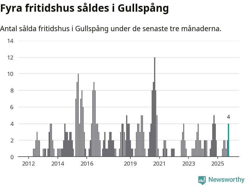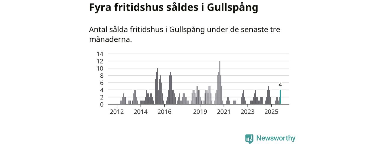 Mellan augusti och oktober gjordes sammanlagt fyra affärer med fritidshus i Gullspångs kommun. Det kan jämföras med fem vid motsvarande tid i fjol.