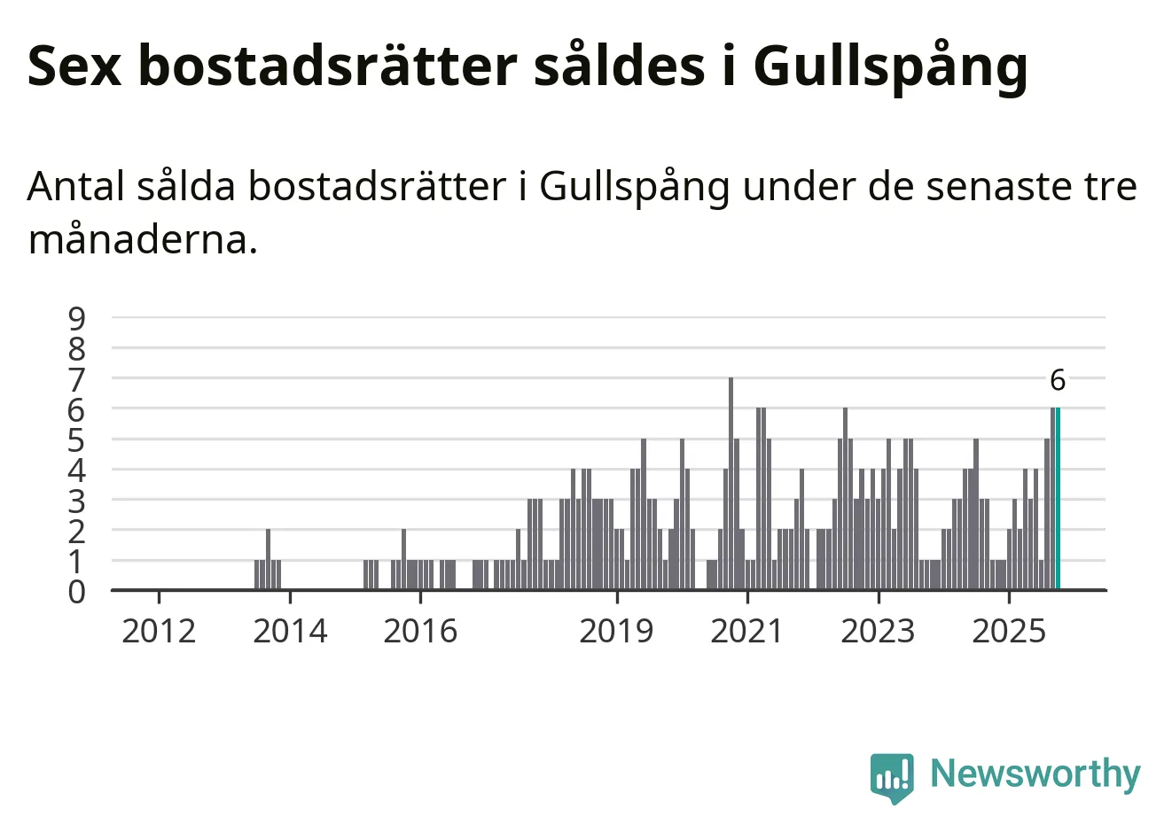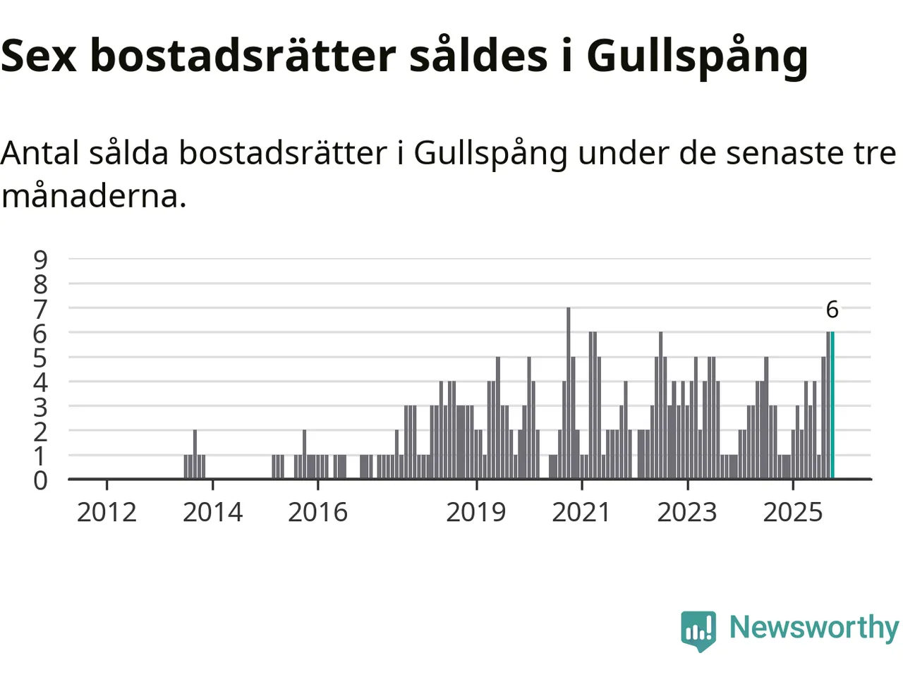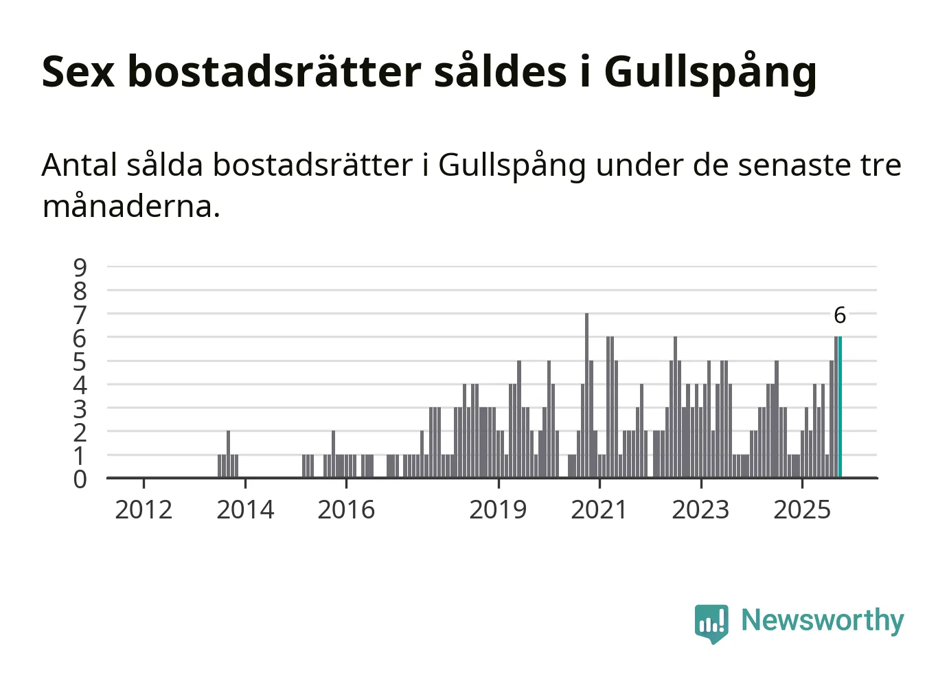 Mellan augusti och oktober gjordes sammanlagt sex affärer med bostadsrätter i Gullspångs kommun. Det kan jämföras med ett vid motsvarande tid i fjol.