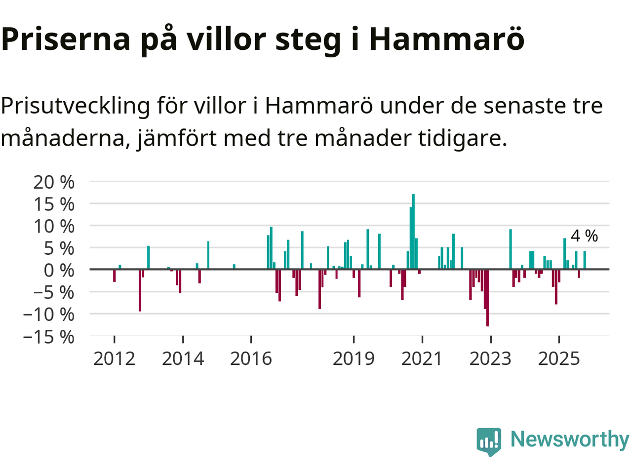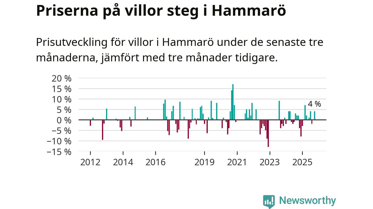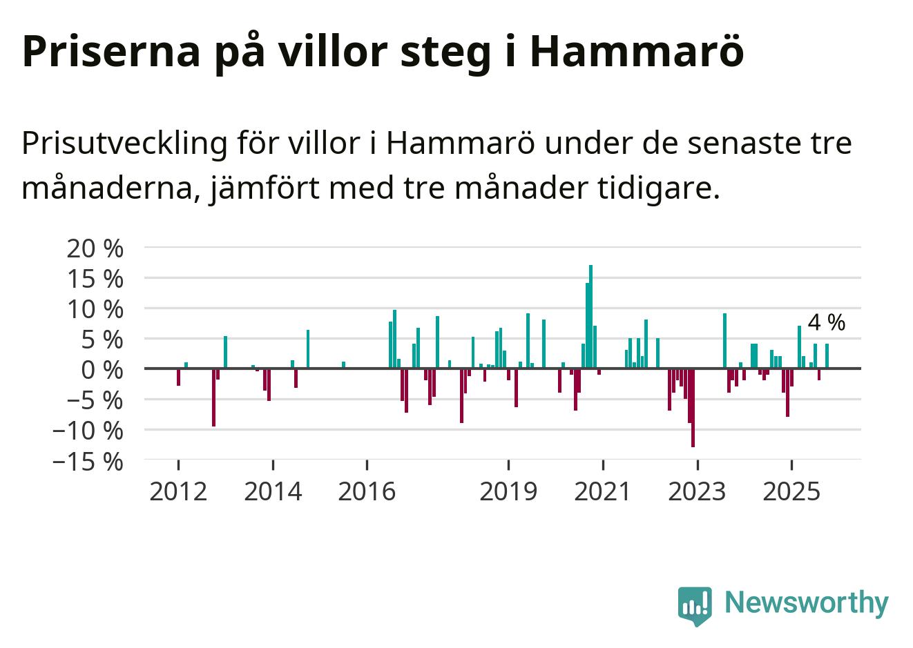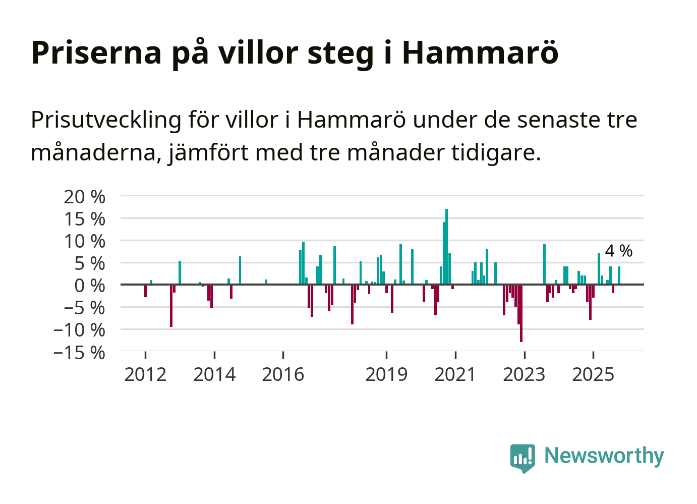 Statistiken visar även på en kännbar prisuppgång i Hammarö kommun. Medelpriset på försäljningarna av villor i kommunen var 4 procent högre än för tre månader sedan. I hela Värmland däremot sjunker villapriserna. I hela länet noterades en prisnedgång på 1 procent.