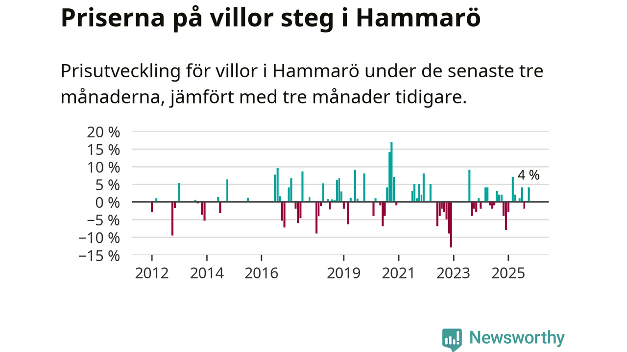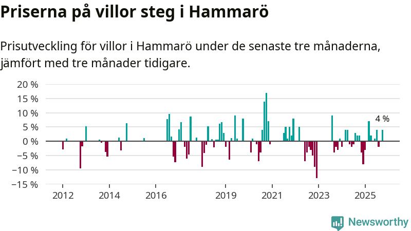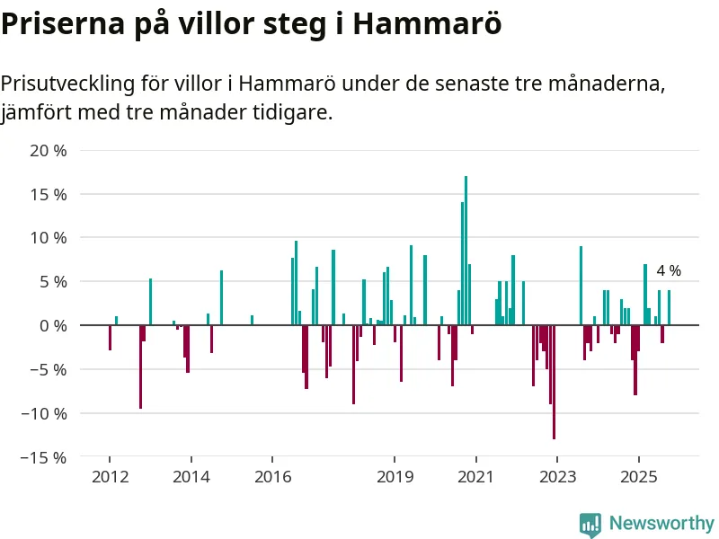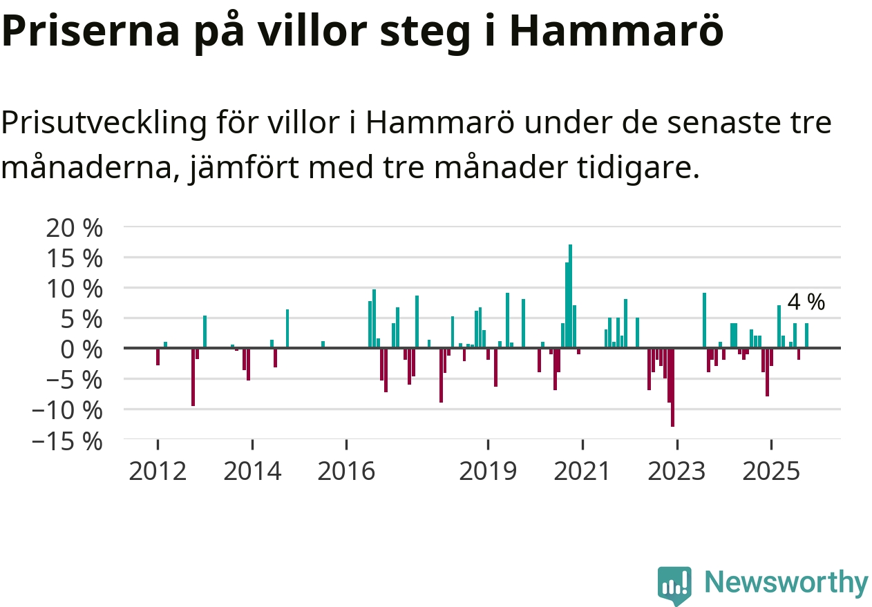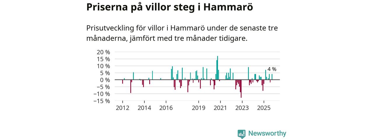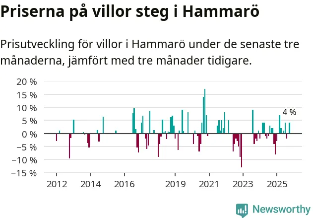 Statistiken visar även på en kännbar prisuppgång i Hammarö kommun. Medelpriset på försäljningarna av villor i kommunen var 4 procent högre än för tre månader sedan. I hela Värmland däremot sjunker villapriserna. I hela länet noterades en prisnedgång på 1 procent.