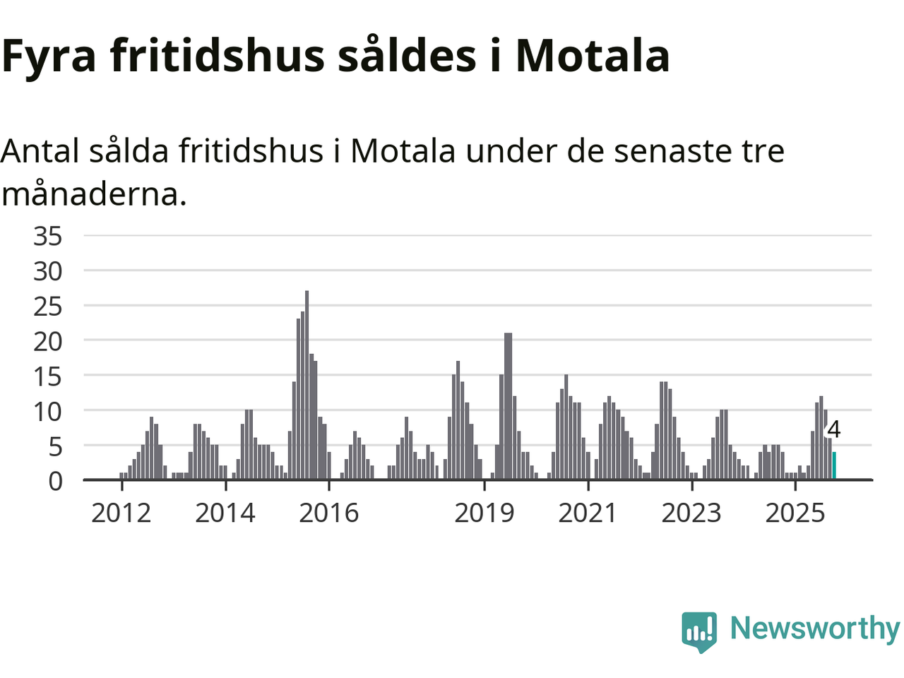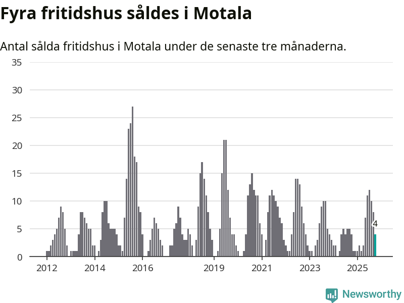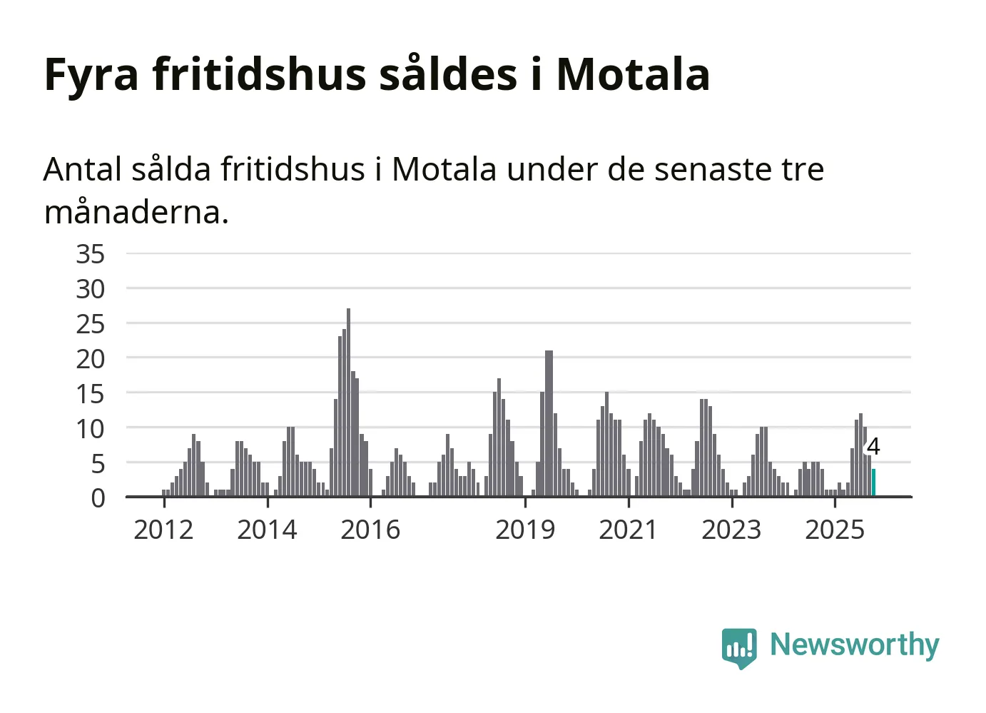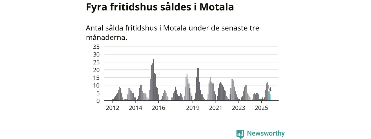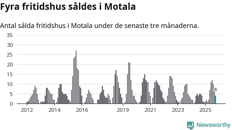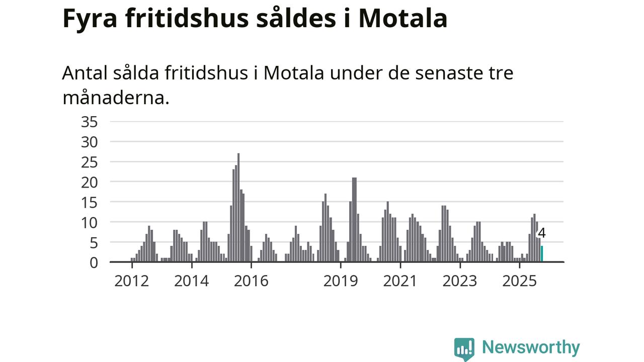Mellan augusti och oktober gjordes sammanlagt fyra affärer med fritidshus i Motala kommun. Det är lika många affärer som vid motsvarande tid i fjol.